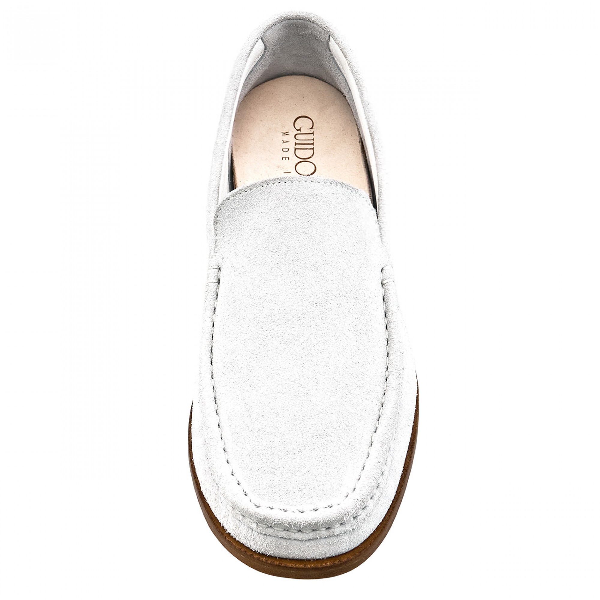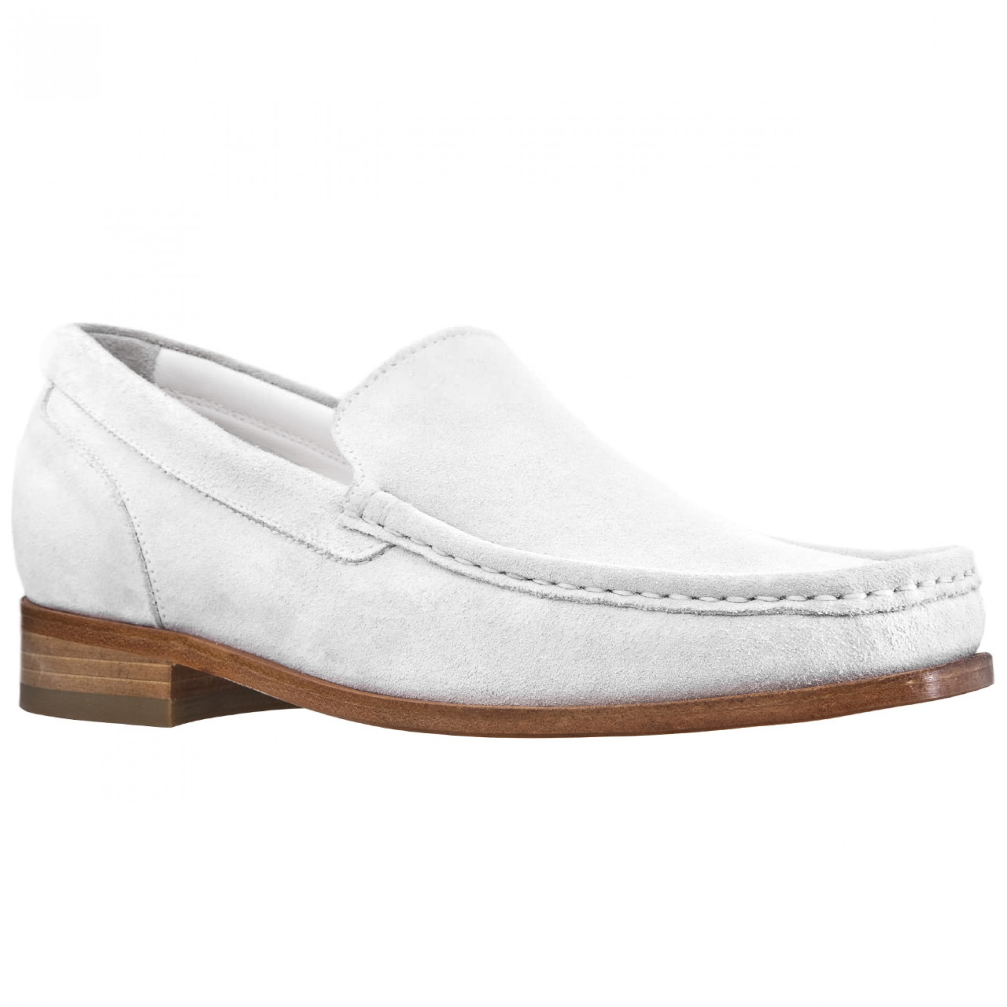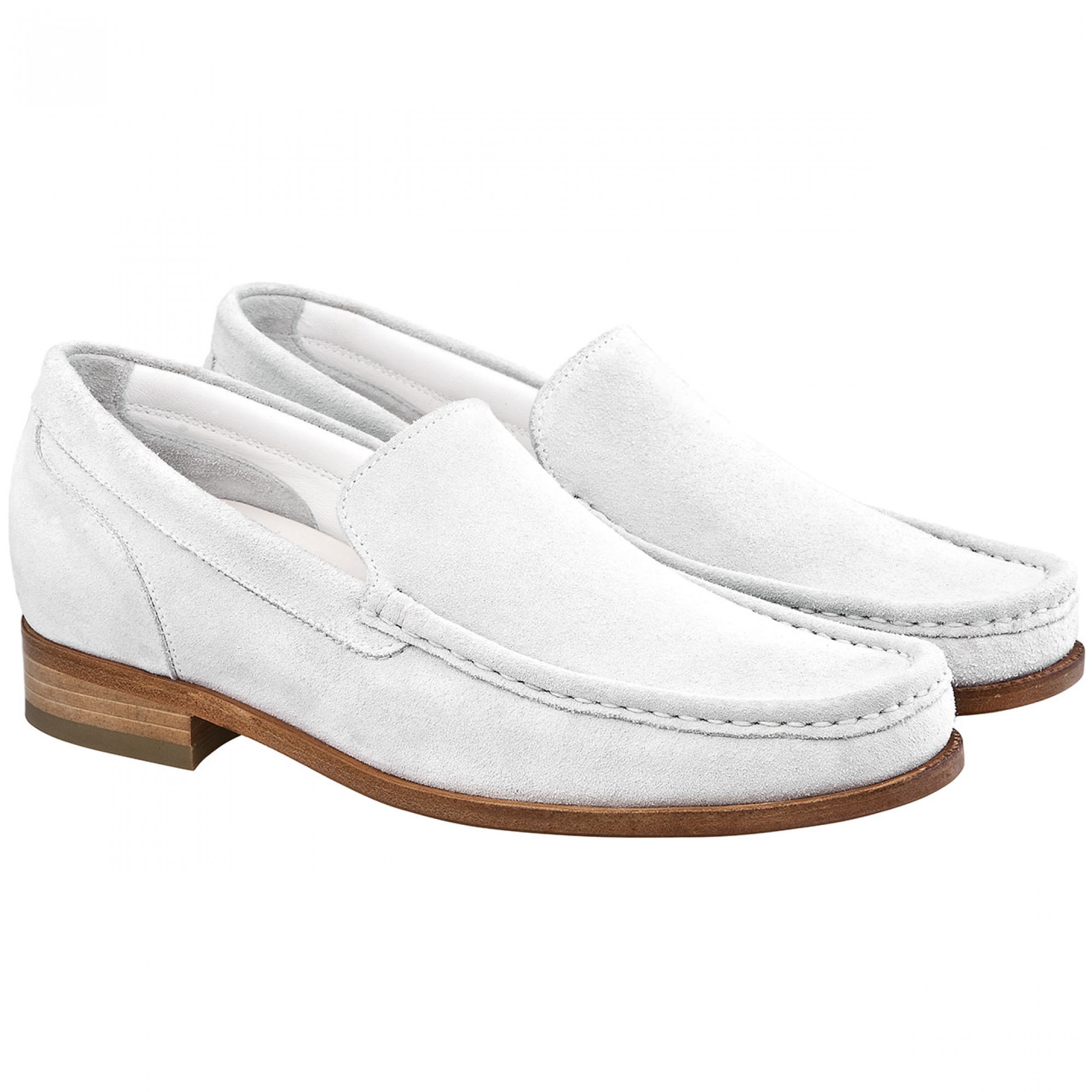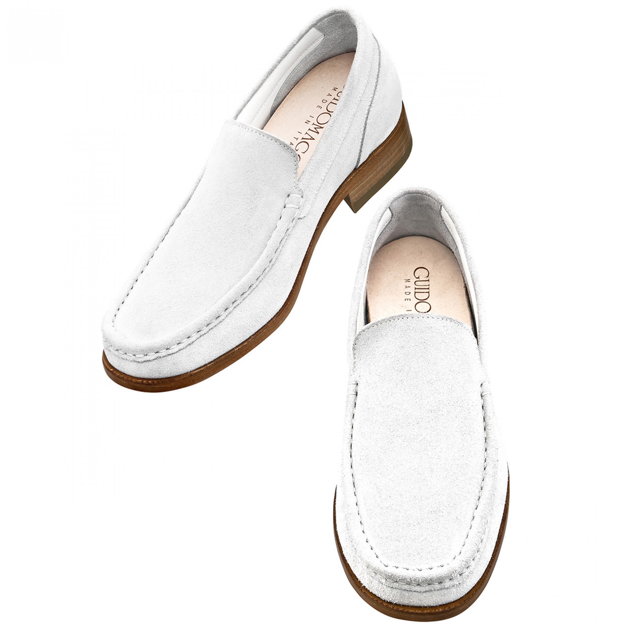 Upper in white suede calf leather. Upper leather, outsole and midsole are sewn at sight. Insole and midsole in genuine leather. Leather heel with special anti-slip rubber. Handcrafted leather outsole with special anti-slip. Height increase: 2.6 in(6.5cm). Hand Made in Italy