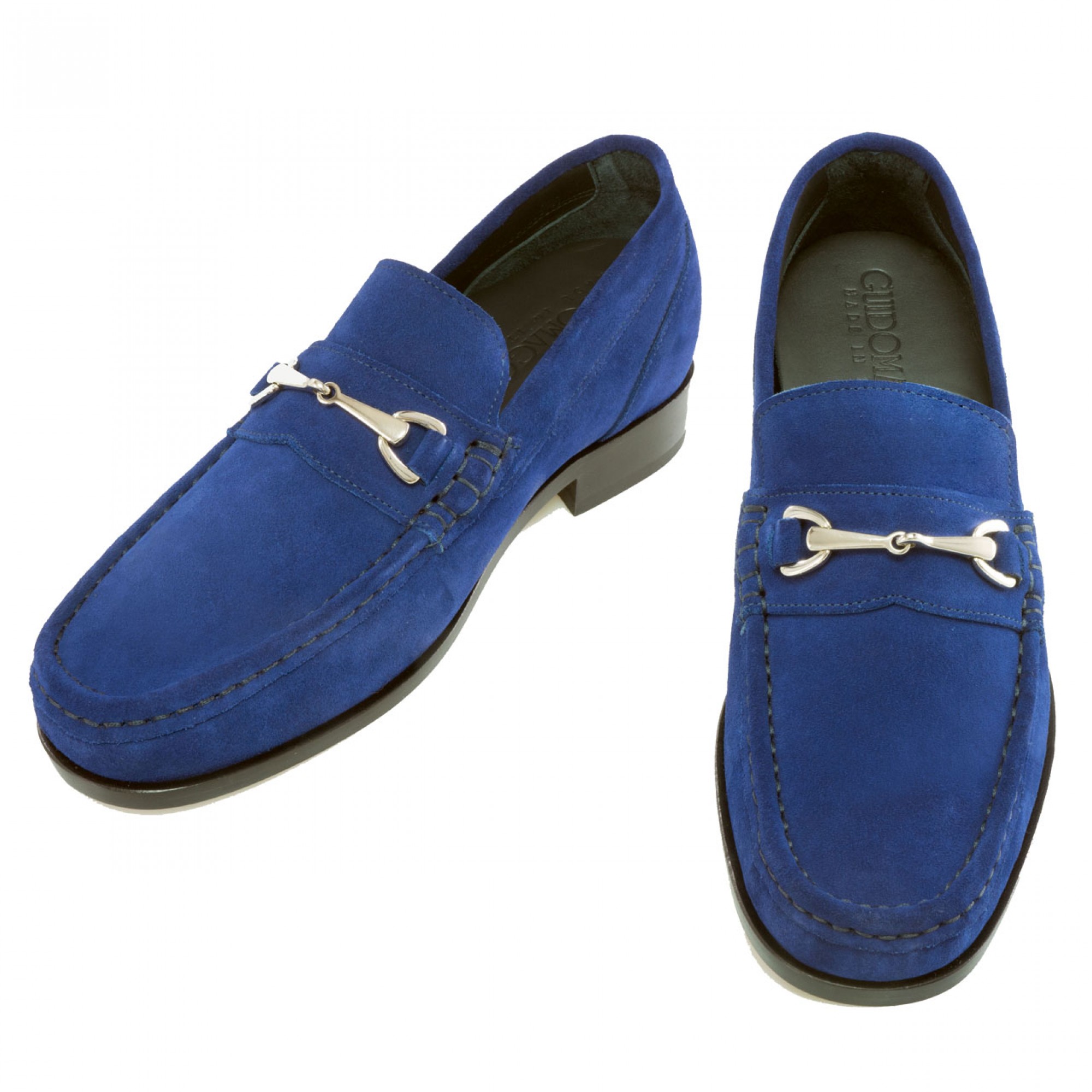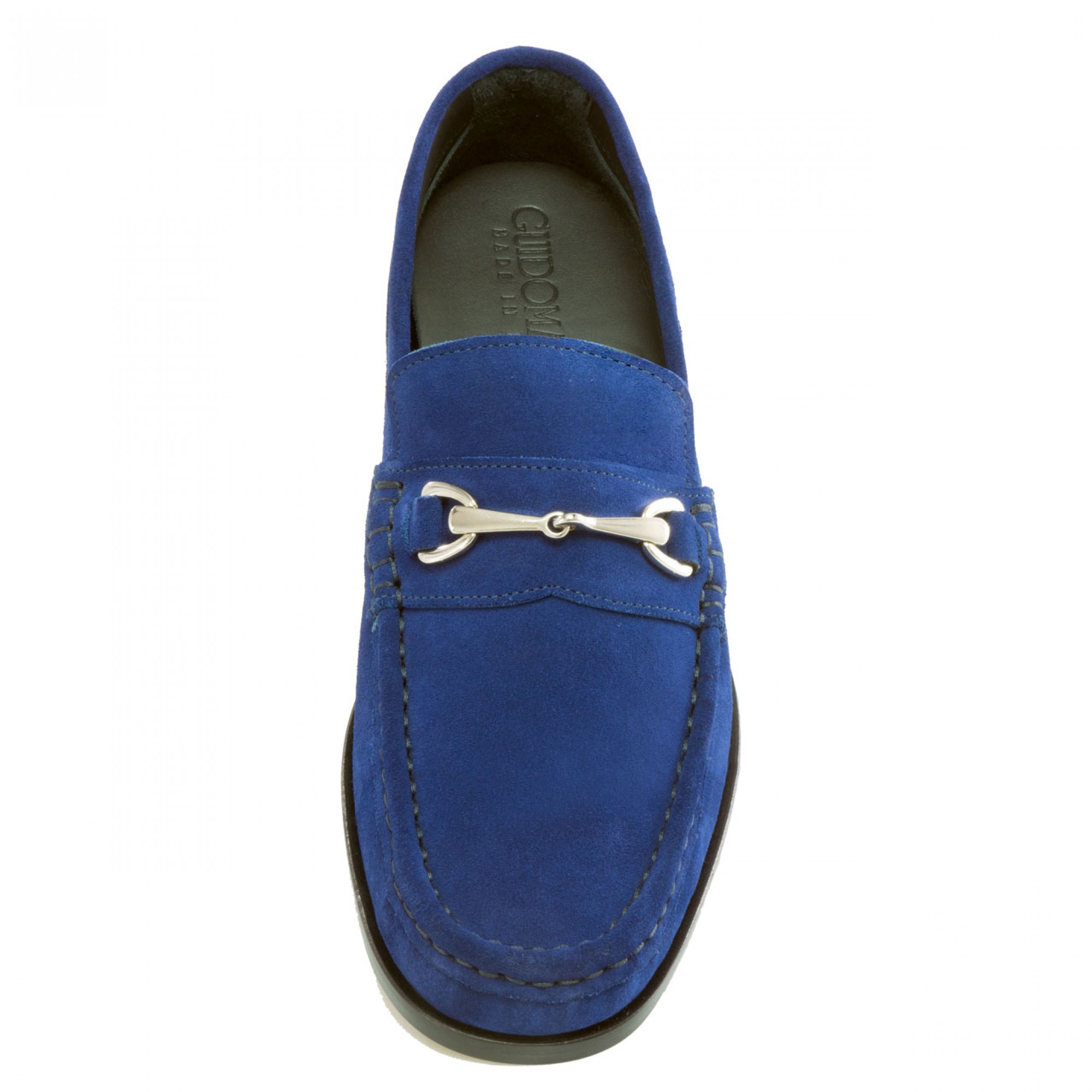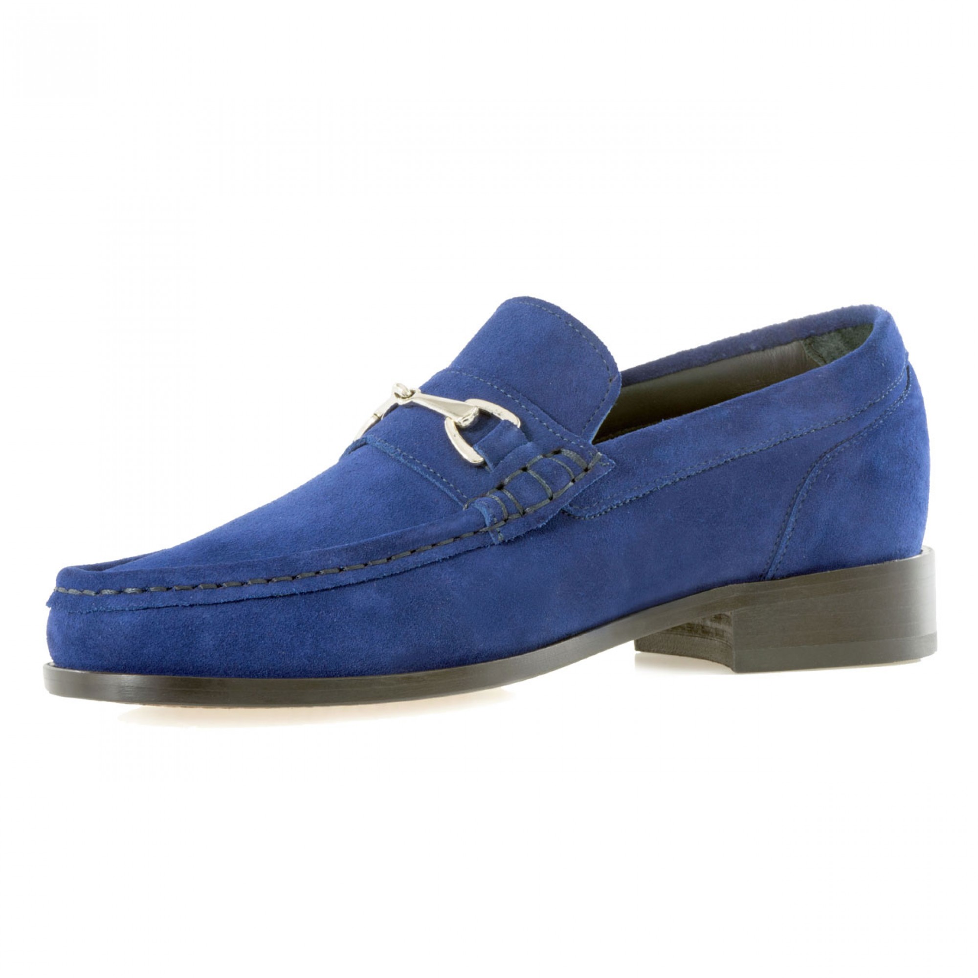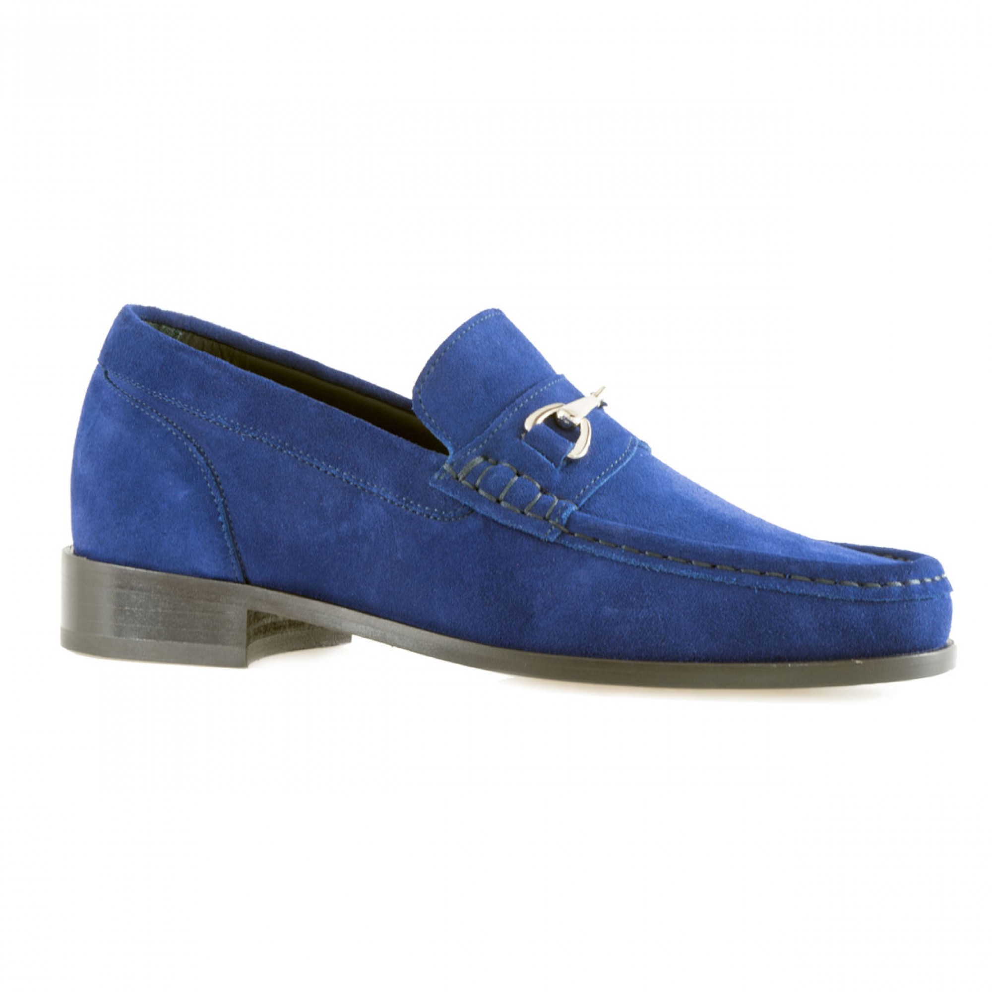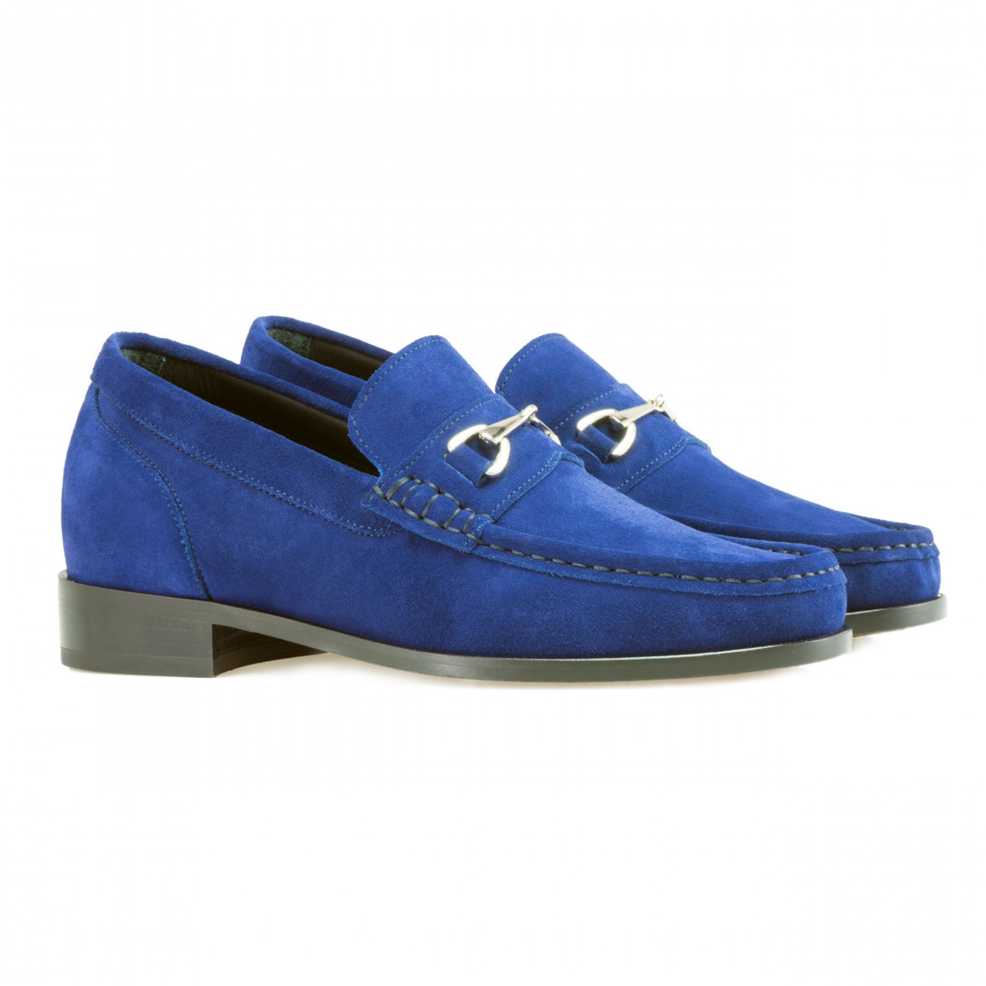 Elegant elevator loafers handcrafted in Italy with upper in blue suede leather, embellished with a stylish metal clamp. The hand-sewn sole is made of leather.