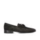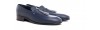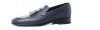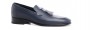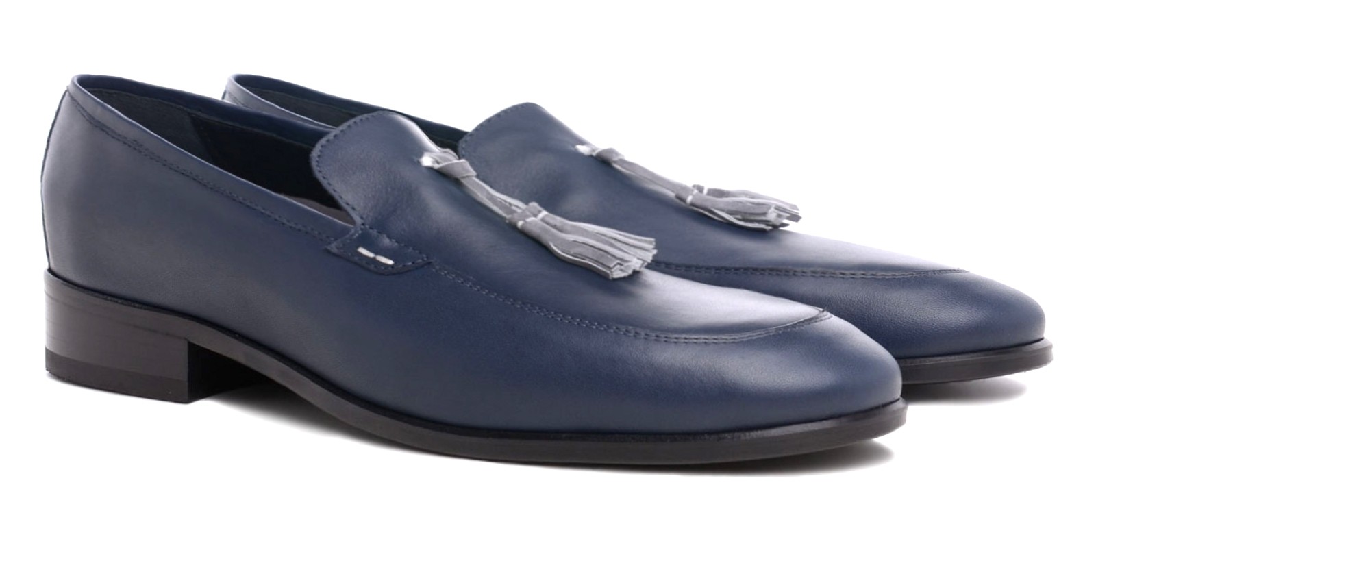 Chic and versatile elevator loafers with upper in blue calf leather, enriched with elegant tassels in gray full grain leather and stiched leather sole with anti slip rubber.
