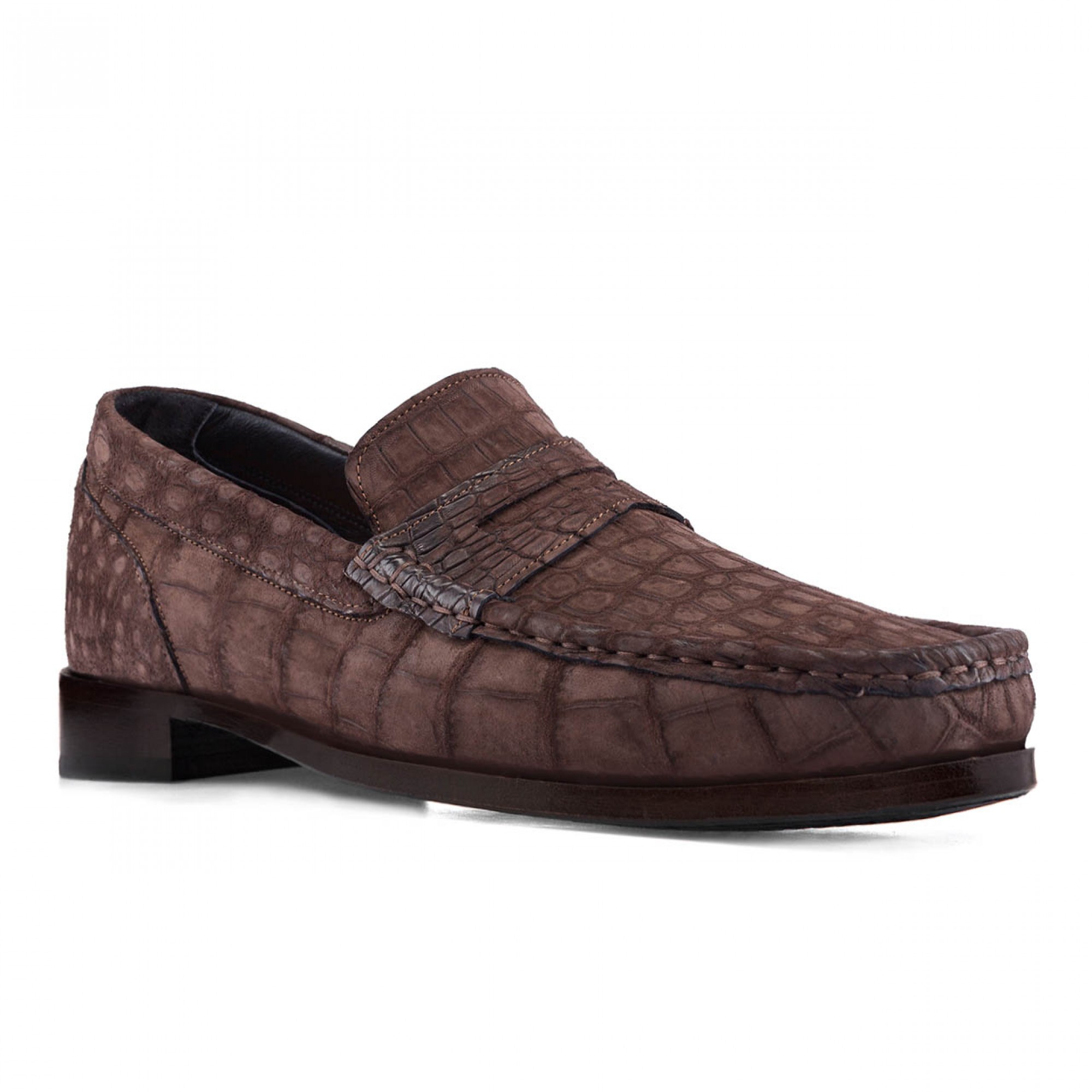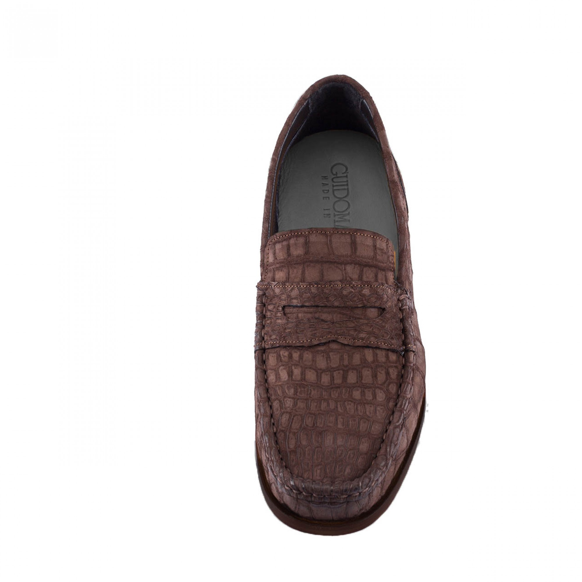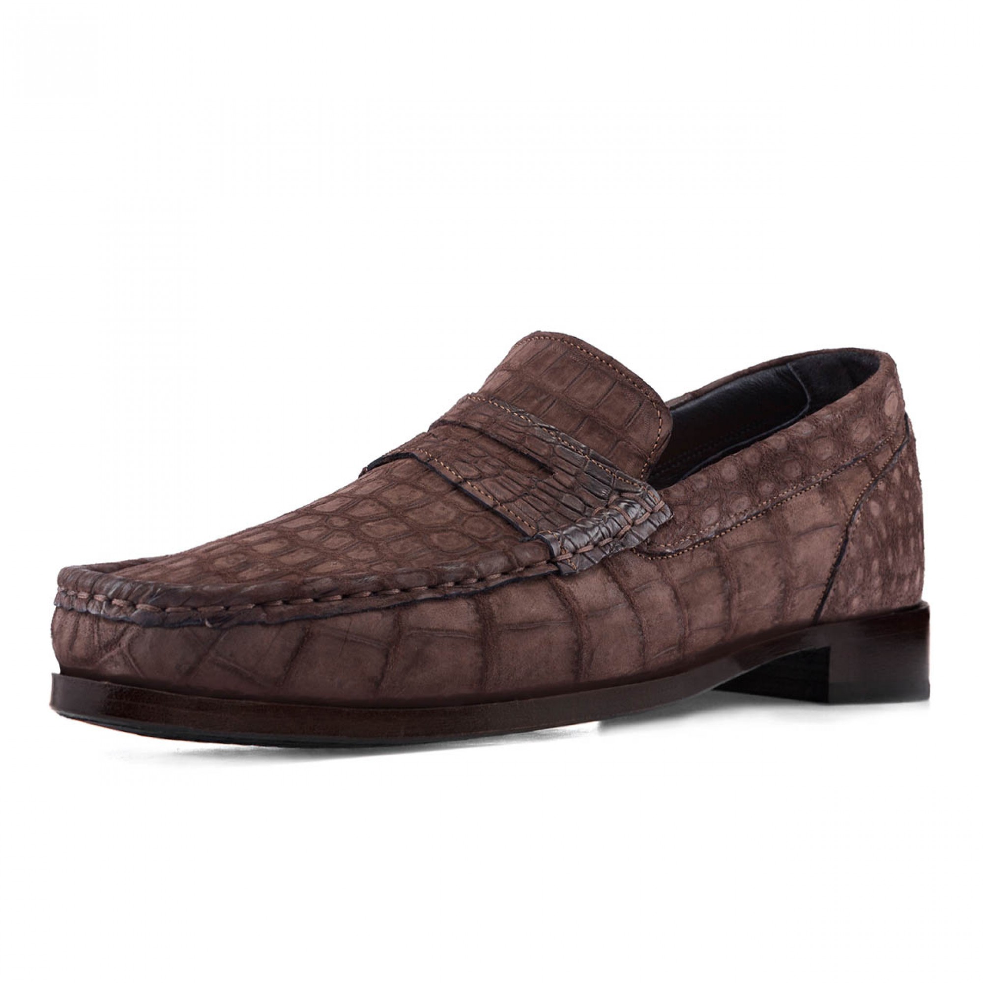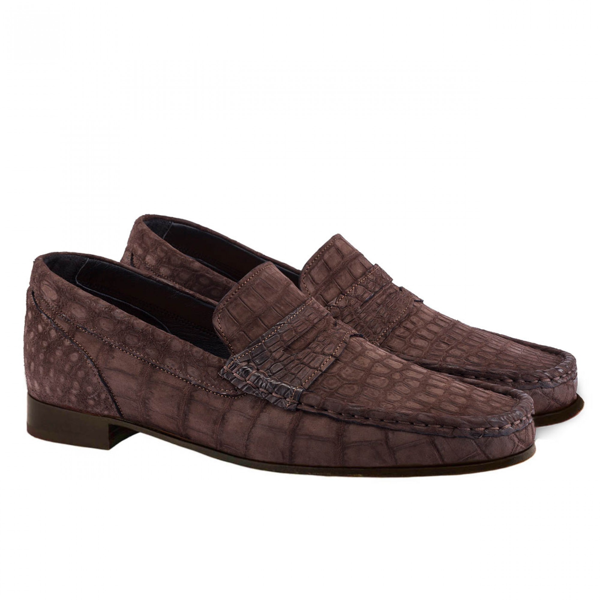 Exclusive handcrafted elevator loafer, with velvety upper in Nabuk Crocodile leather and dark brown sole in genuine leather.