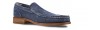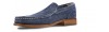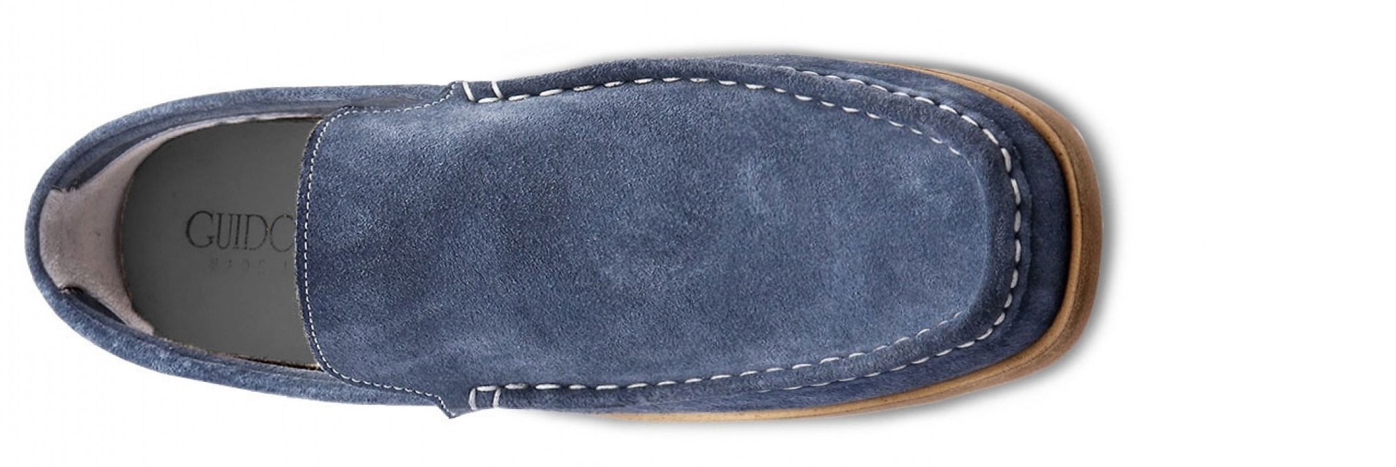 Upper in blue délavé suede calf leather. Upper leather, outsole and midsole are sewn at sight. Insole and midsole in genuine leather. Leather heel with special anti-slip rubber. Handcrafted leather outsole with special anti-slip. Height increase: 2.6 in(6.5cm). Hand Made in Italy