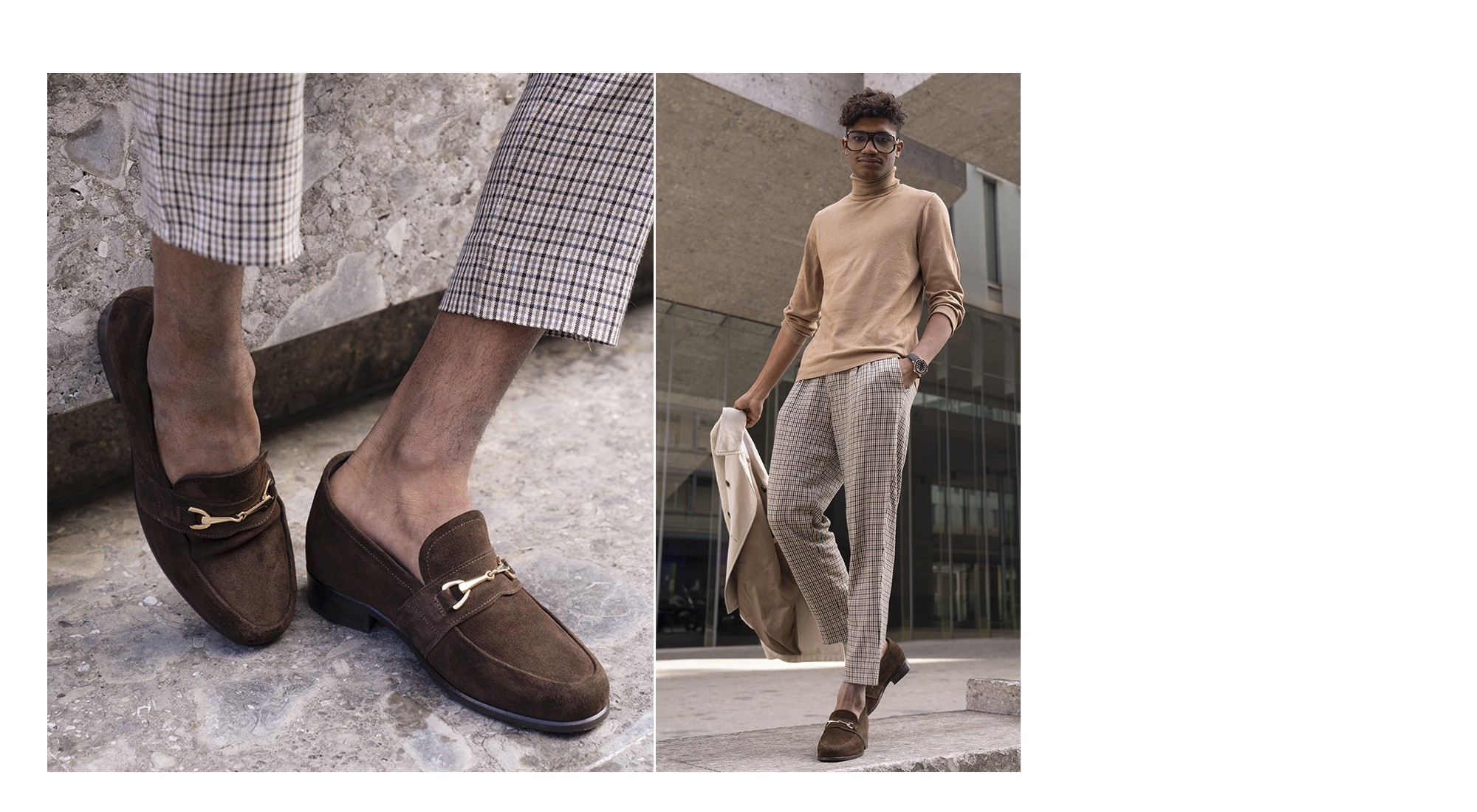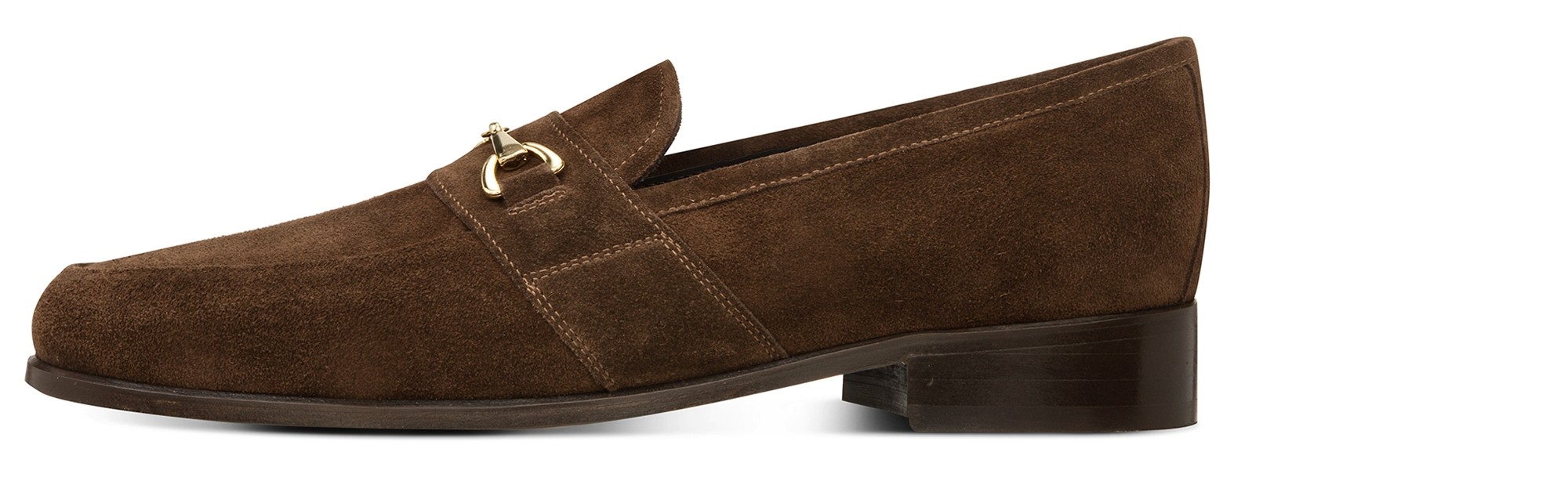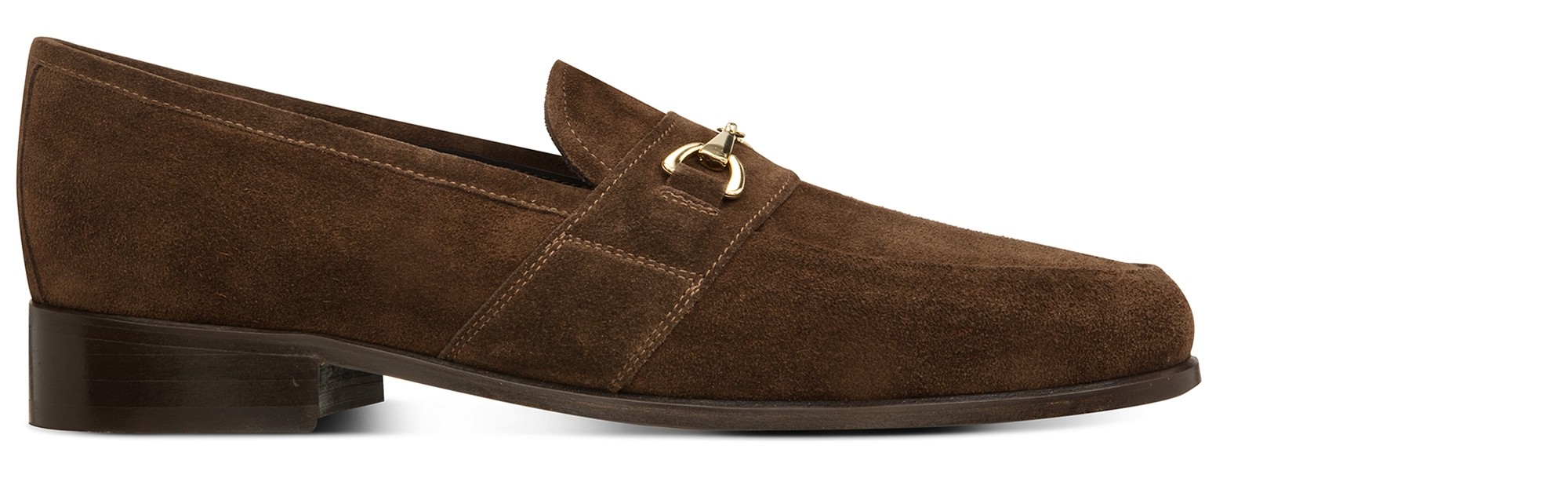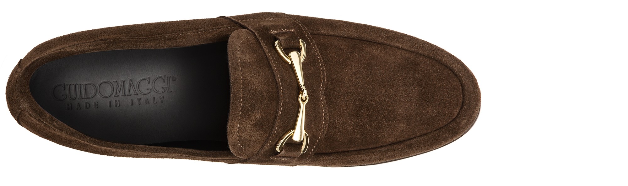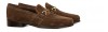 Stylish loafers with 2.6 inches (6.5 cm) elevator system in brown suede and elegant golden clamp.