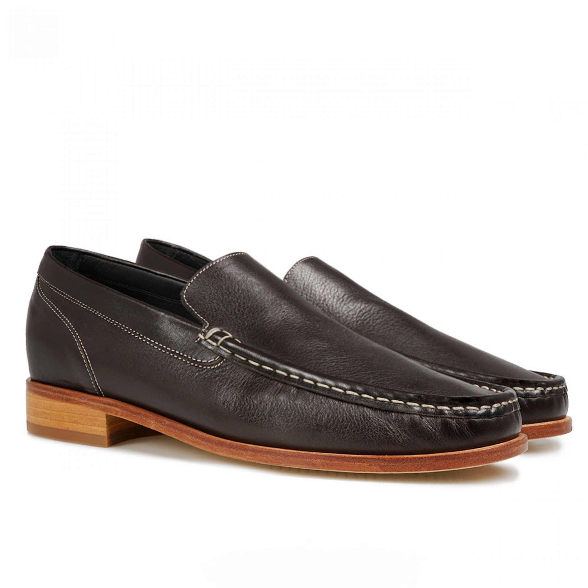 Elegant elevator loafers in dark brown calf leather with handmade stitching on the upper featuring a refined chromatic contrast. The sole in natural leather is stitched at sight.