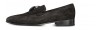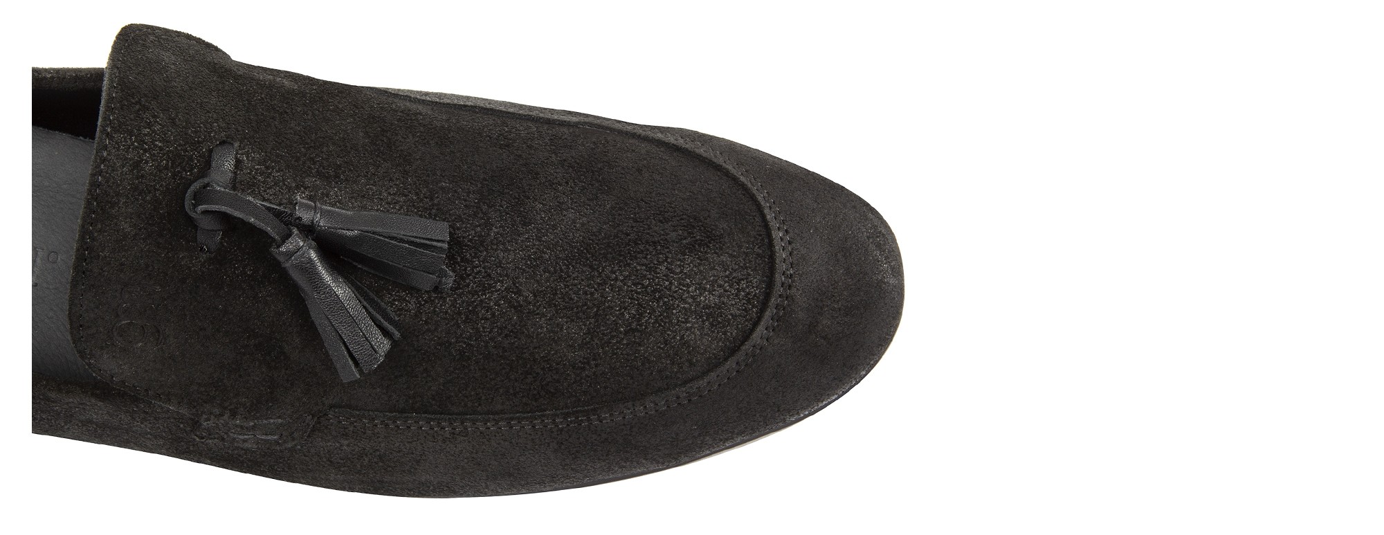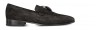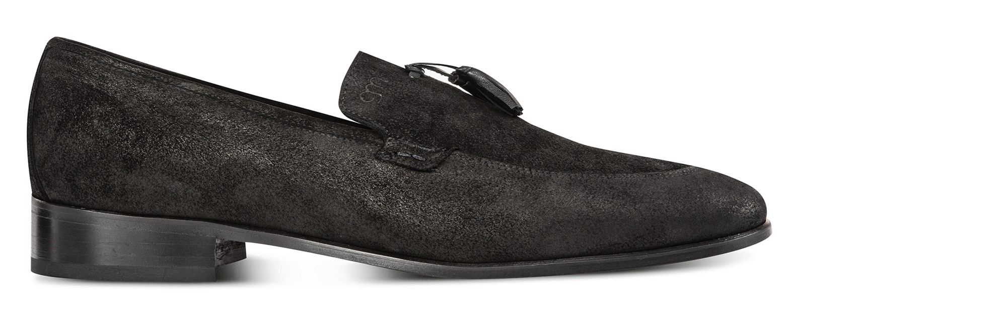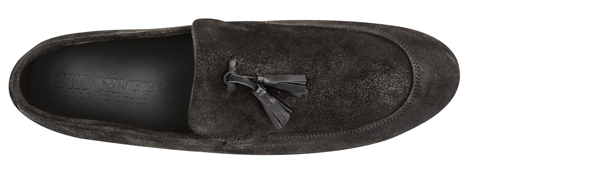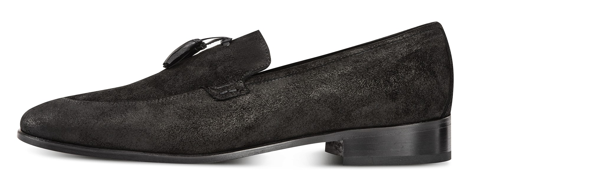 Handcrafted elevator loafer with upper in black waxed calfskin and elegant tassels in full grain leather. The outsole is assembled and sewn at sight.