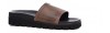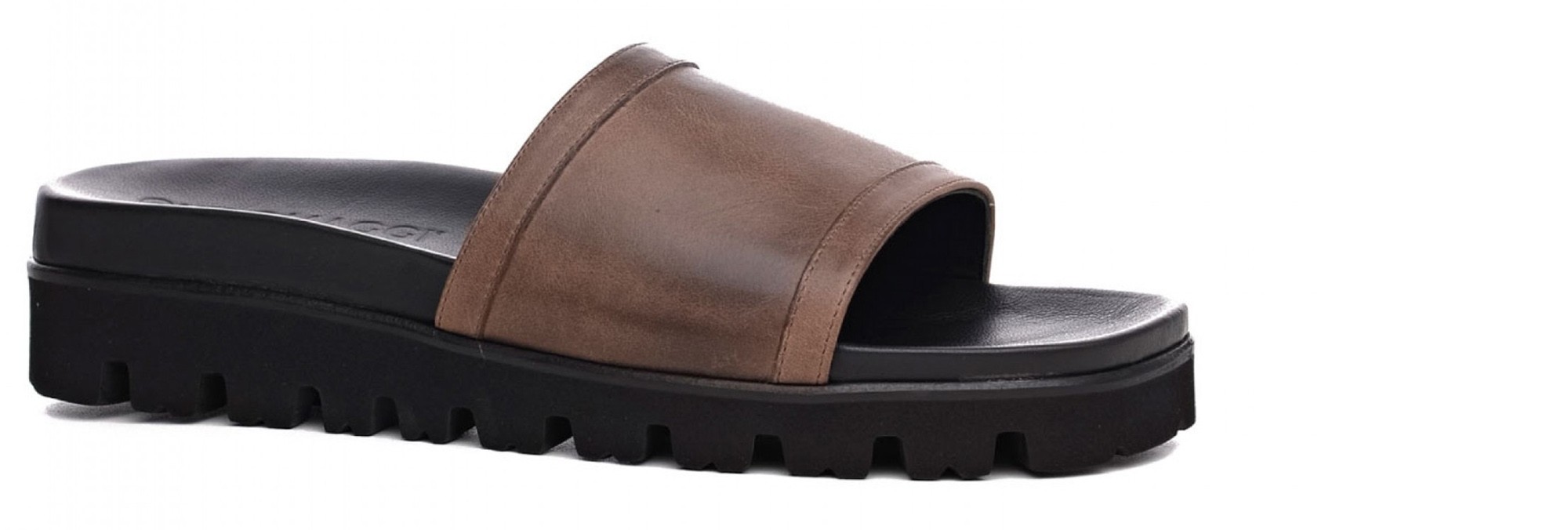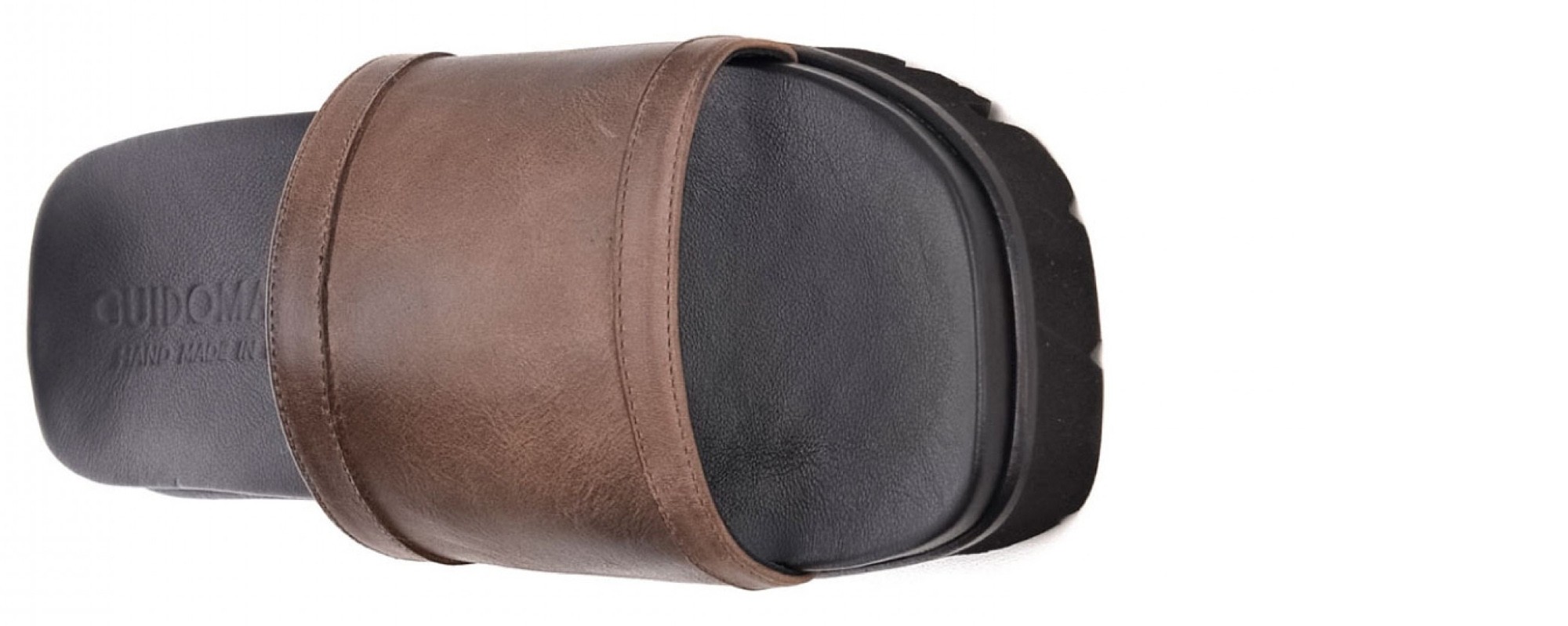 Height increasing sandals in waxed calf leather featuring a particular brown texture, super light rubber sole and comfortable leather insole.