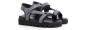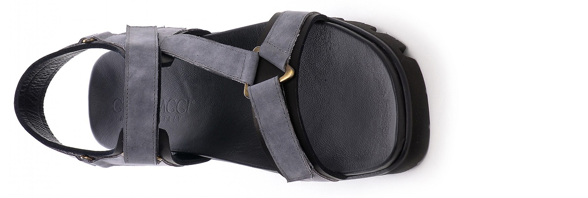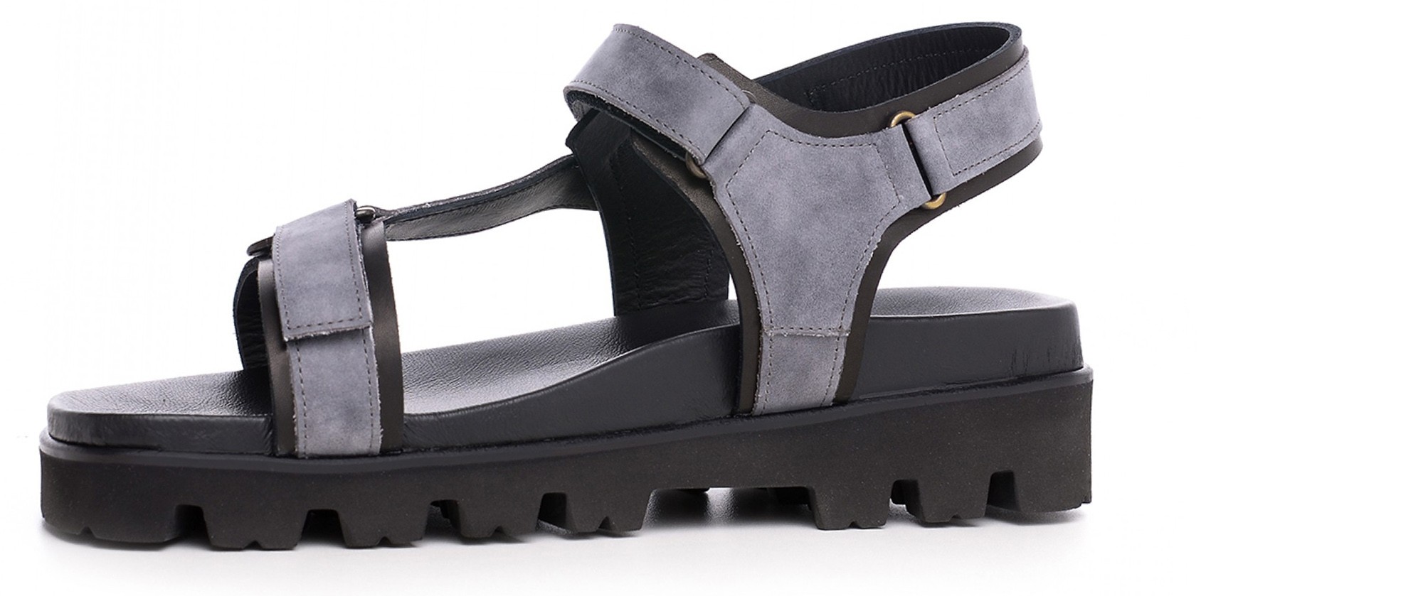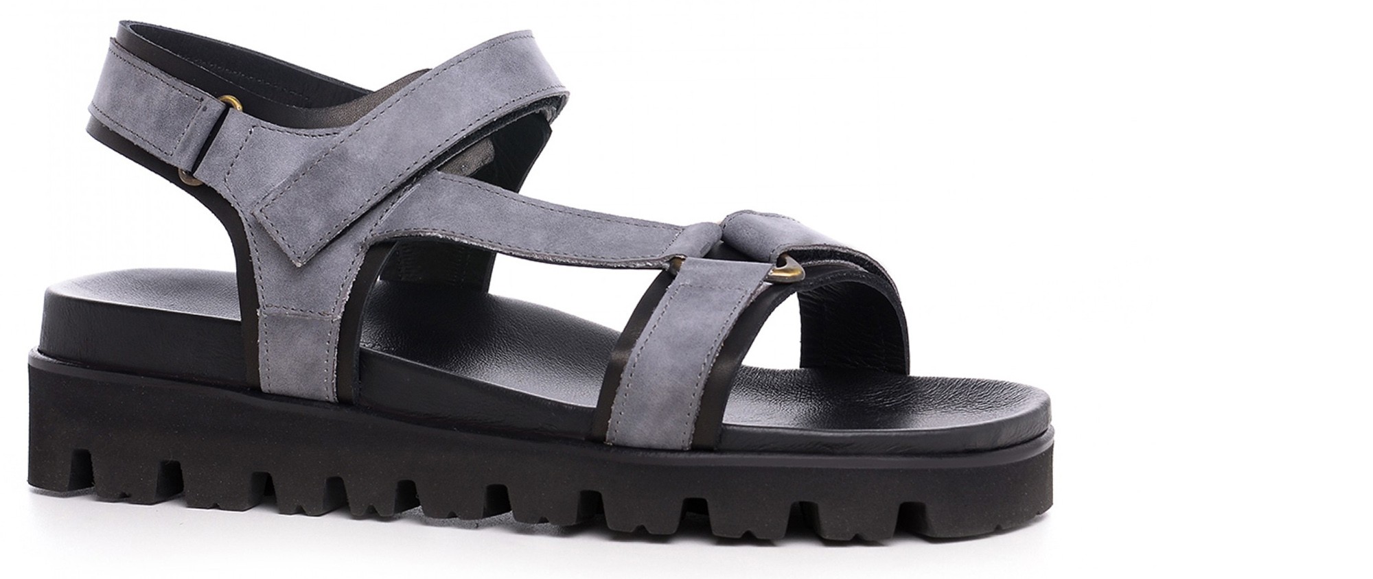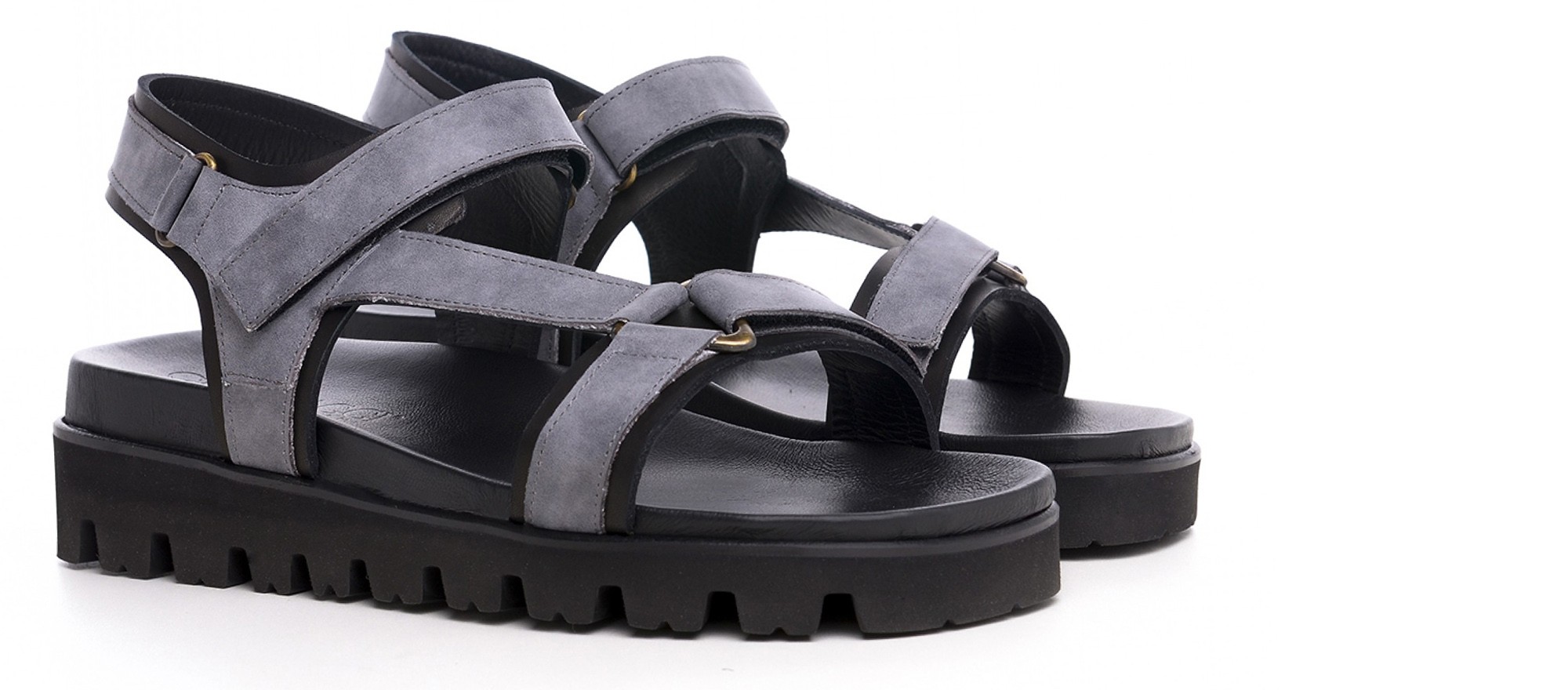 Handcrafted elevator sandals made of soft gray calfskin with velcro straps. Comfortable full grain leather-covered insole and tread sole made of natural rubber.