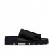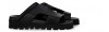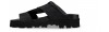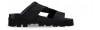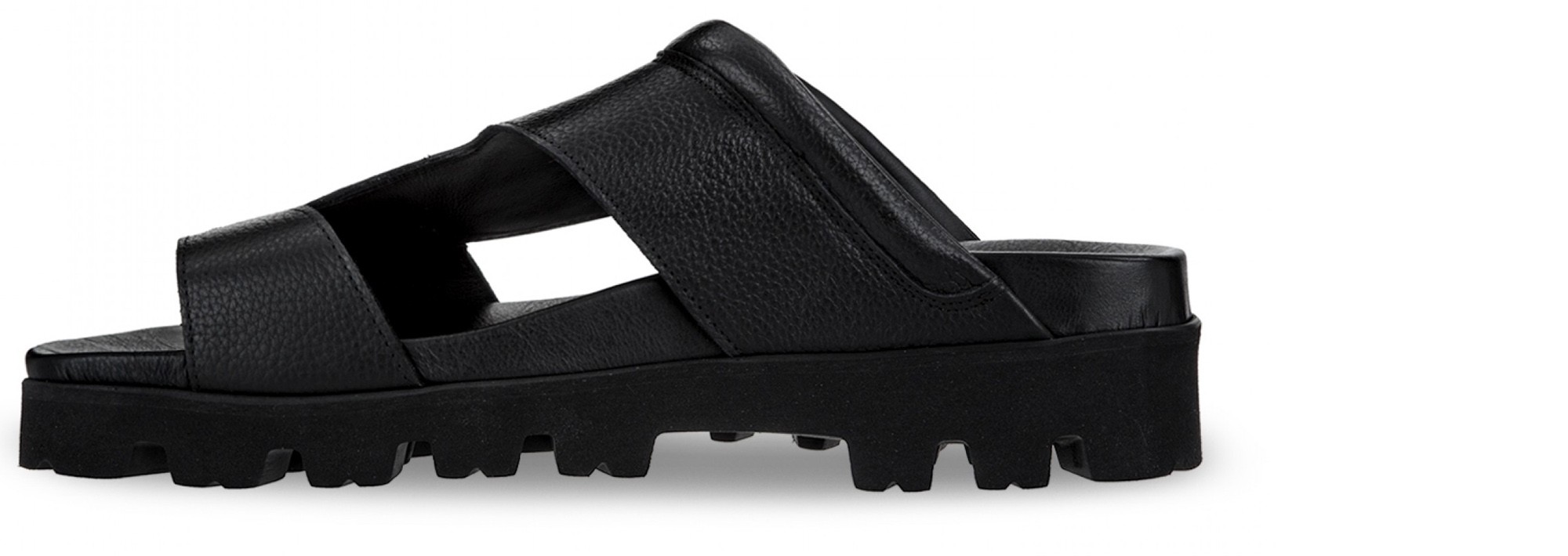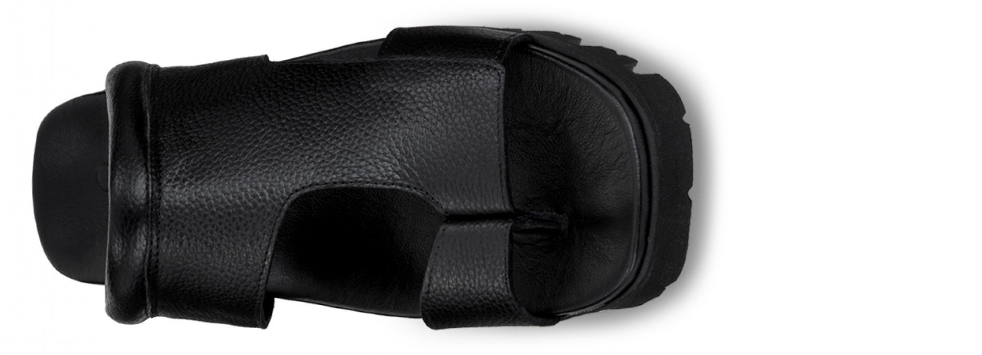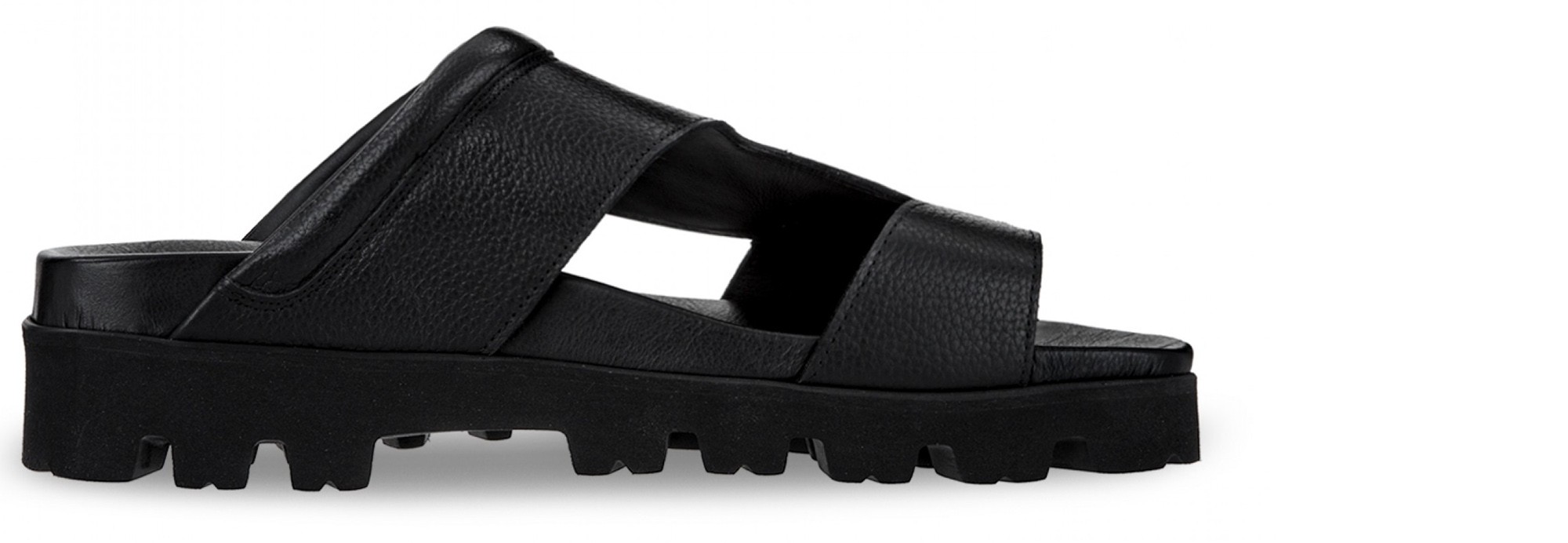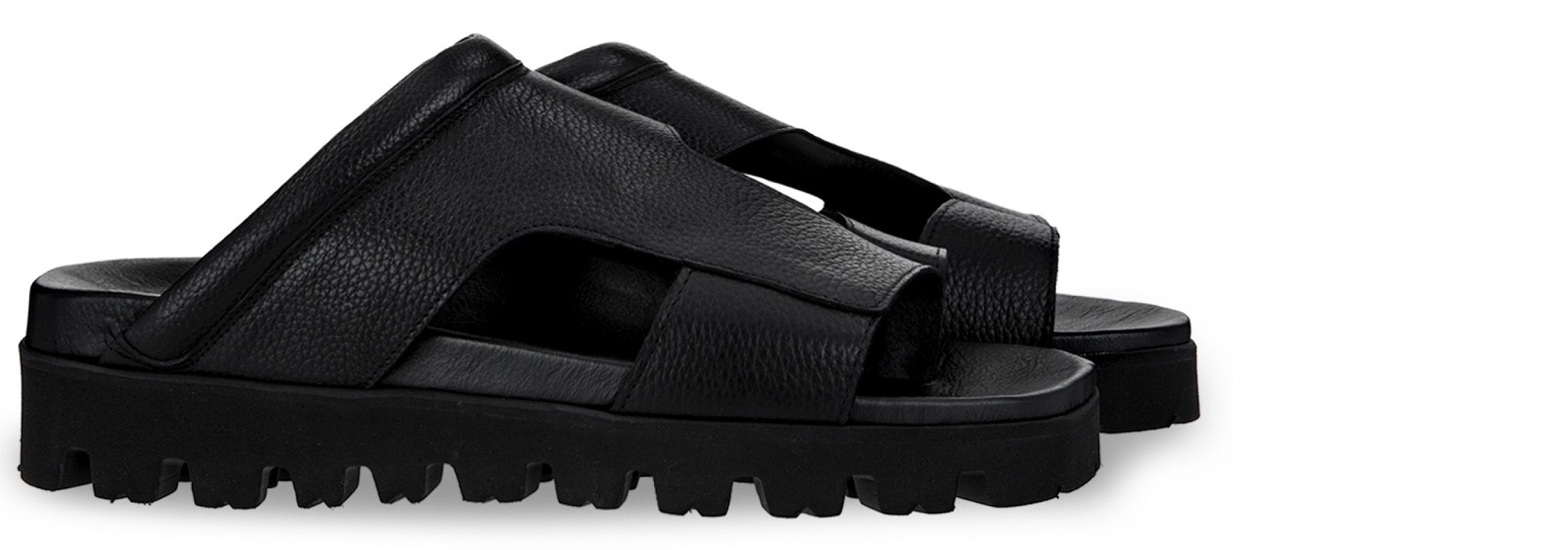 Stylish elevator sandals in black hammered calf leather and sole in natural rubber.