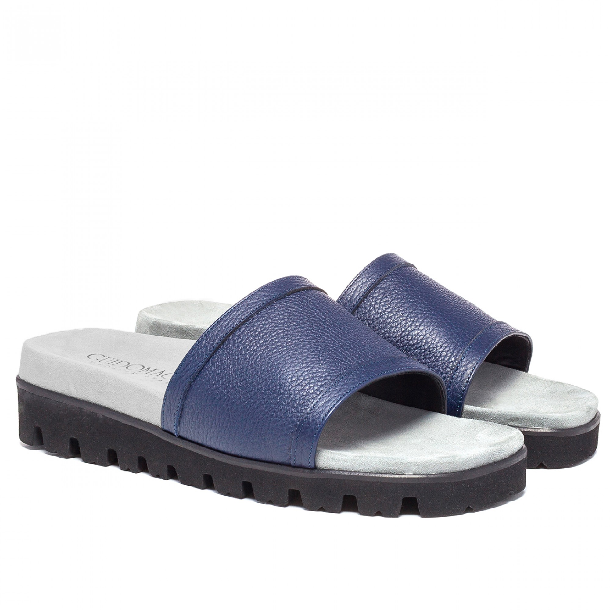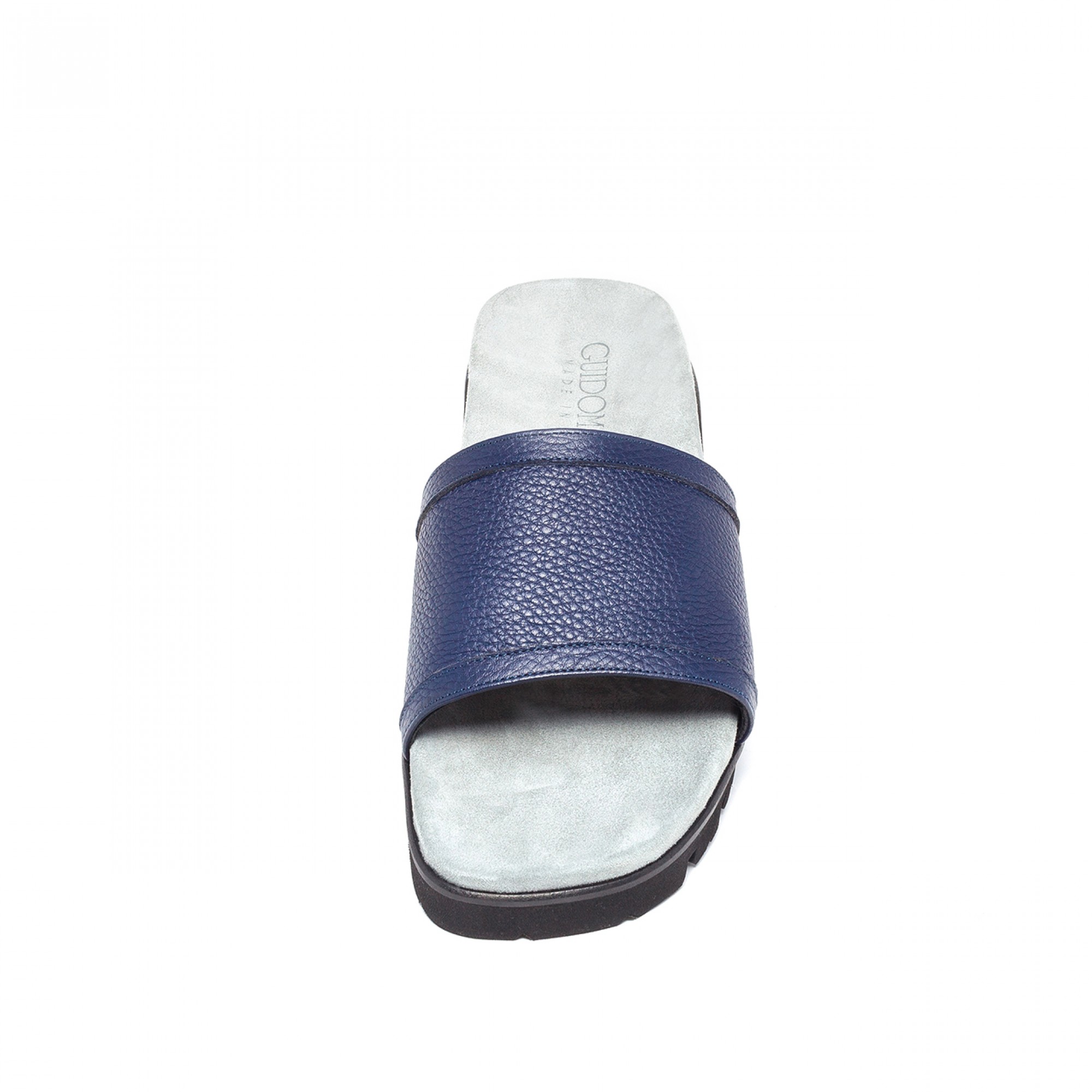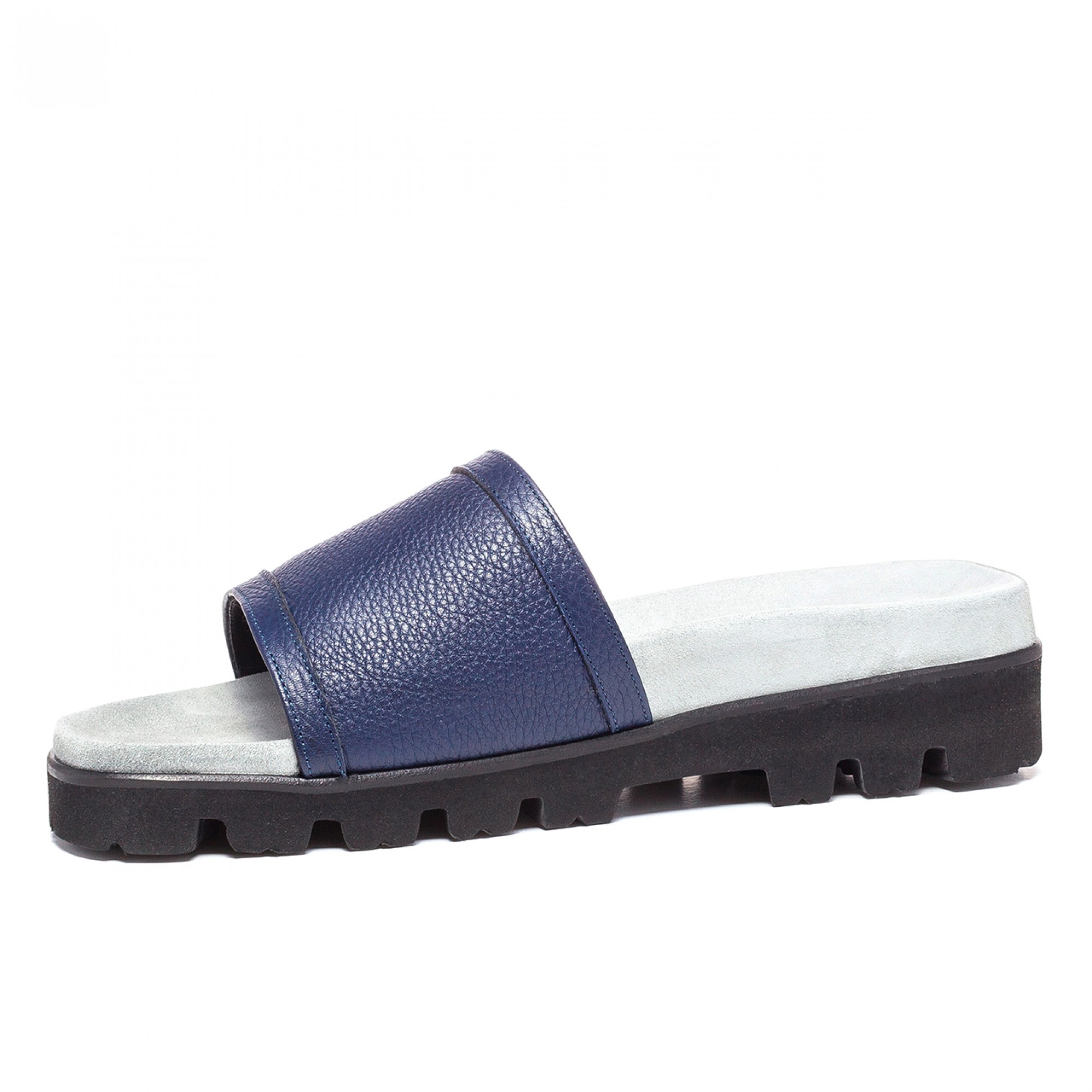 The upper in textured blue full grain leather , combined with an innovative height increasing system - able to add extra 5 cm to your height - and with the comfortable light gray leather covered insole.