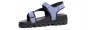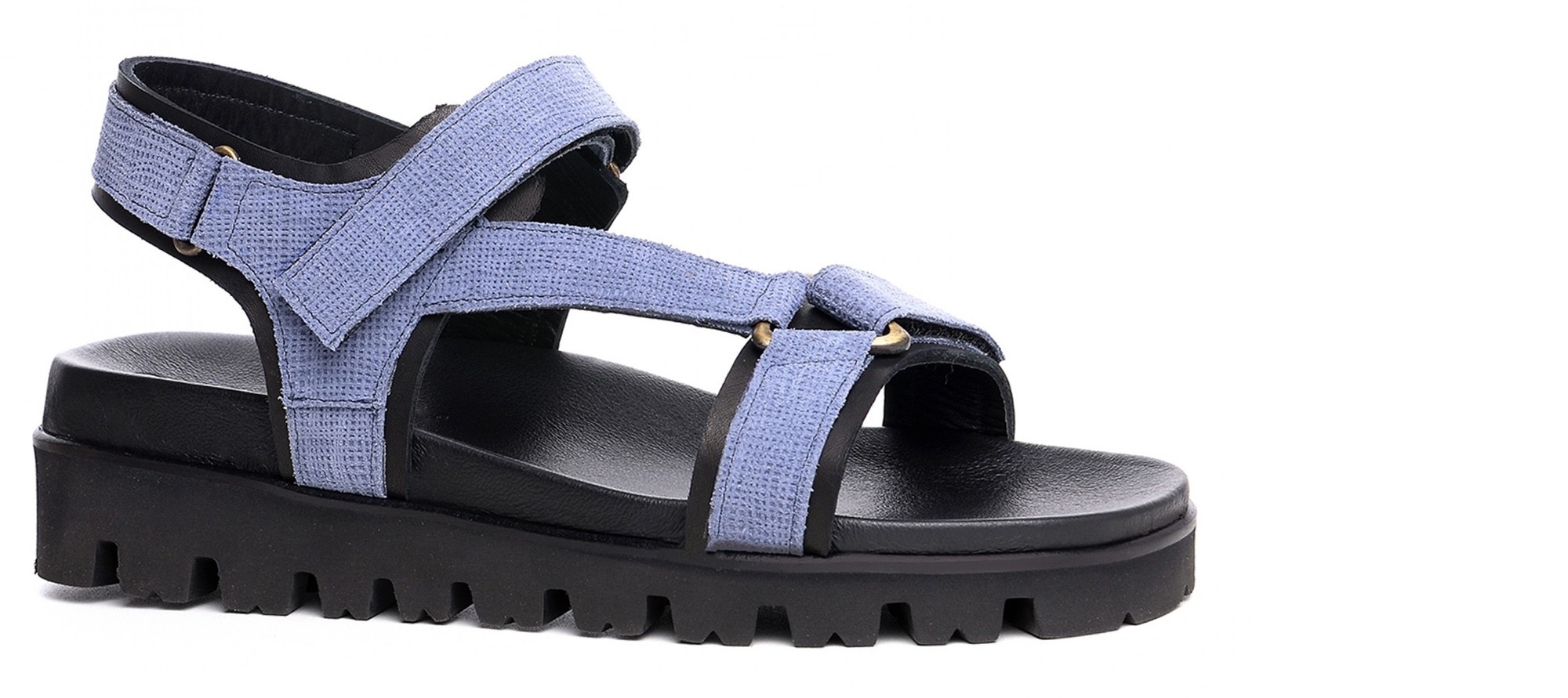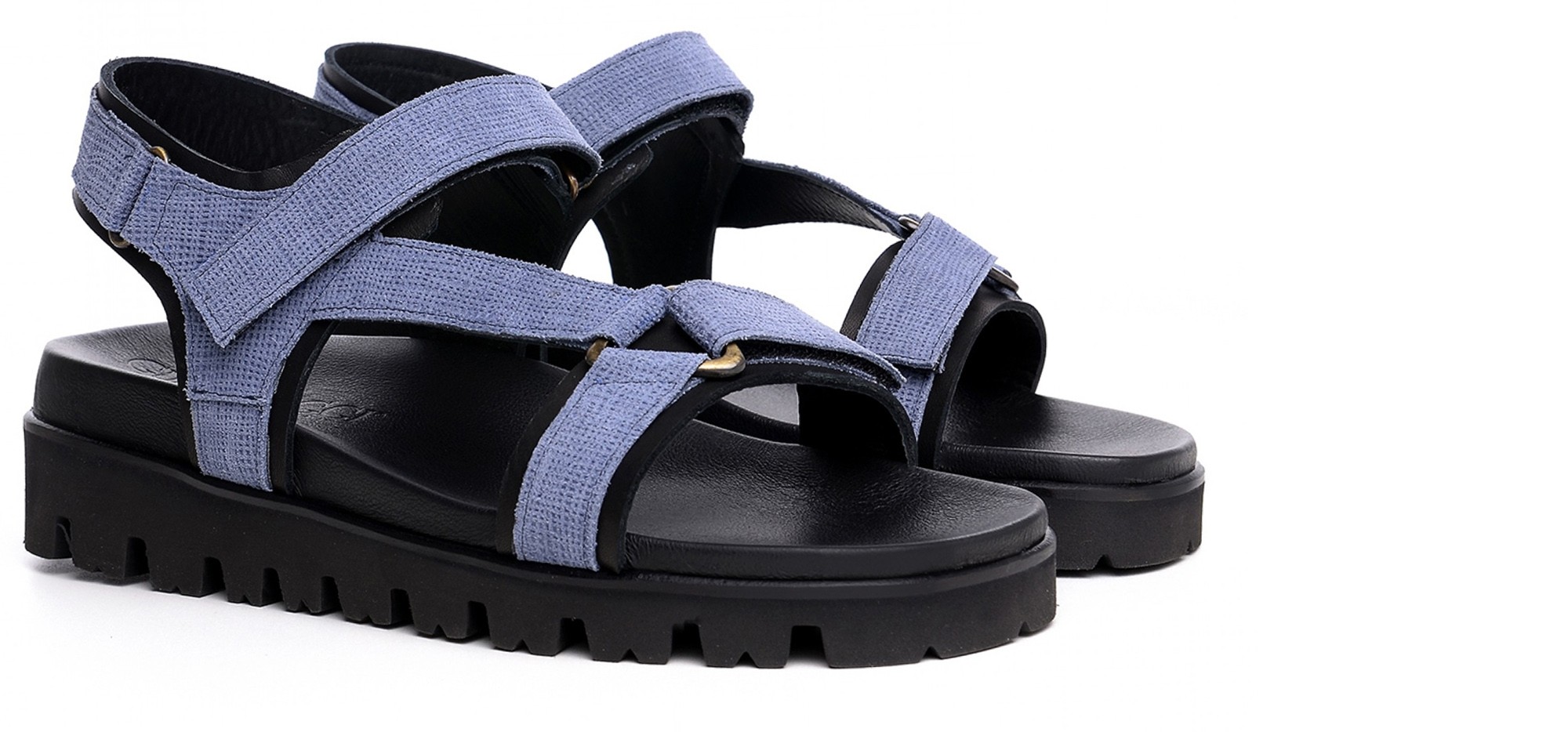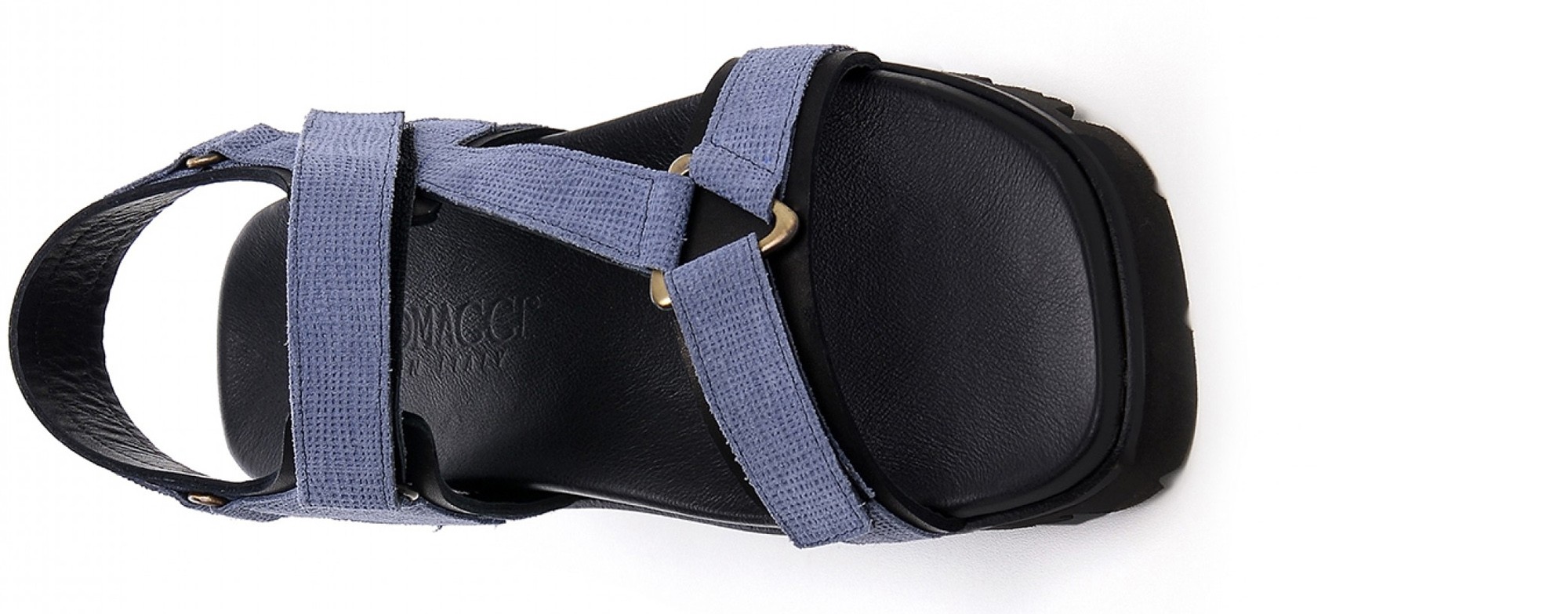 Elevator sandals made of velcro and soft blue calfskin straps and comfortable leather-covered insole.
