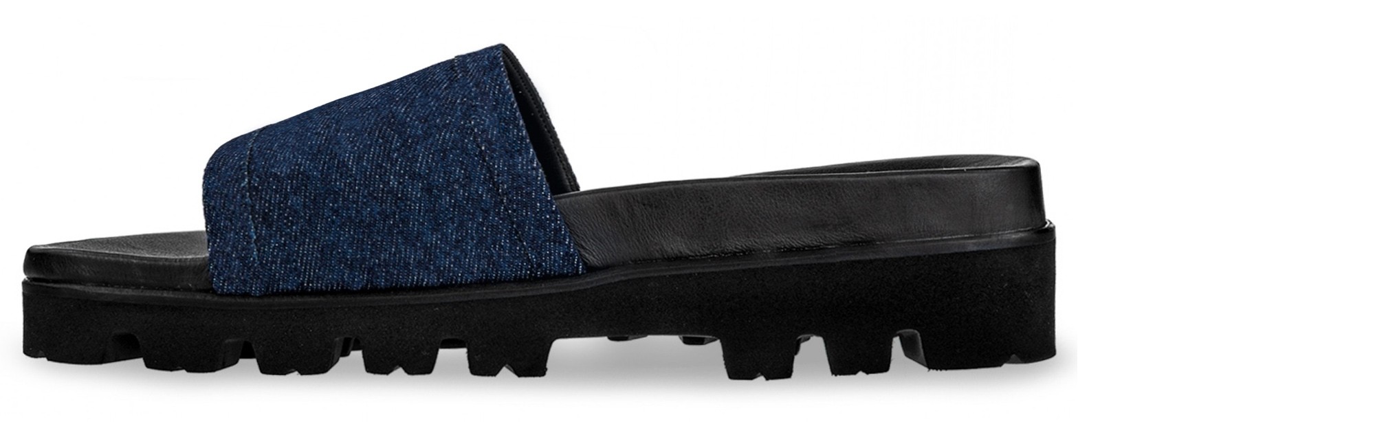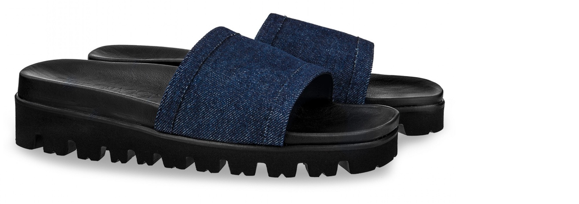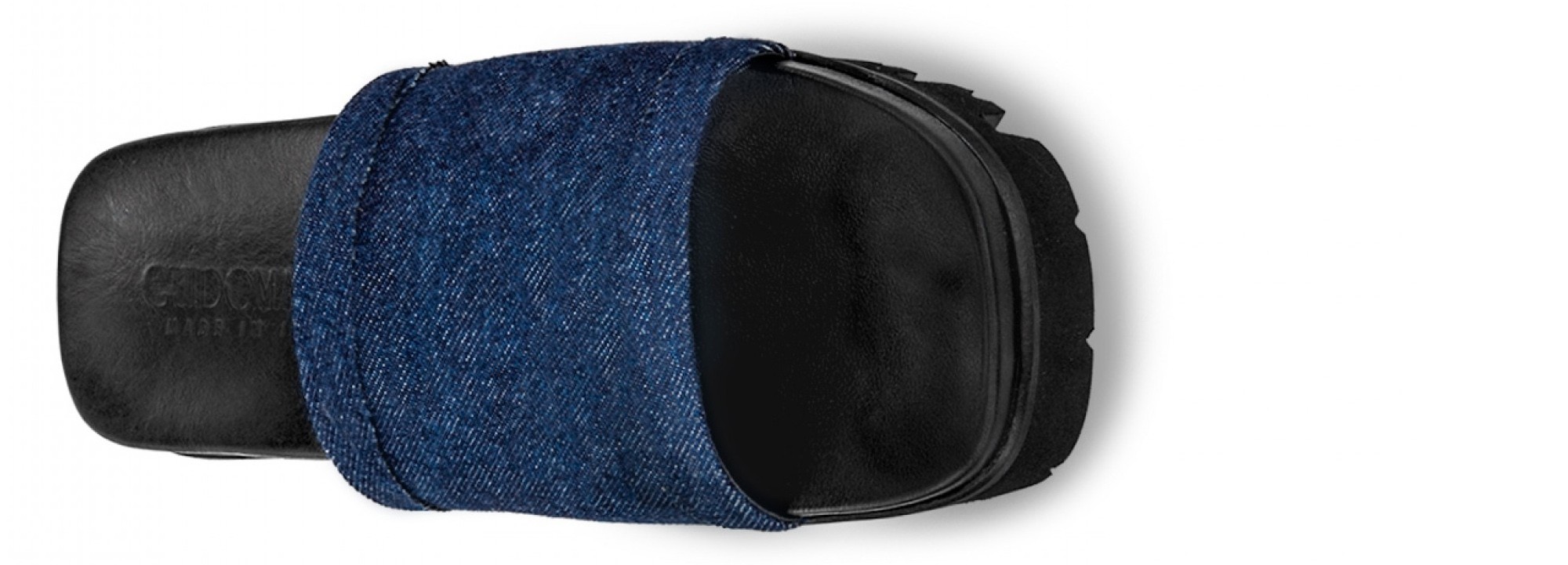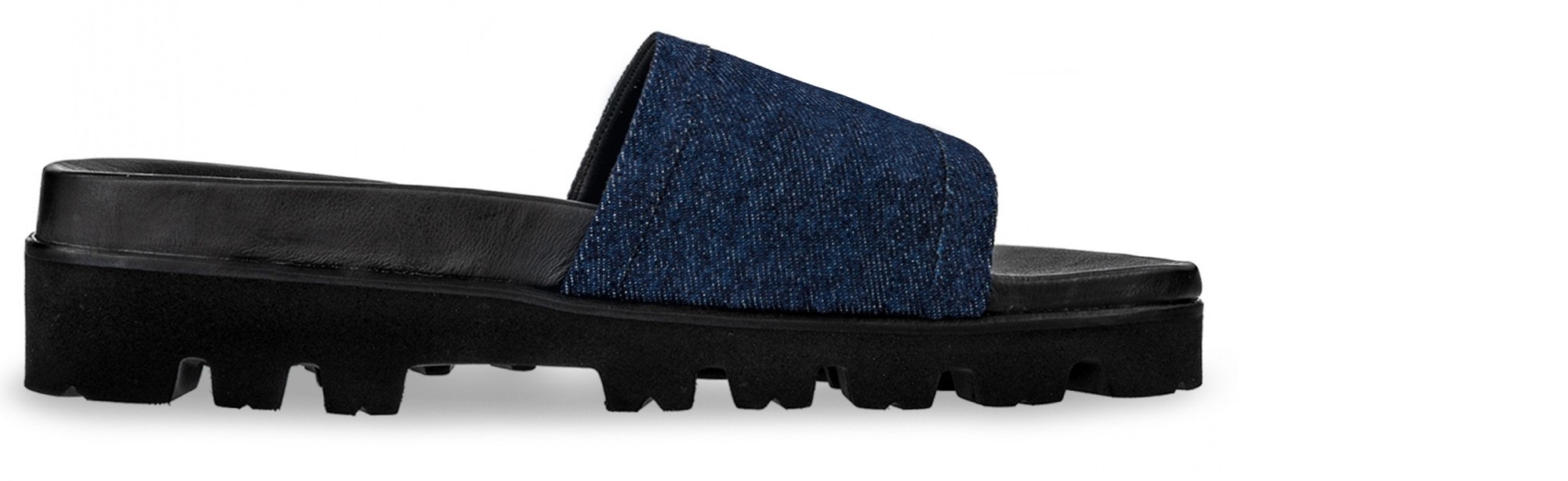 Elevator sandals ideal to wear at the beach or the swimming pool made of denim, super-lightweight rubber sole and comfortable leather-covered footbed.