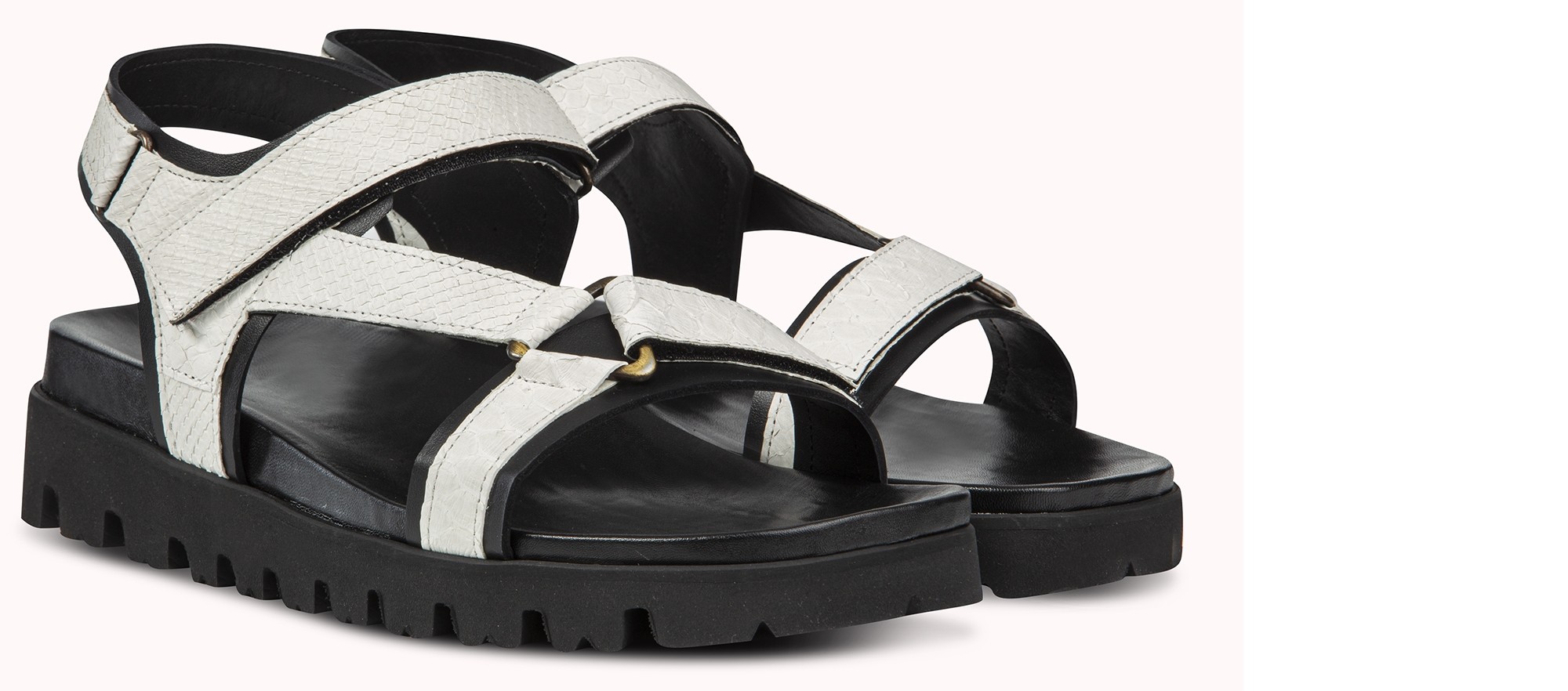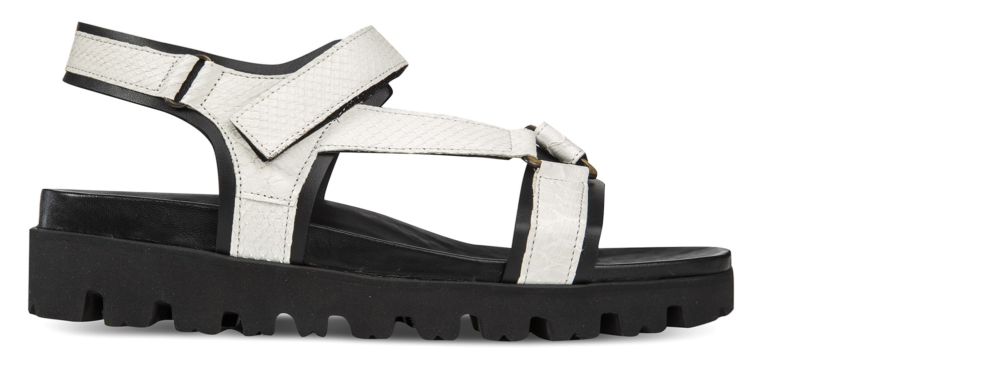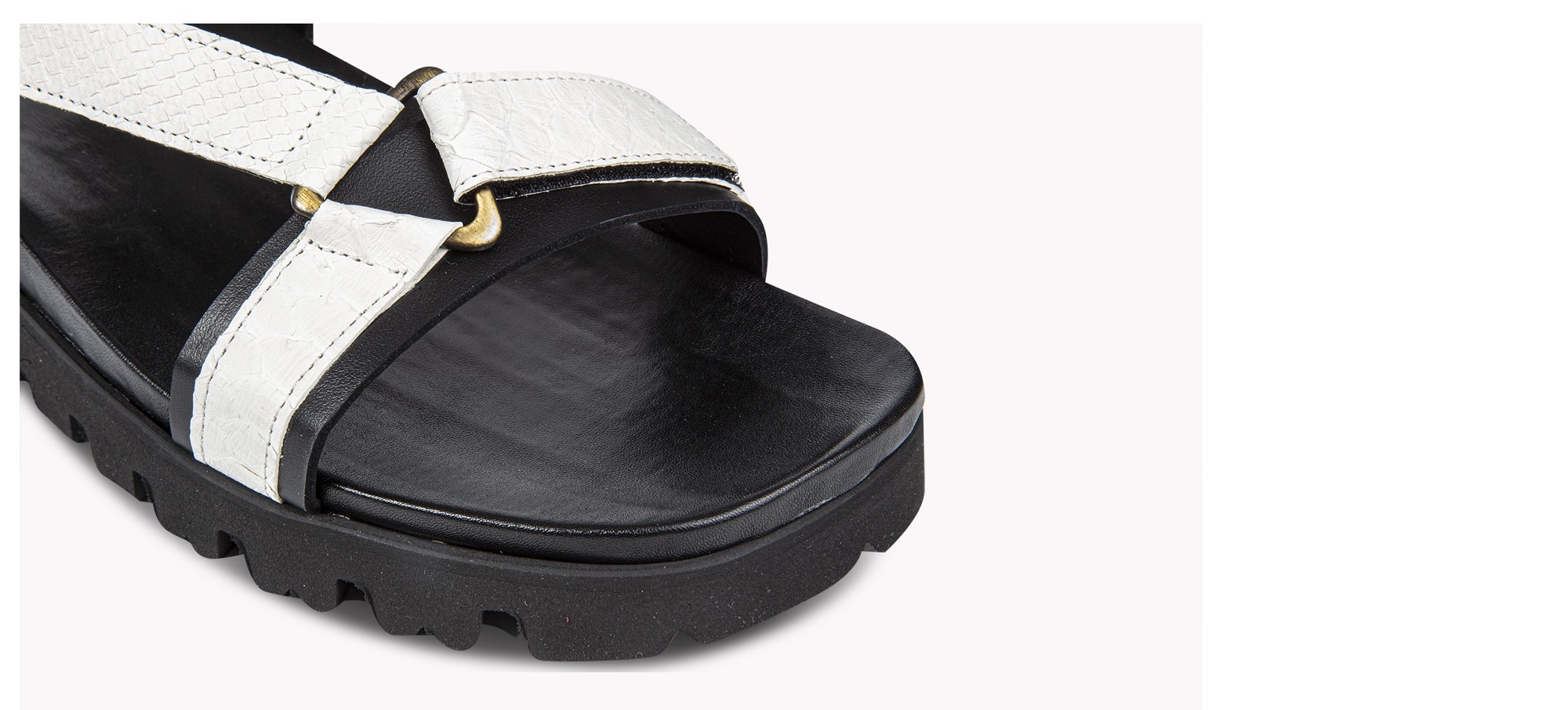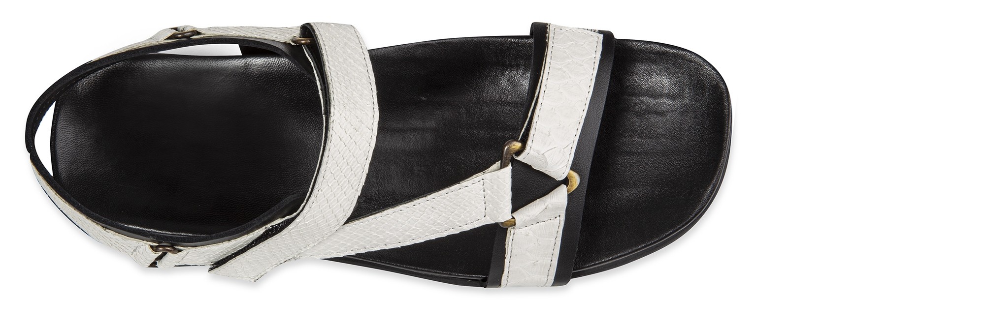A touch of style and exclusive luxury for next spring/summer. The elevator sandal in shades of Black & White is a masterpiece of haute couture by GuidoMaggi. The upper is a white python with edges and finishes in full black grain. The anatomical and super light footbed allows an increase in height up to 1.97" in total comfort and discretion. 100% made in Italy.