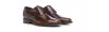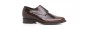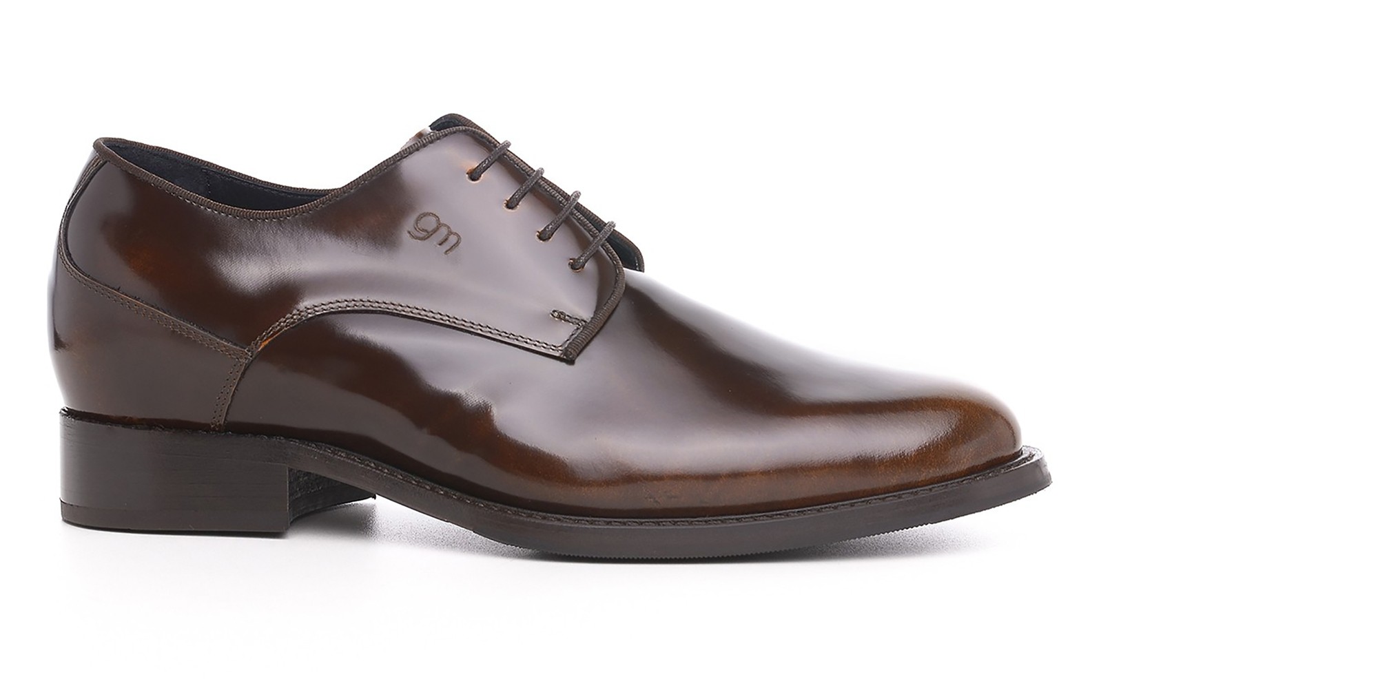 Elevator derby shoe in brown shiny calfskin and stiched leather sole with anti slip rubber.