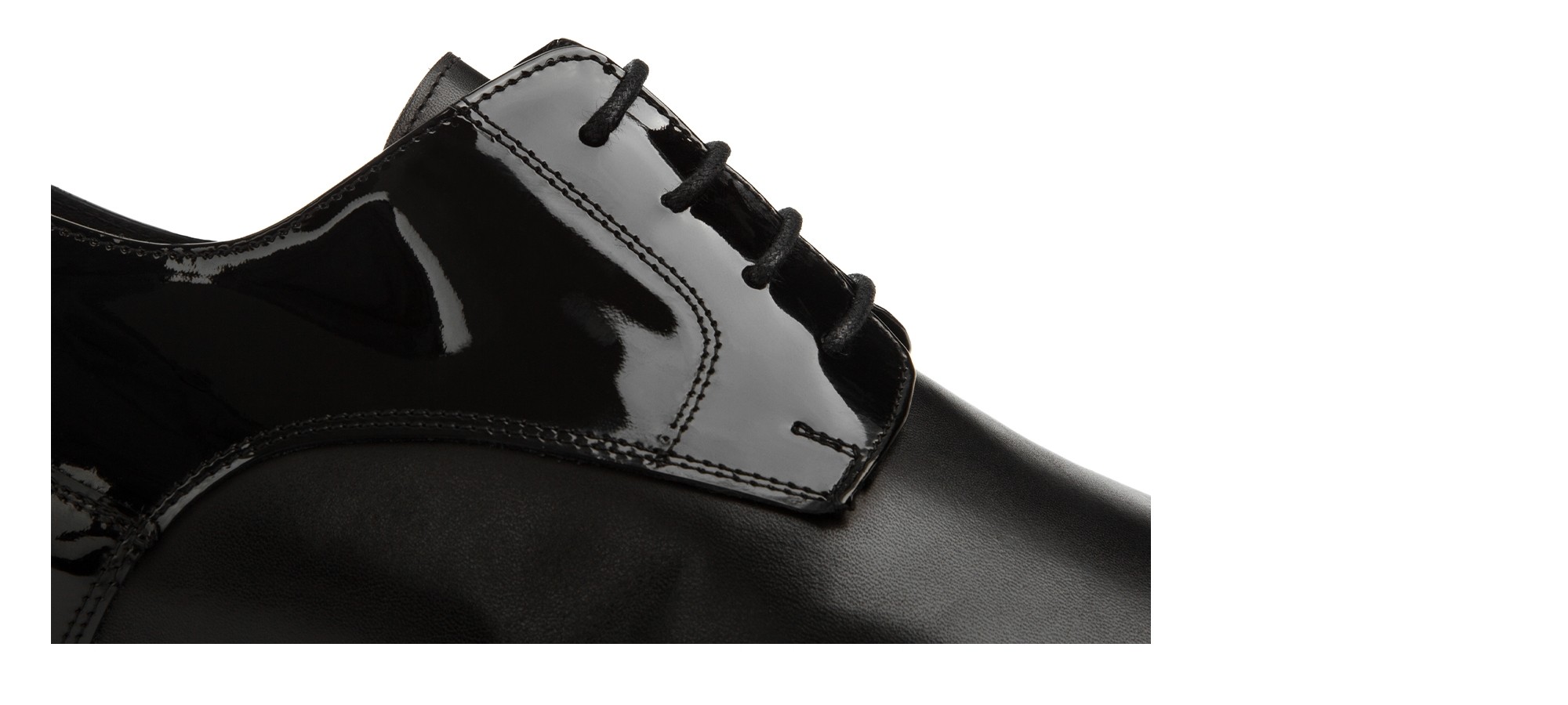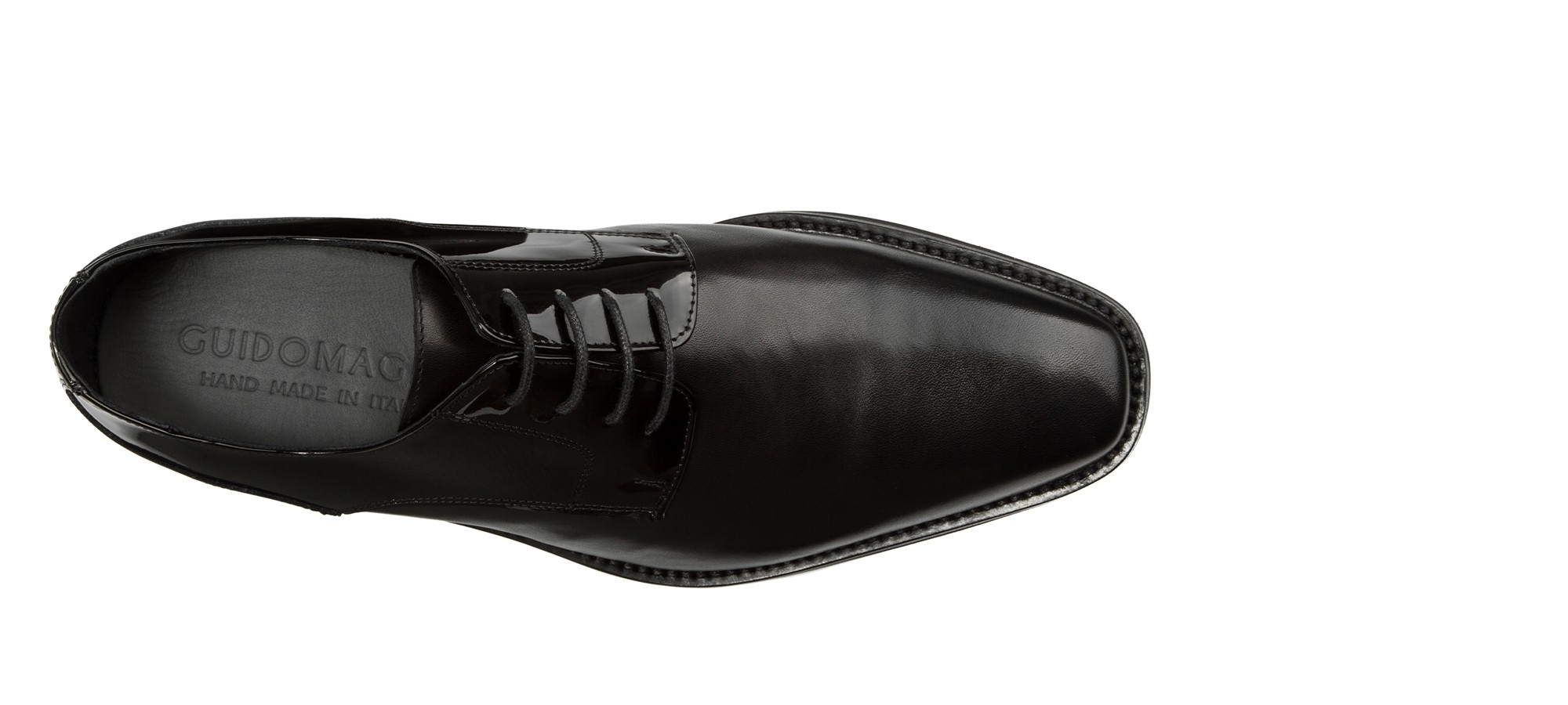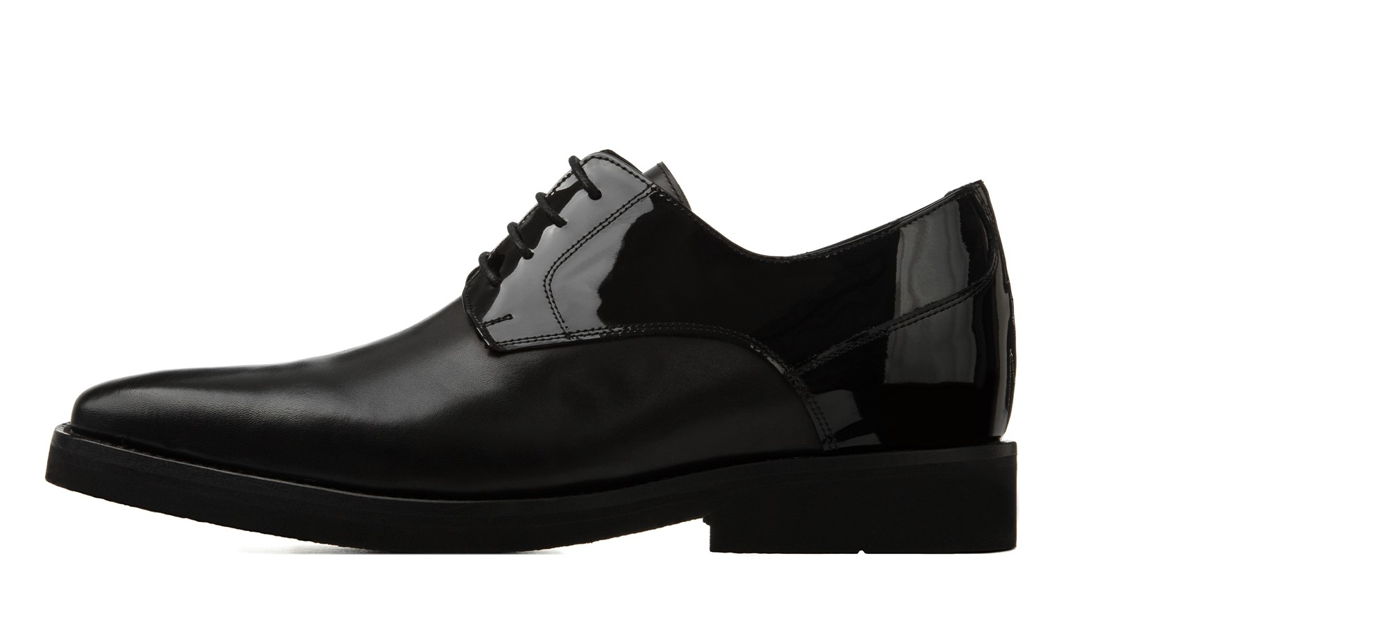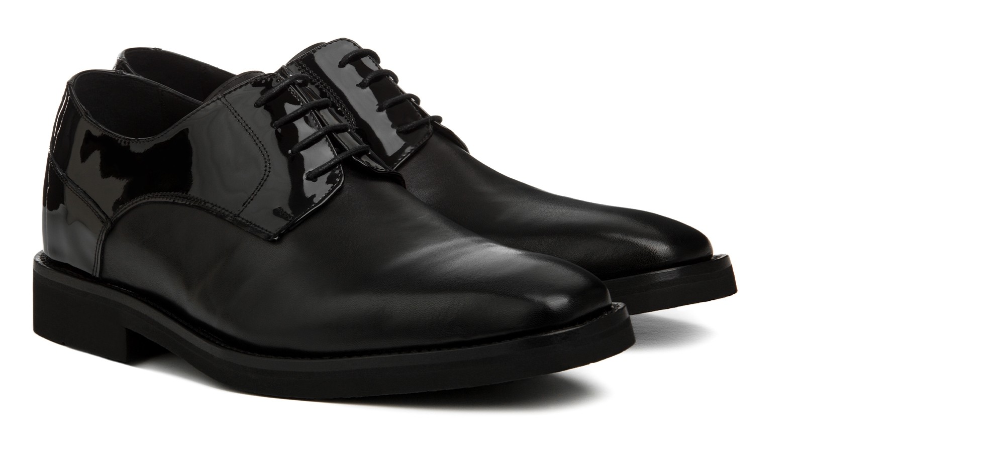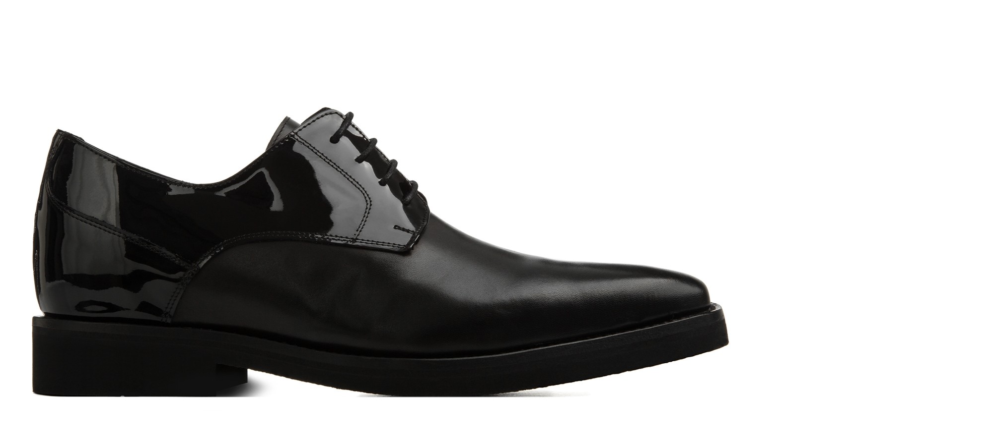 Classic elevator derby shoe featuring an elegant style and sophisticated lines. The upper combines black full grain leather on the toe with black patent leather on the quarters, creating a refined and luminous effect. The square toe adds a modern and distinctive touch to the design.