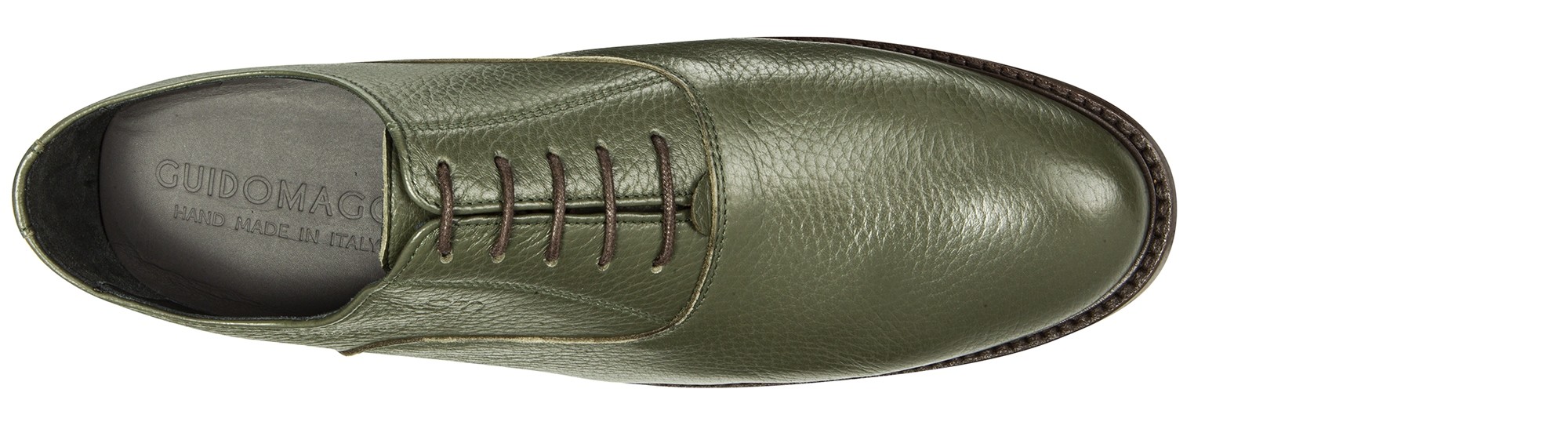 An elevator Oxford from the brand new series by GuidoMaggi. It has the upper in fine deerskin: an excellent type of leather, characterized by a natural softness and breathability, flexible and highly durable. In olive green, with a dark brown sole in 100% Italian leather, it adds up to 3.1" in total comfort and discretion. Handmade in Italy.