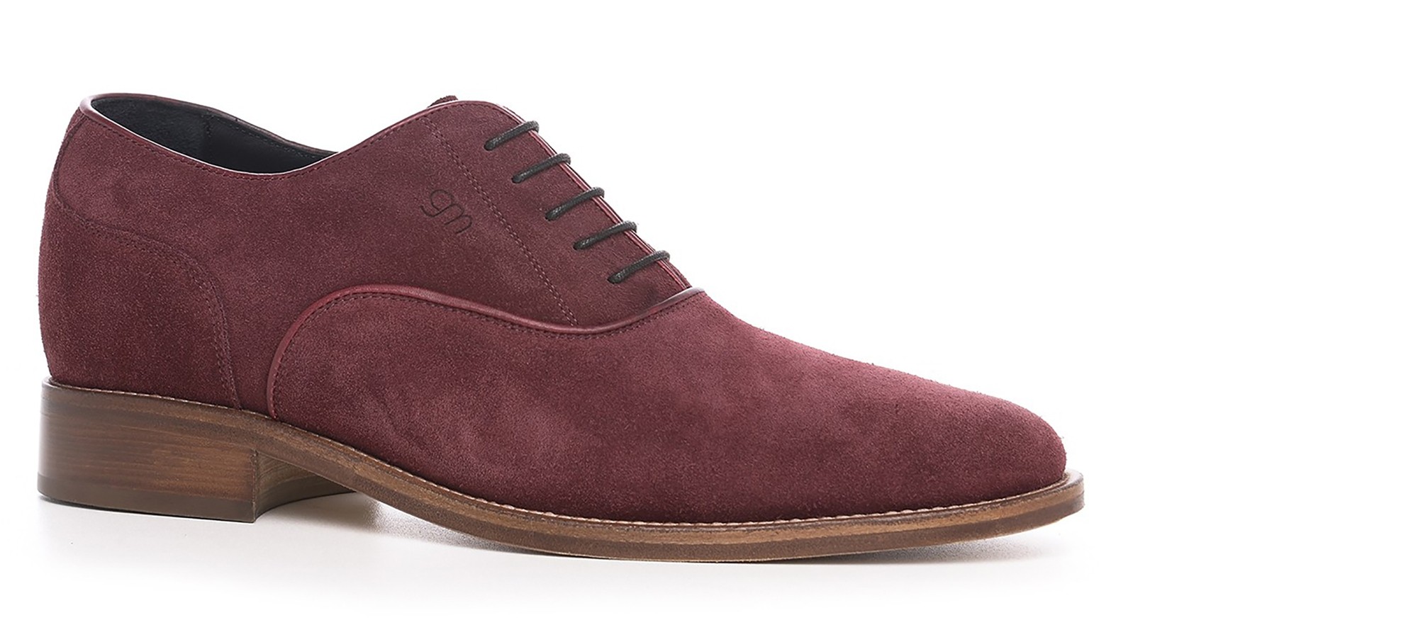Elegant handmade Oxford with upper in burgundy suede and real leather sole. A shoe with an invisible inner elevator system to choose up to 3.1 inches (8 cm) featuring the exclusive Goodyear stitching that makes it even more comfortable and durable.