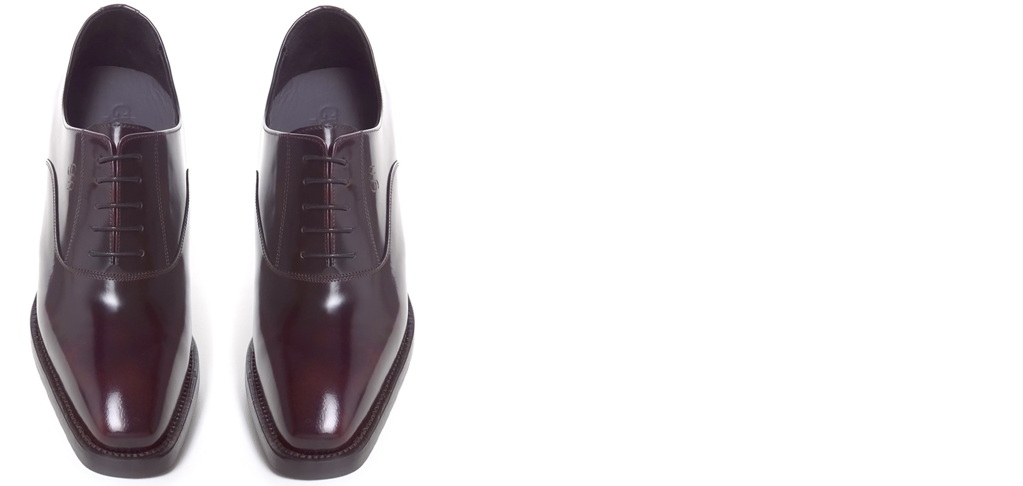 Elegant elevator dress shoe with upper in brushed calfskin and stiched leather sole with anti slip rubber. A model of extreme class, where the special craft creates distinctive burgundy reflections.