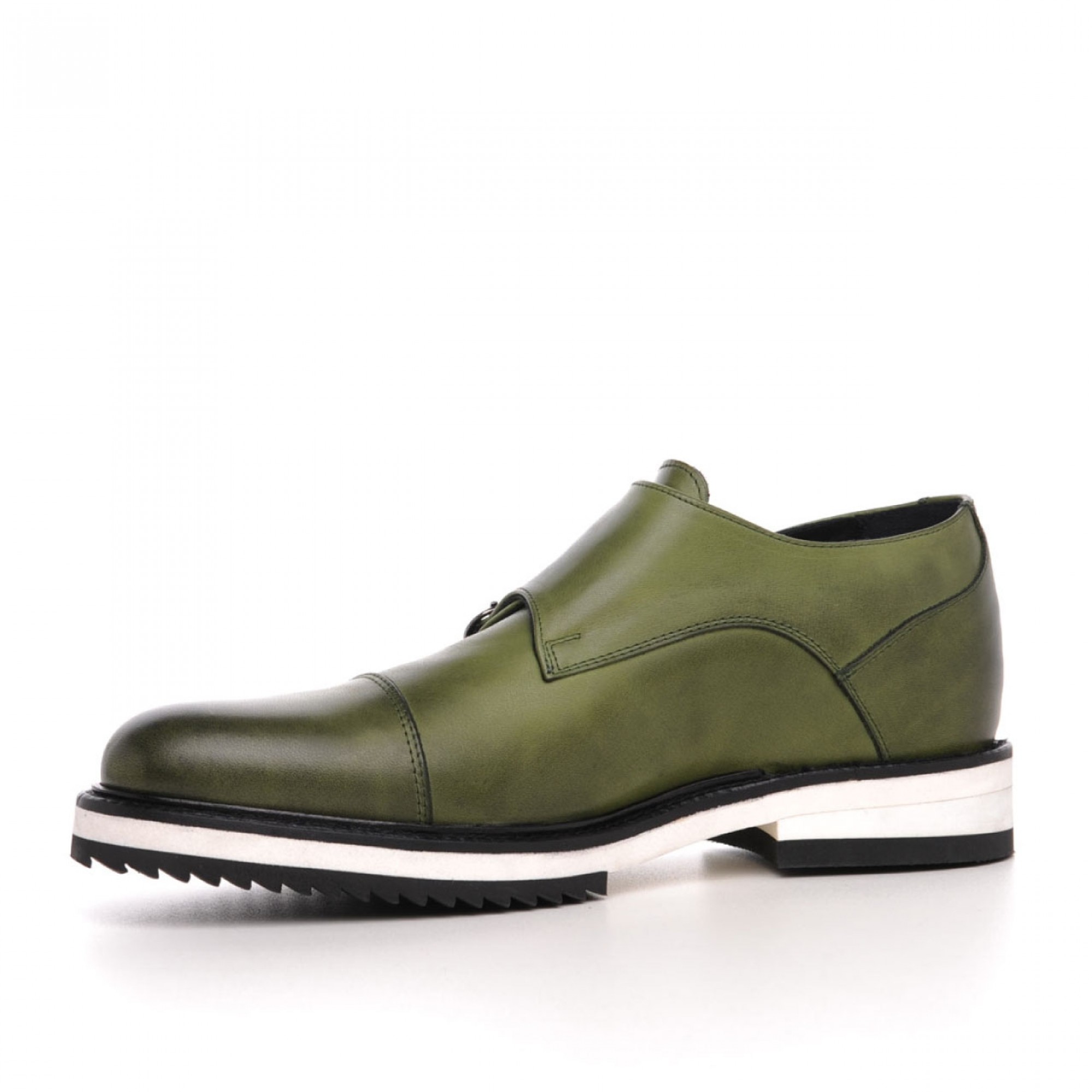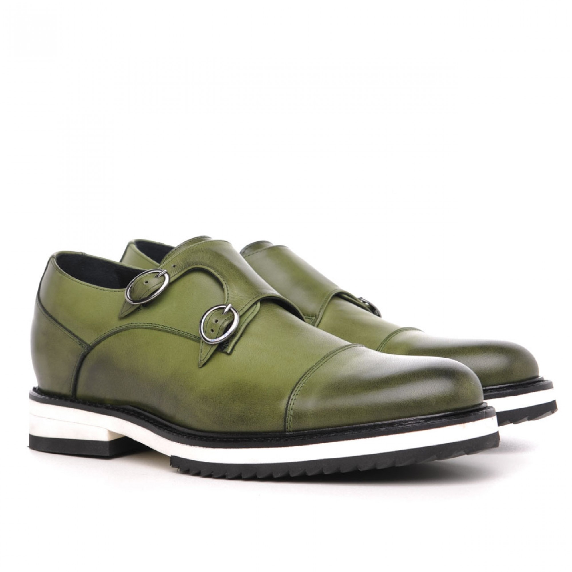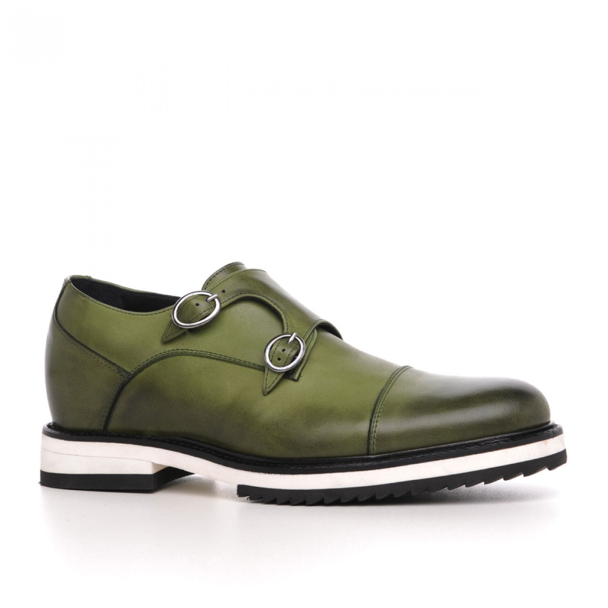 Double monk strap elevator shoes featuring upper made of olive green full grain leather and two tone rubber sole.