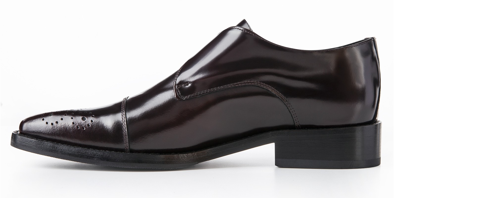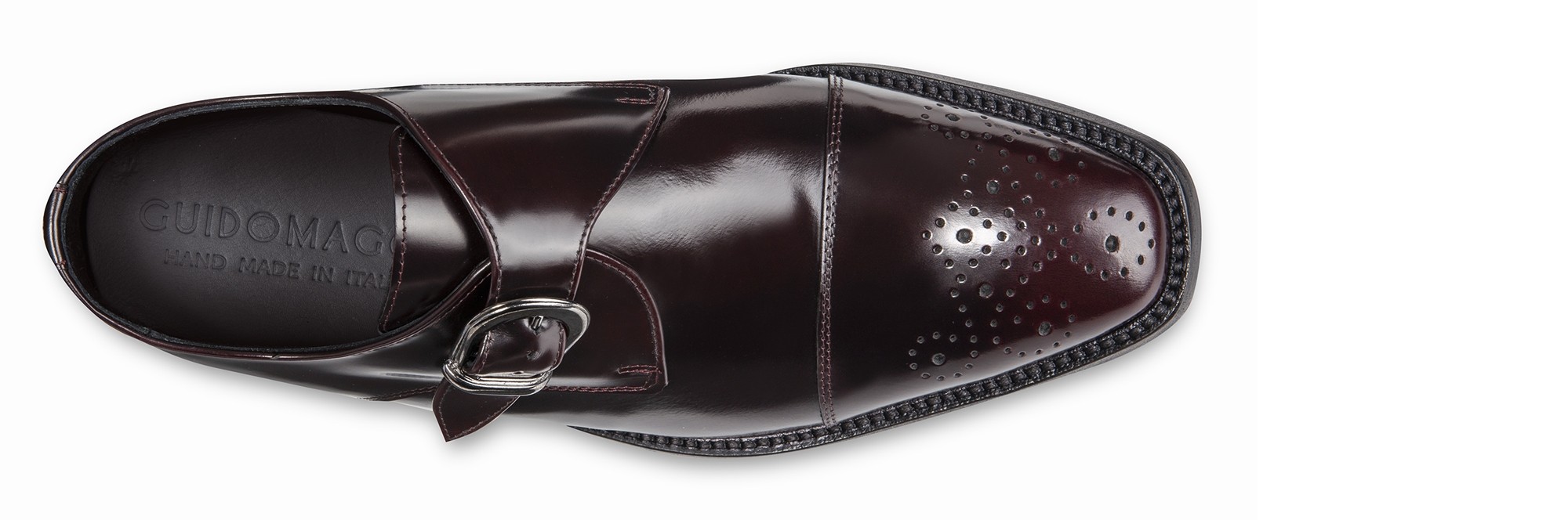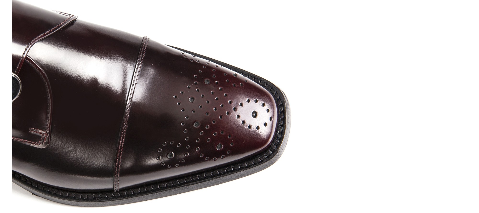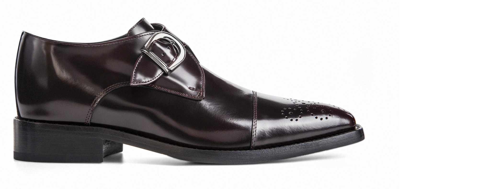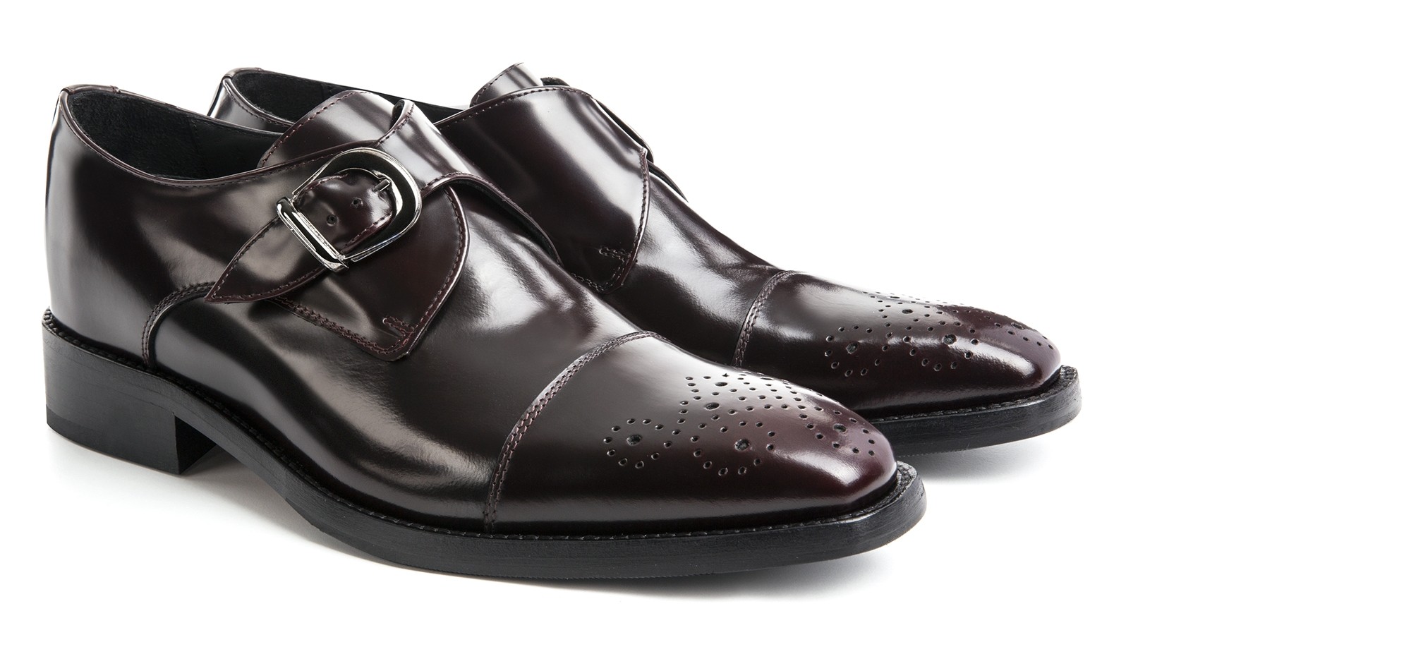 Elevator single monk strap shoes handmade in soft polished calf leather featuring a refined burgundy color and flower decoration on the toe cap. The real leather sole with anti-slip rubber is stitched at sight.