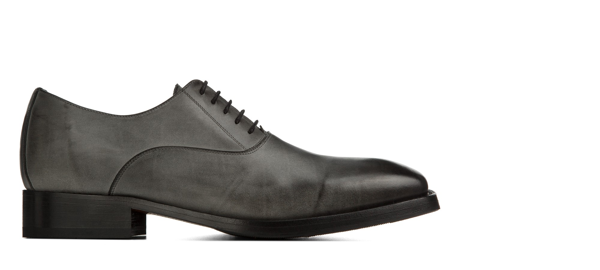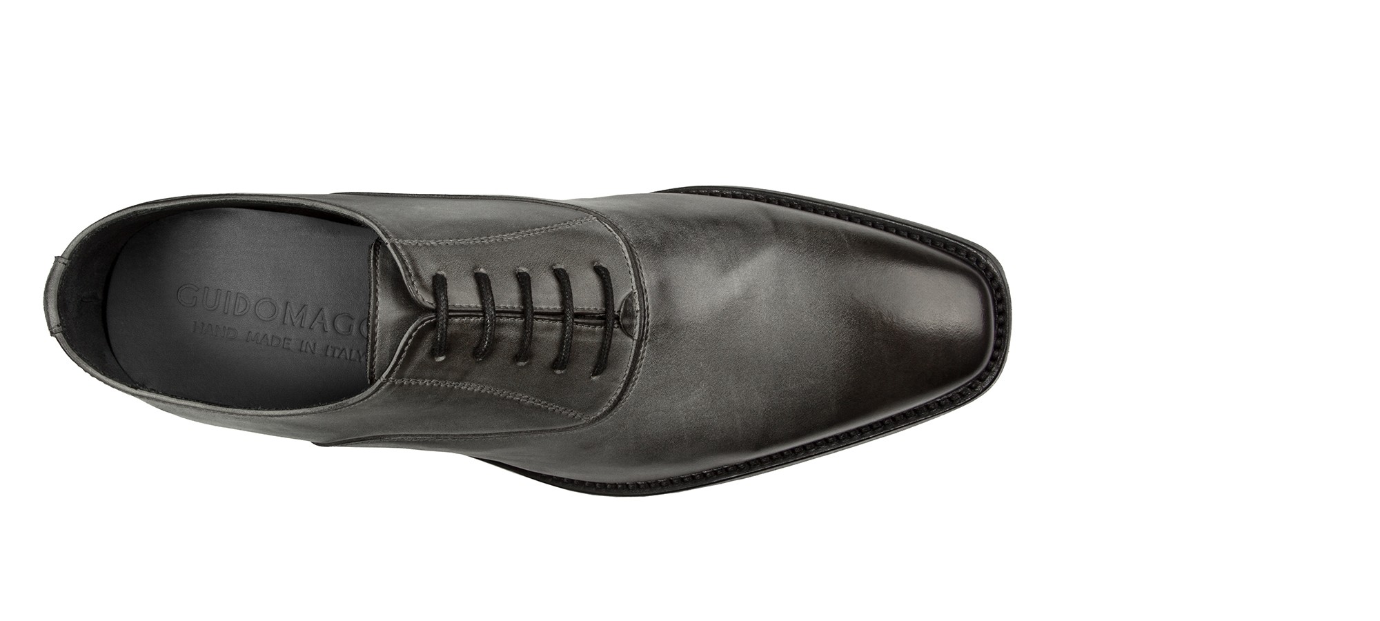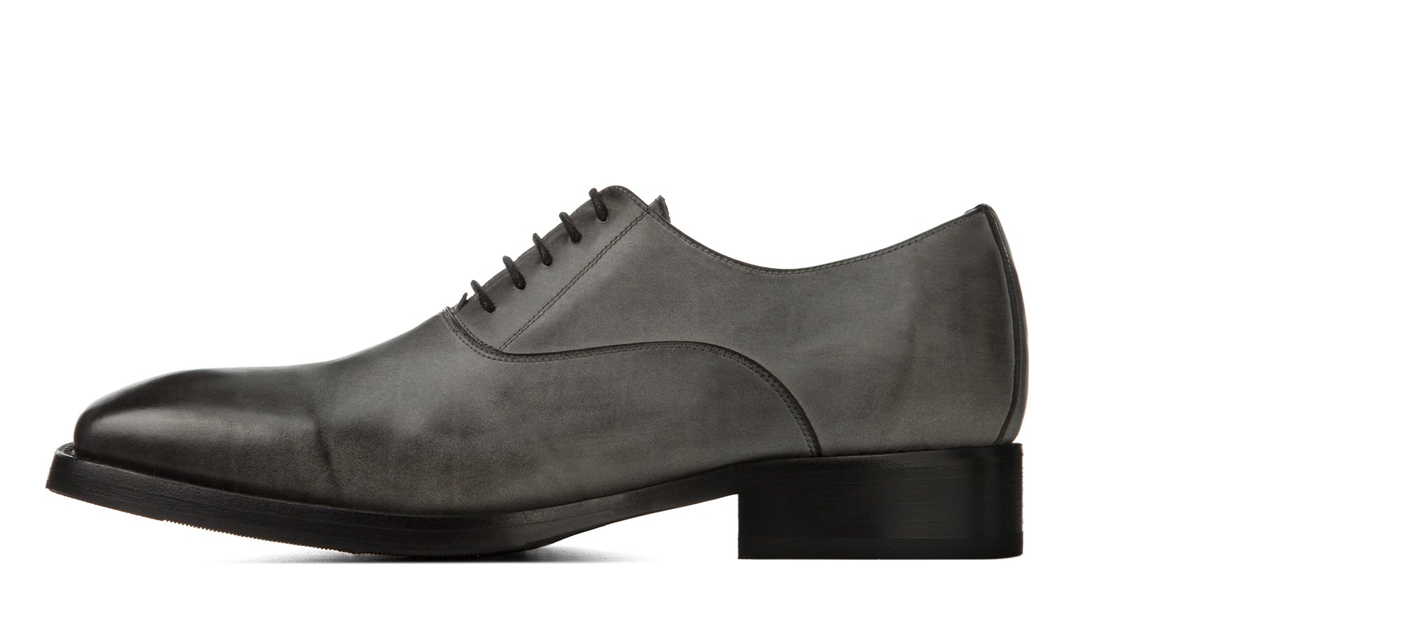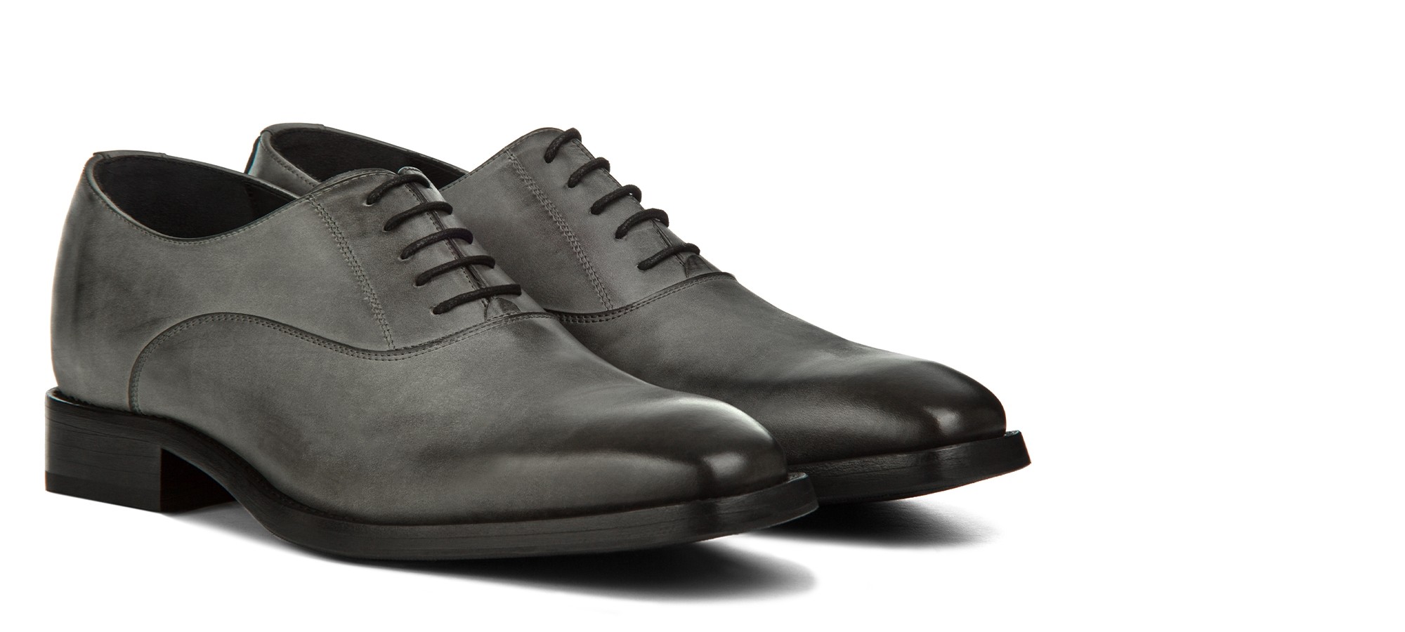 Stylish elevator dress shoes with upper in light grey hand-buffered full grain leather, square toe and stiched leather sole with anti slip rubber.