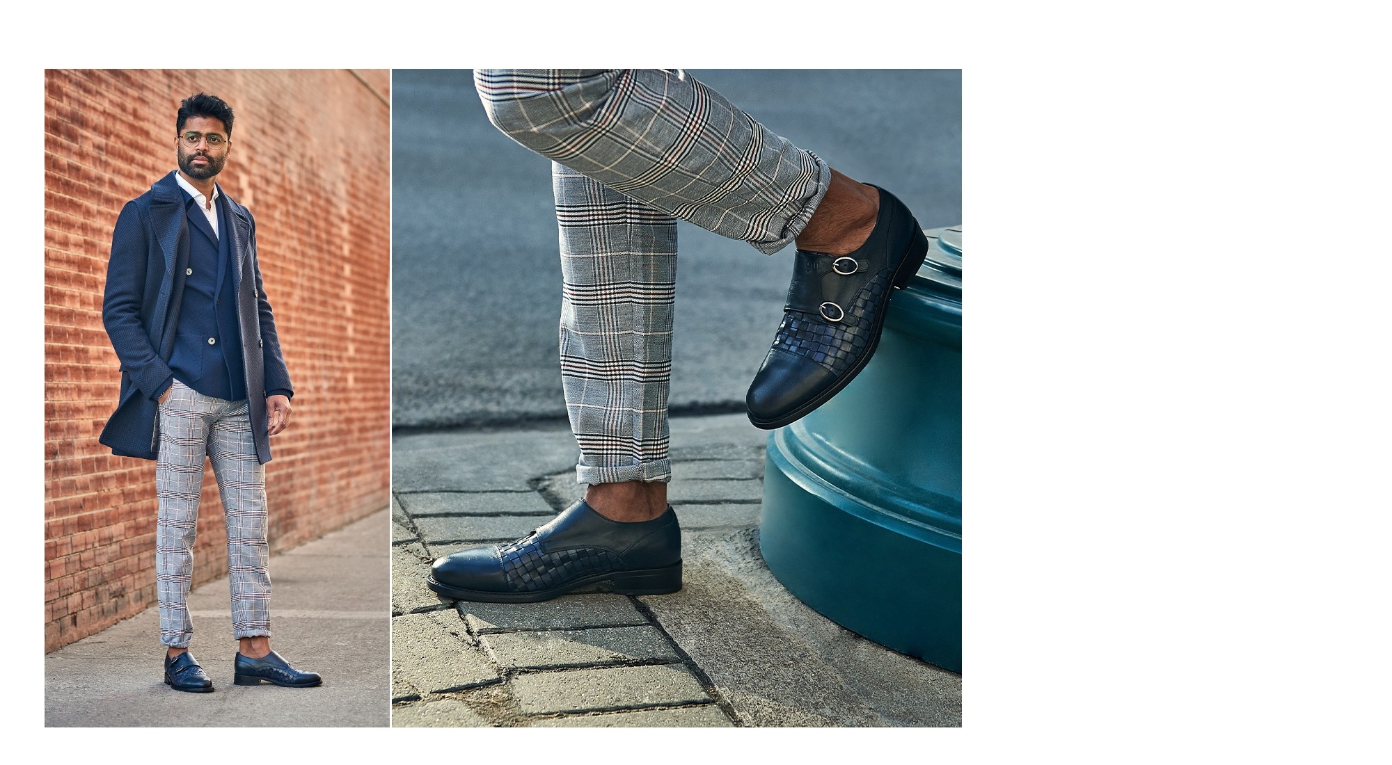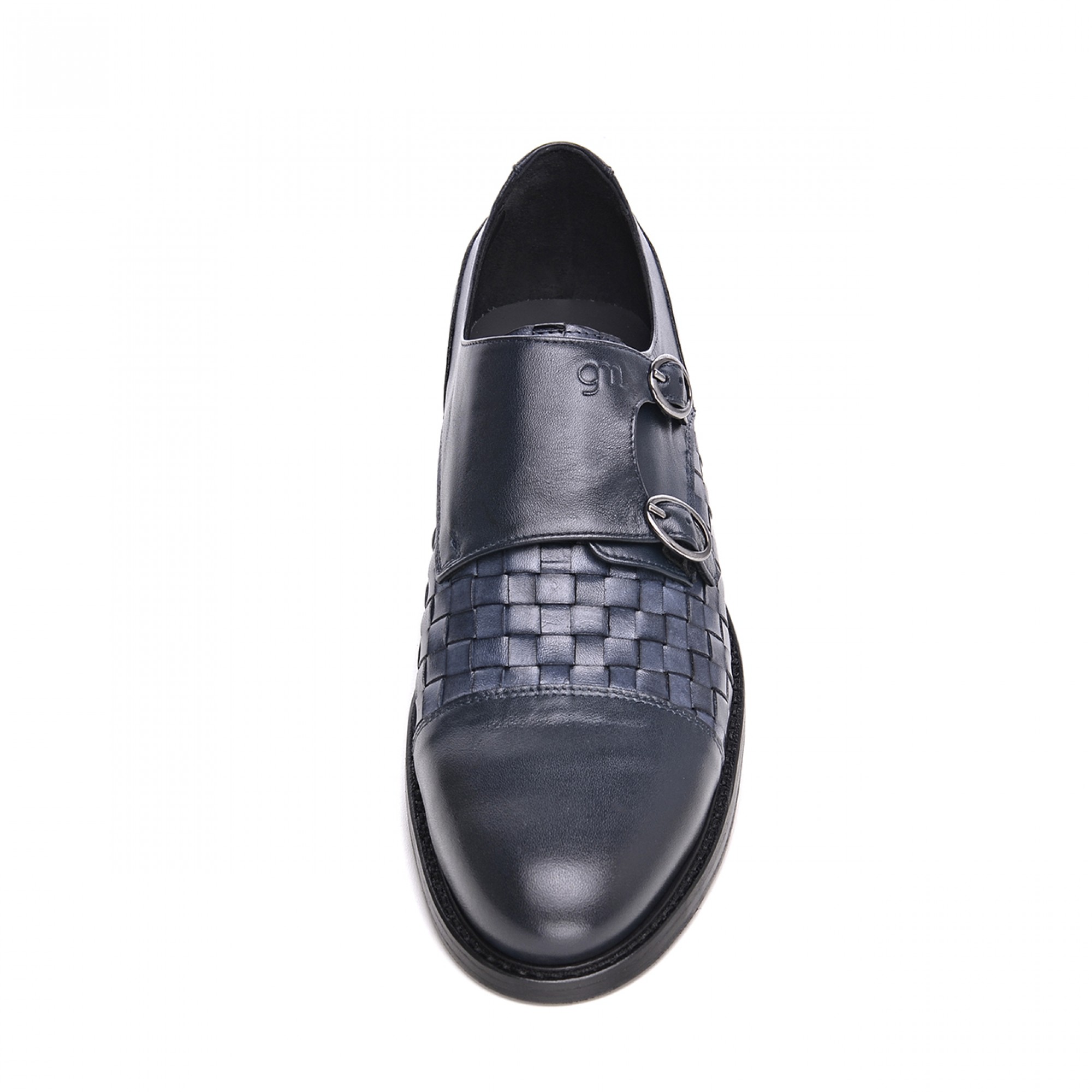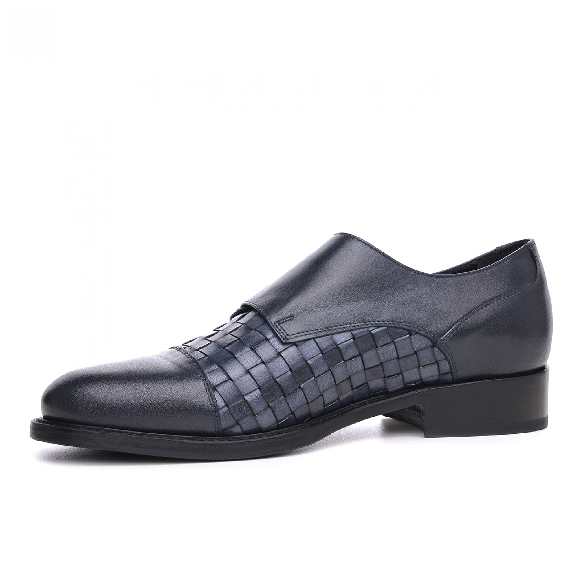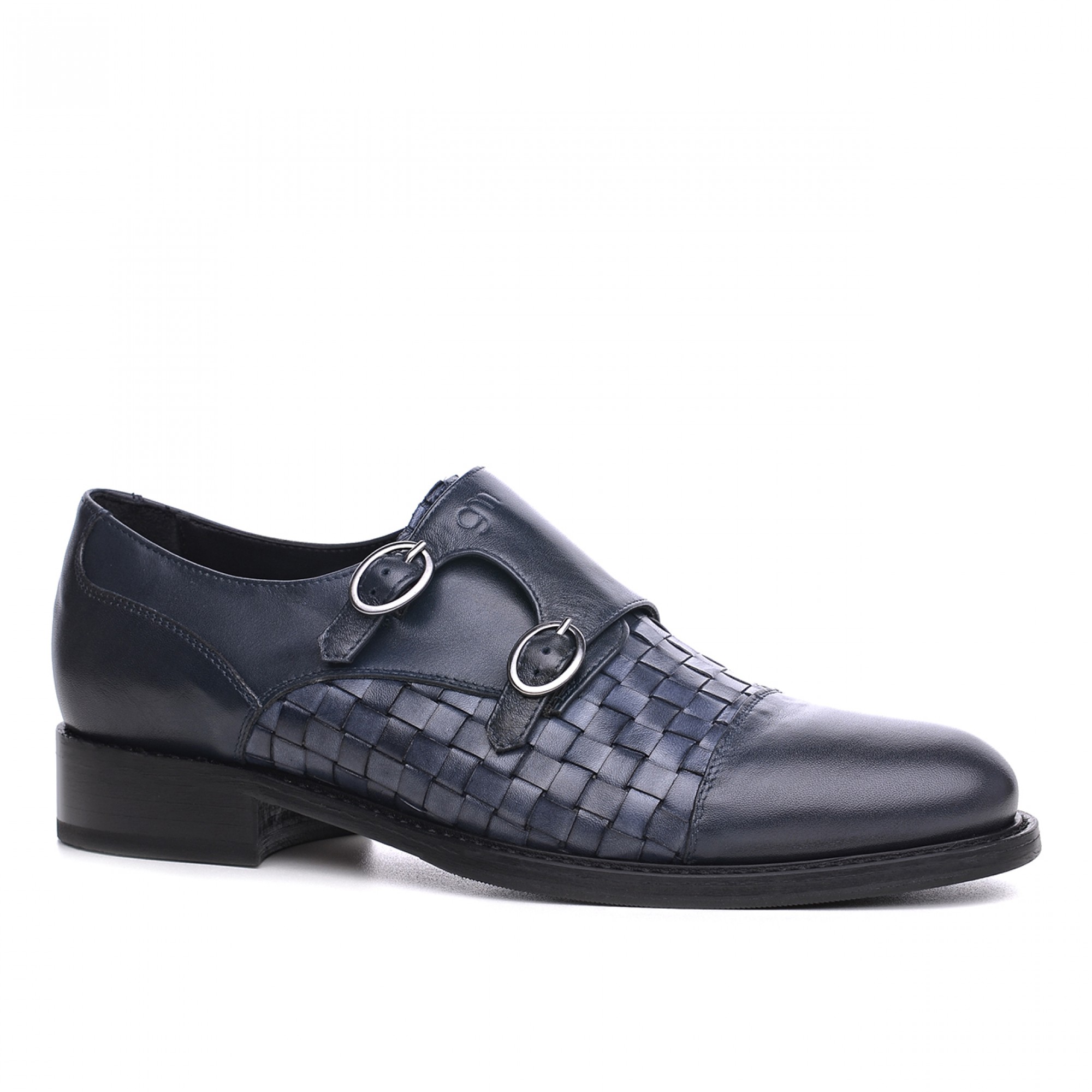 Elevator double buckle shoes with upper in navy blue calf leather and hand-painted braided calfskin featuring shades of colour that range from blue to light blue. The sole is made of genuine leather with anti slip rubber.. Clean lines and refined design for a double buckle that radiates the secrets of a meticulous craftsmanship.