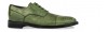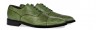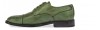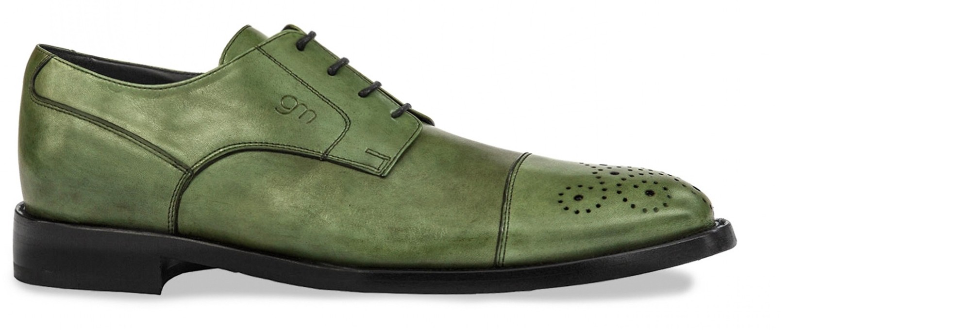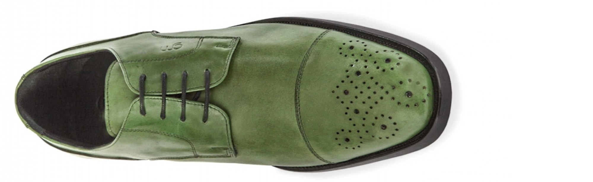 Sartorial design: elevator derby shoes with upper in hand-painted calf leather featuring harmonious shades of green, hand-punched decoration on the toe and stiched leather sole with anti slip rubber.