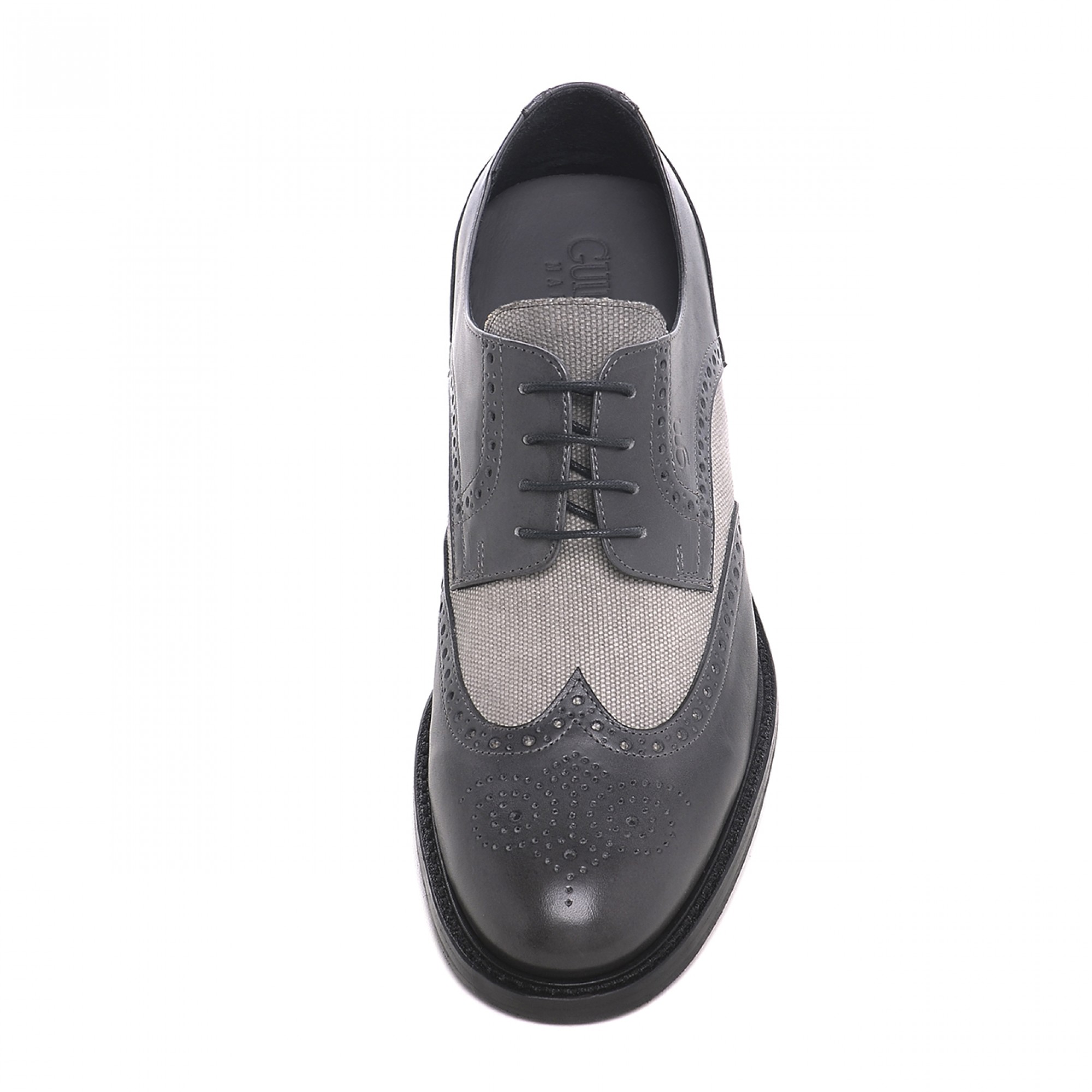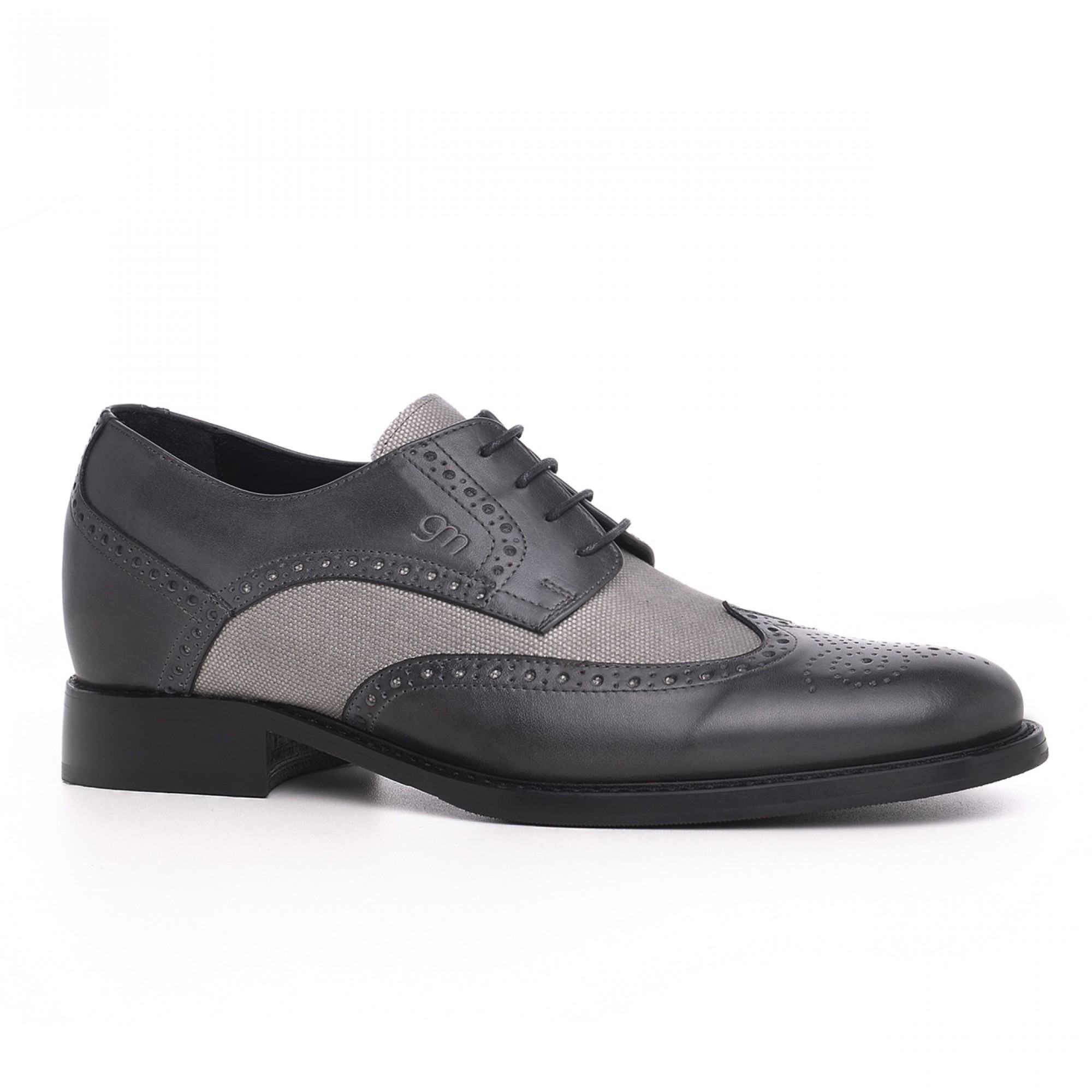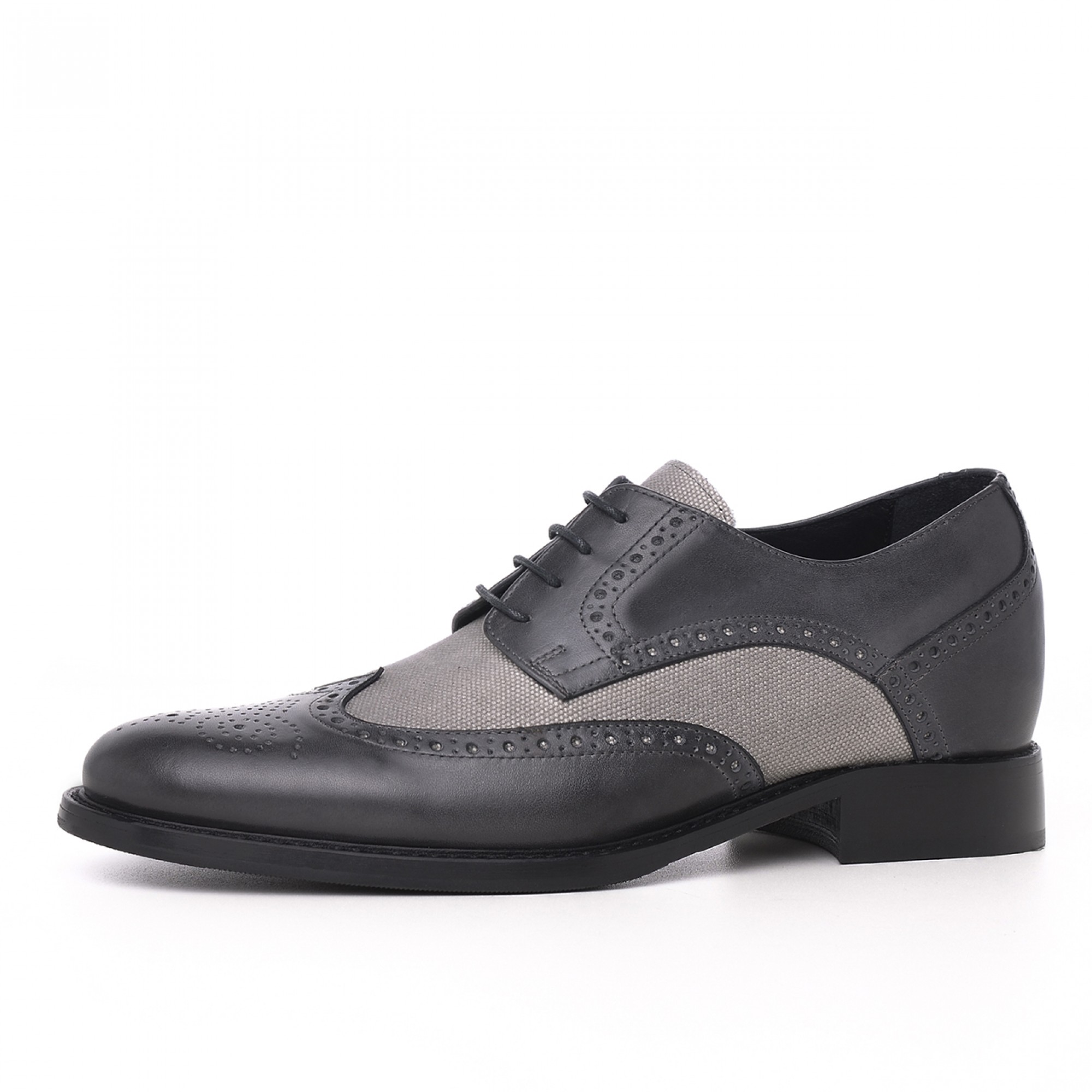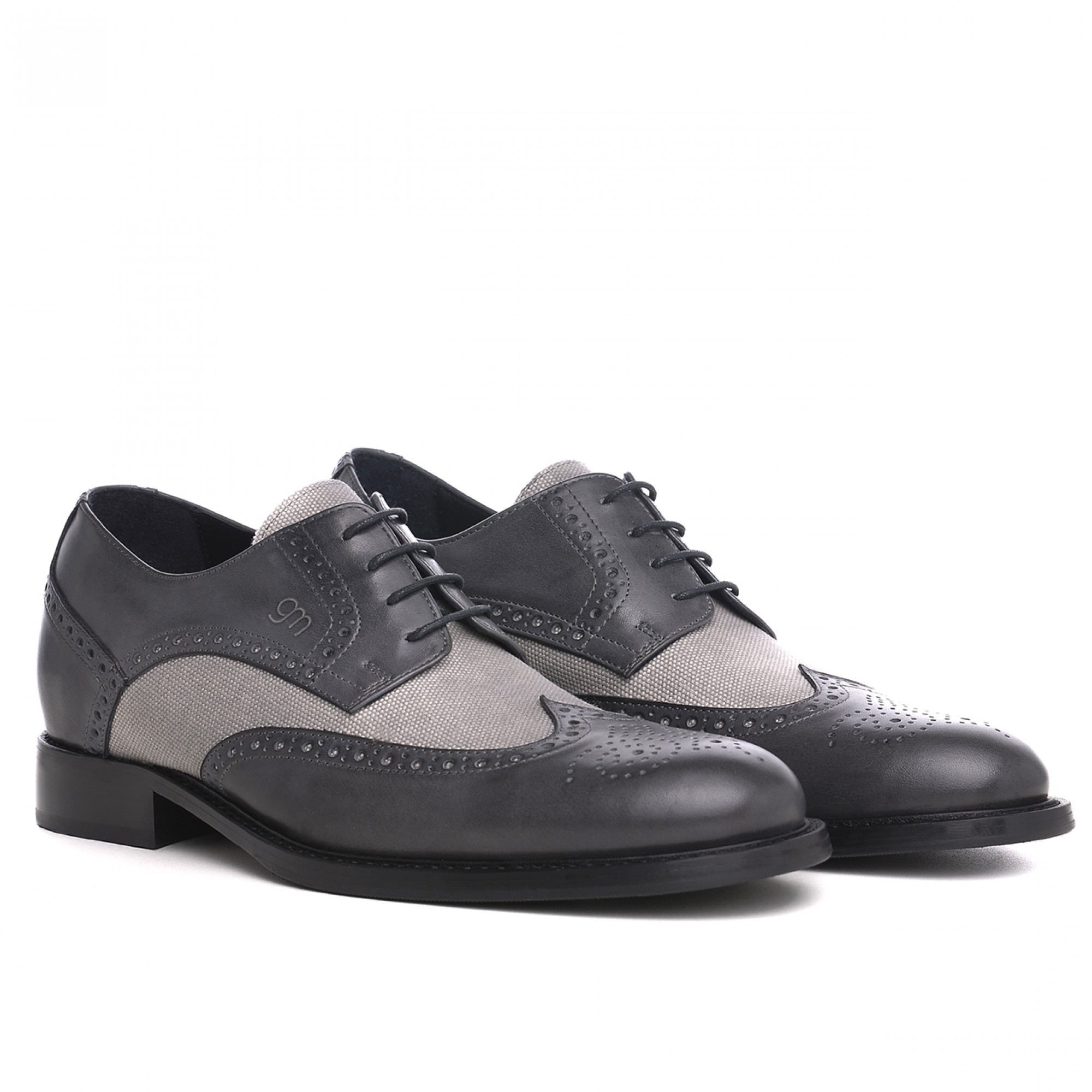 Handcrafted elevator derby shoes with upper in hand-buffered dark grey calfskin leather, light grey fabric details and stiched leather sole with anti slip rubber.