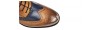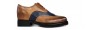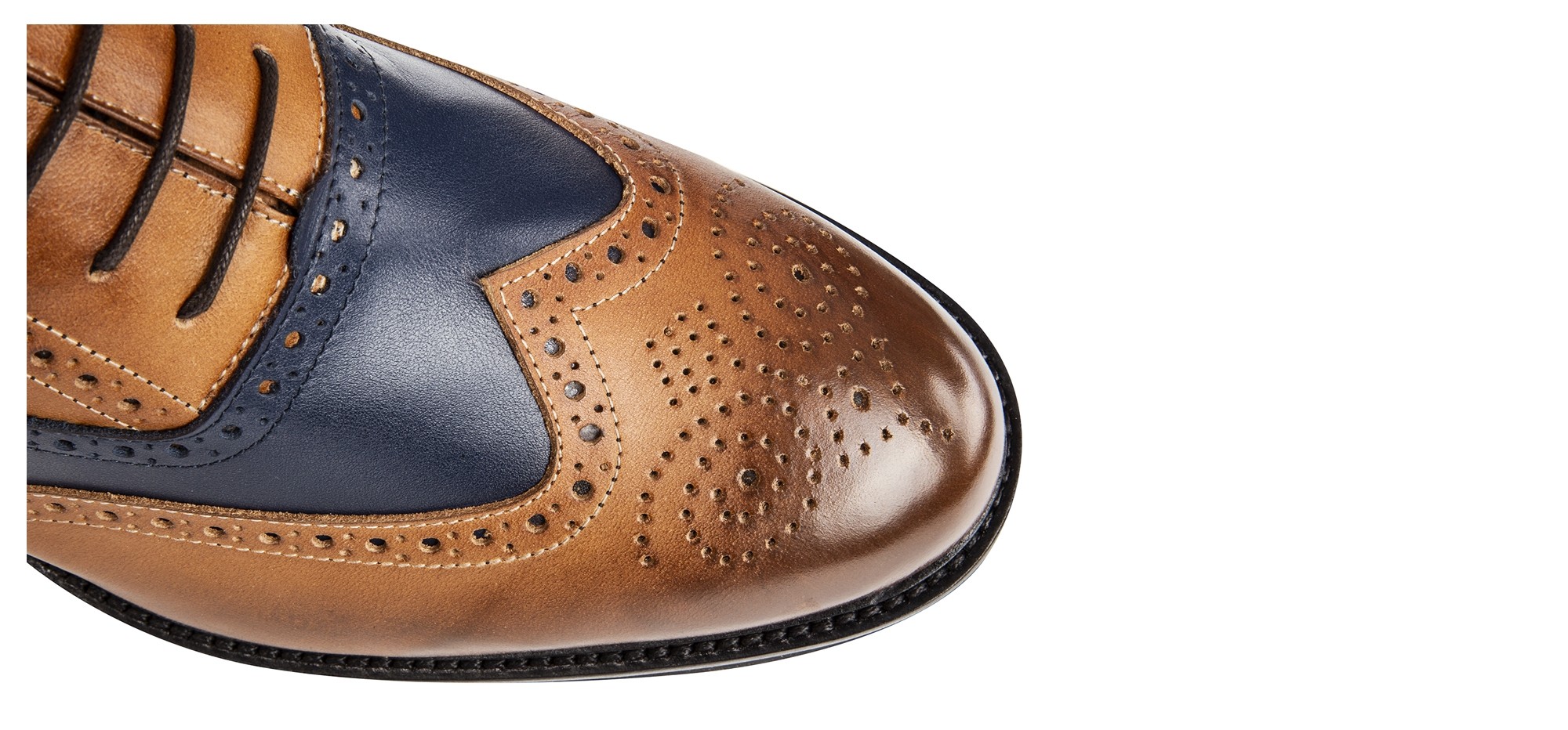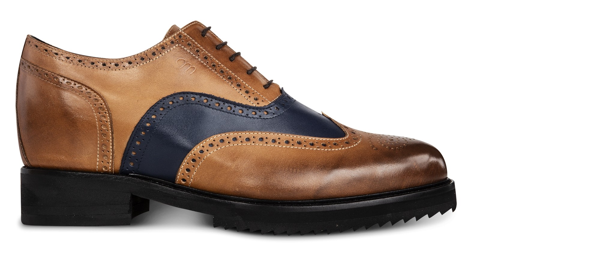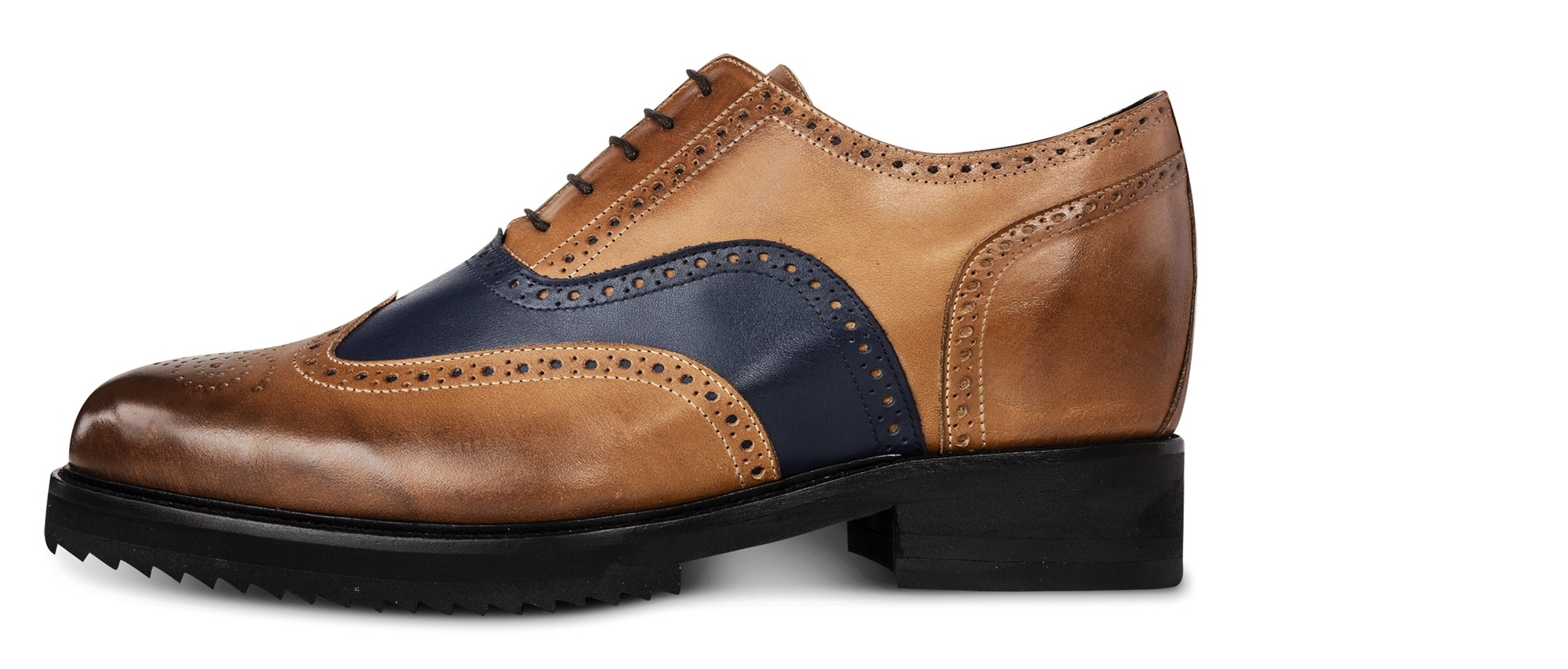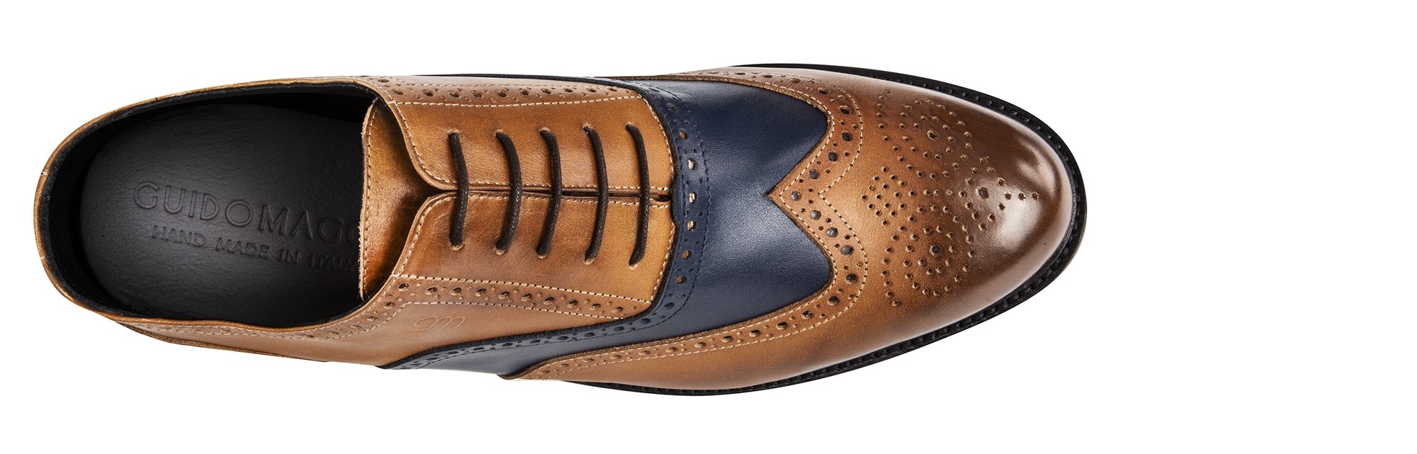 Chic and with defined lines, the GuidoMaggi Oxford elevator shoes with brogue, dovetail and pin, stand out thanks to the attention to details and innovative design. The double-tone's peculiarity makes it even more unique: the buffered cognac and blue combined in an elegant and captivating mix makes them perfect for any outfit.