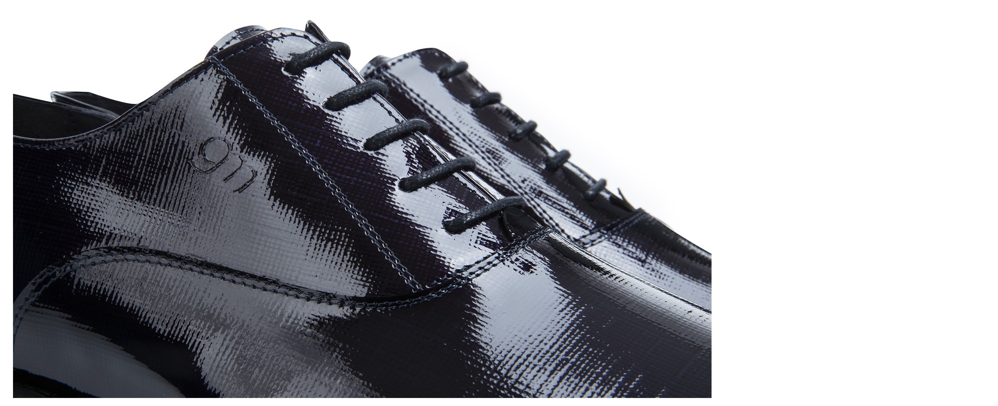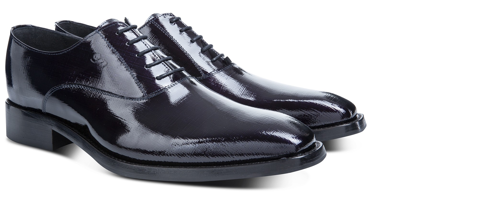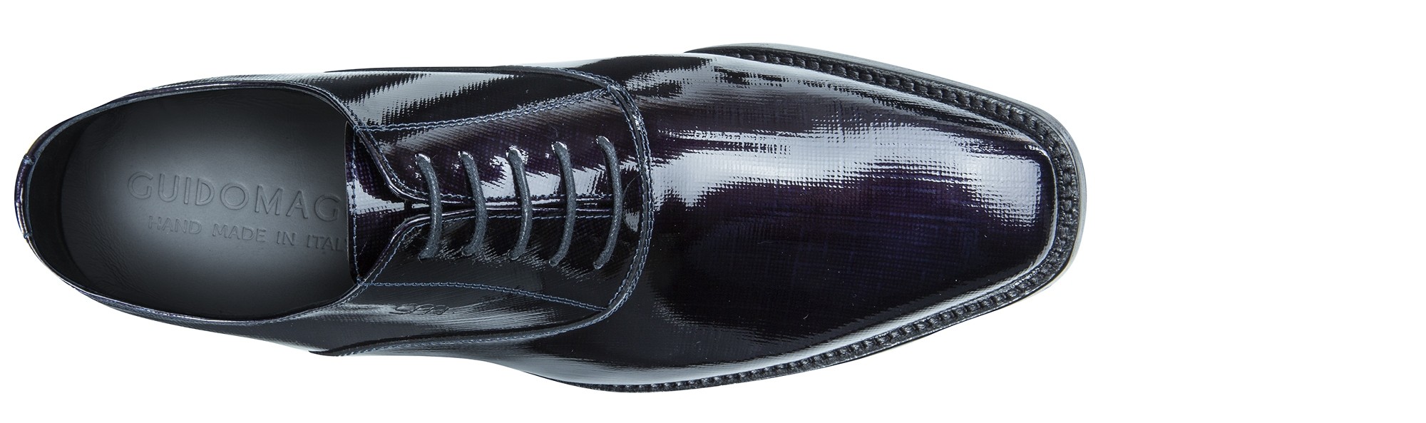 Elegant elevator dress shoes handmade by our master craftsmen with upper in blue patent leather featuring a unique effect and Goodyear stitched leather sole.