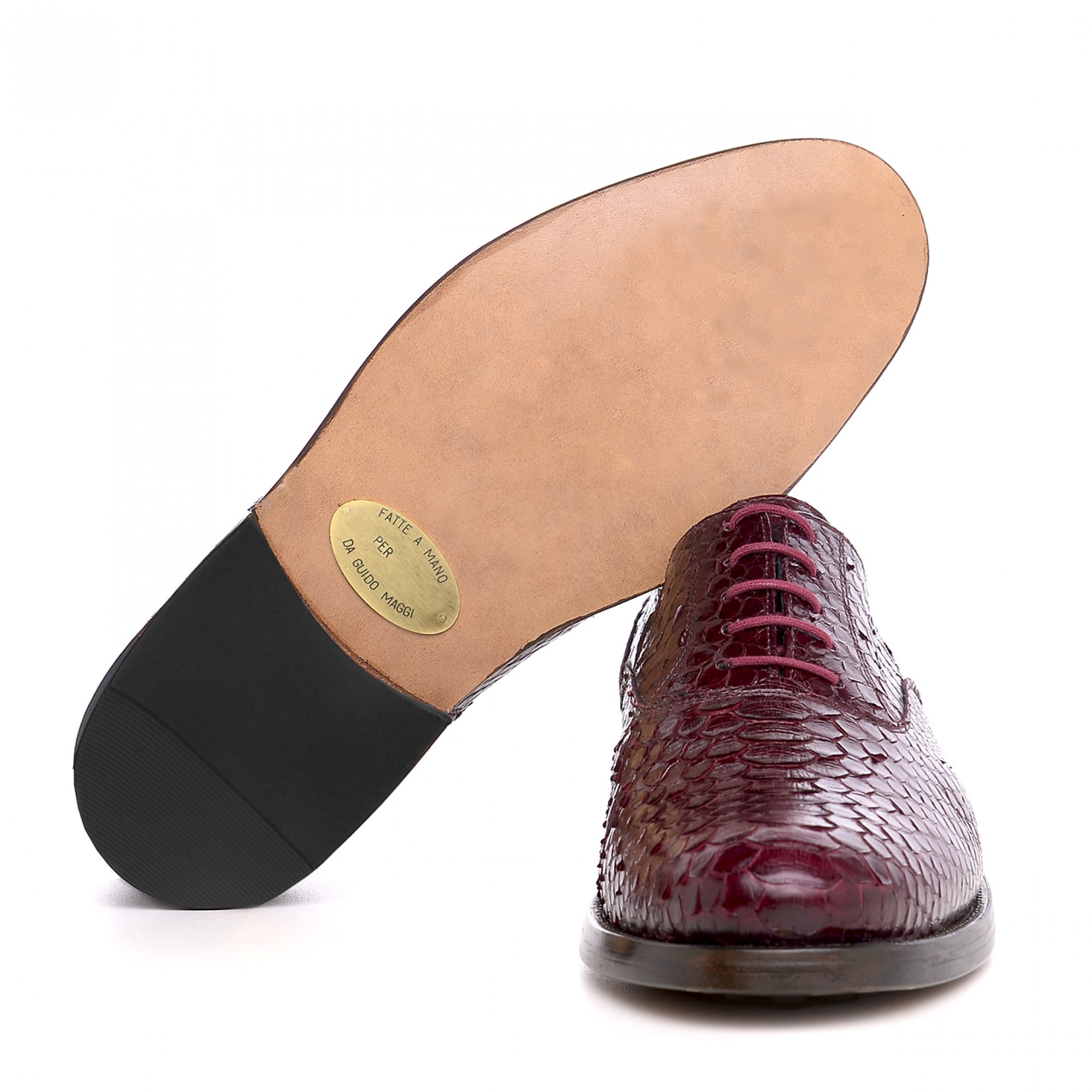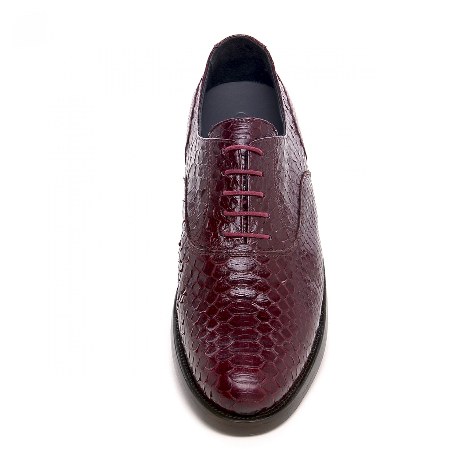 Handmade elevator Oxford shoes with upper in soft burgundy python leather that is characterized by the natural brightness of its scales. The real leather channel stitched sole ensures maximum comfort and greater durability.