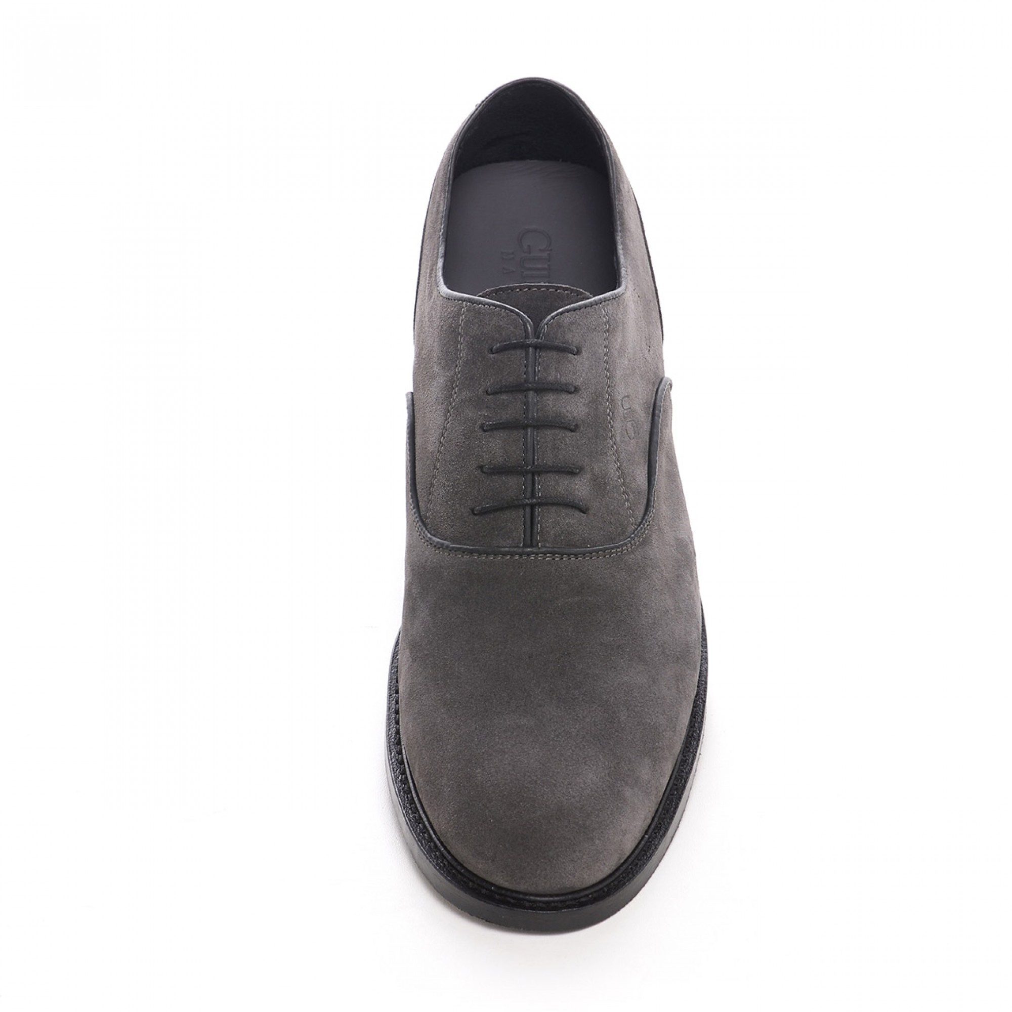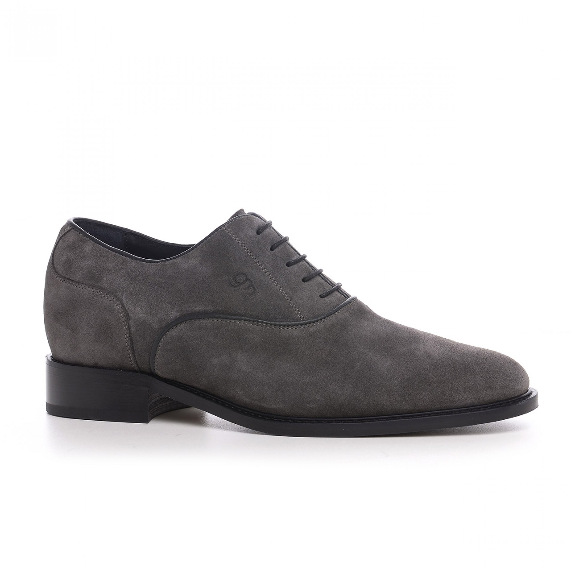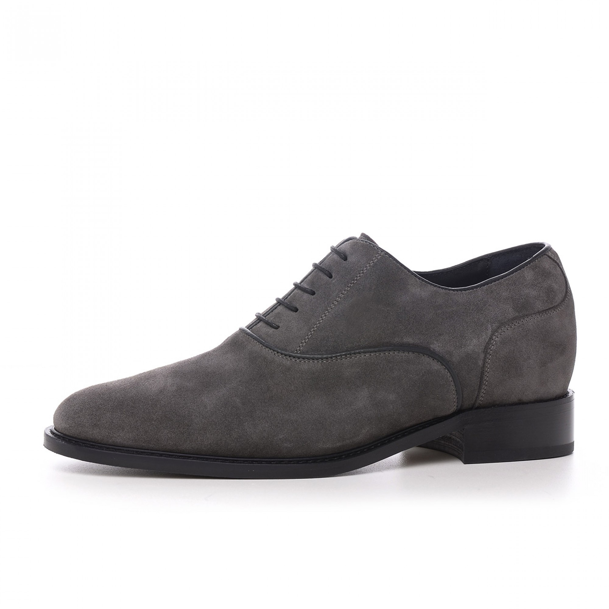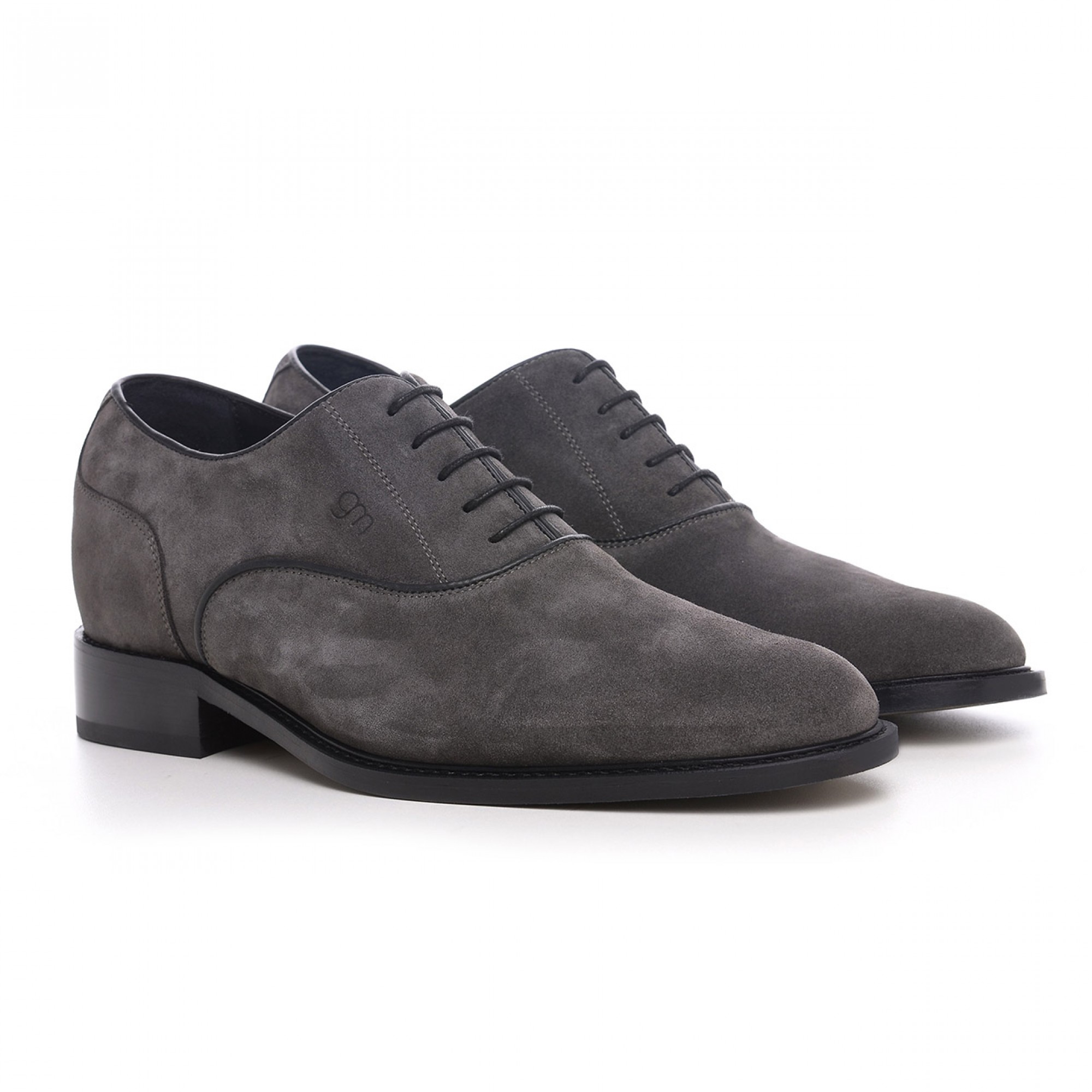 Elevator dress shoe entirely handcrafted in Italy in dark gray suede and real leather sole. An elegant Oxford with inner elevator system up to 3.1 inches (8 cm), made even more exclusive by the Goodyear stitching that ensures greater durability over time.