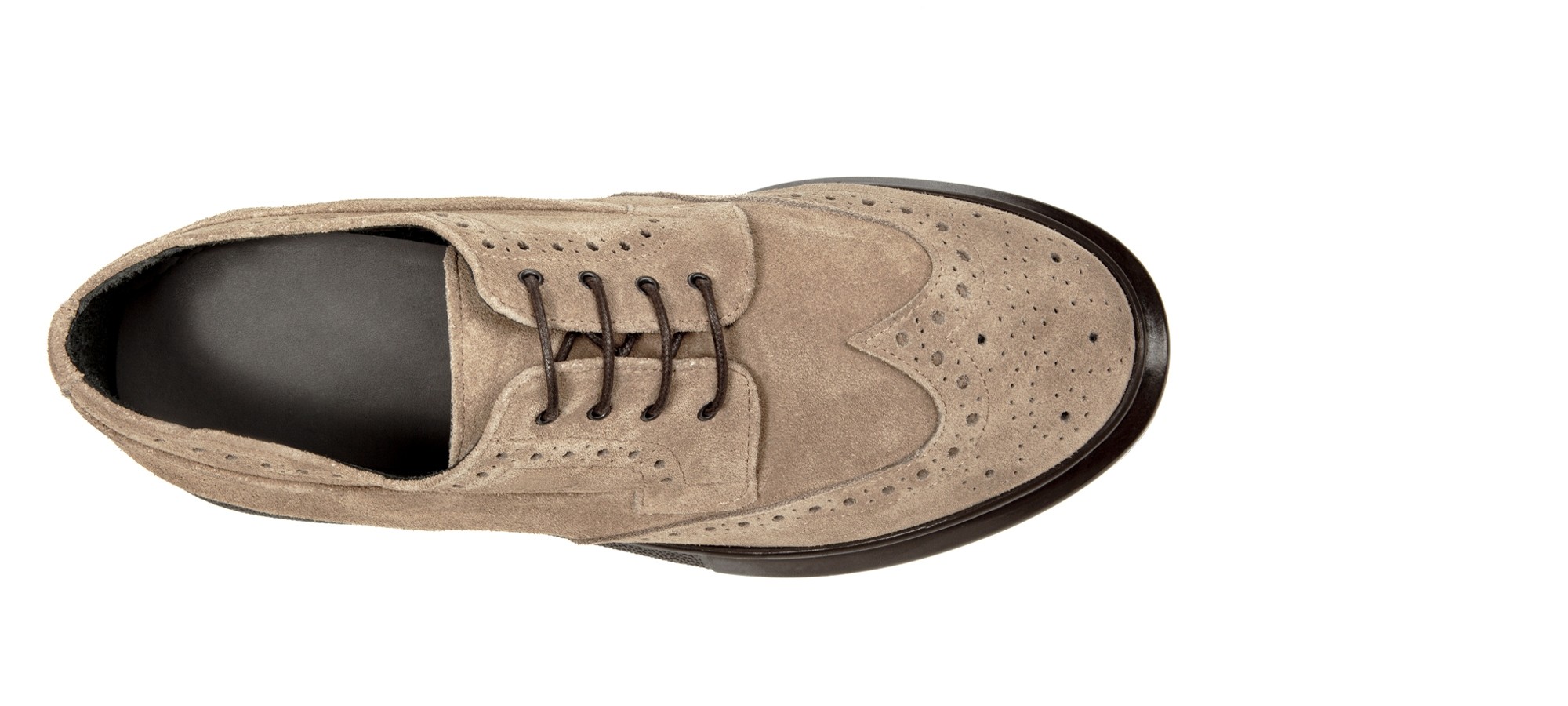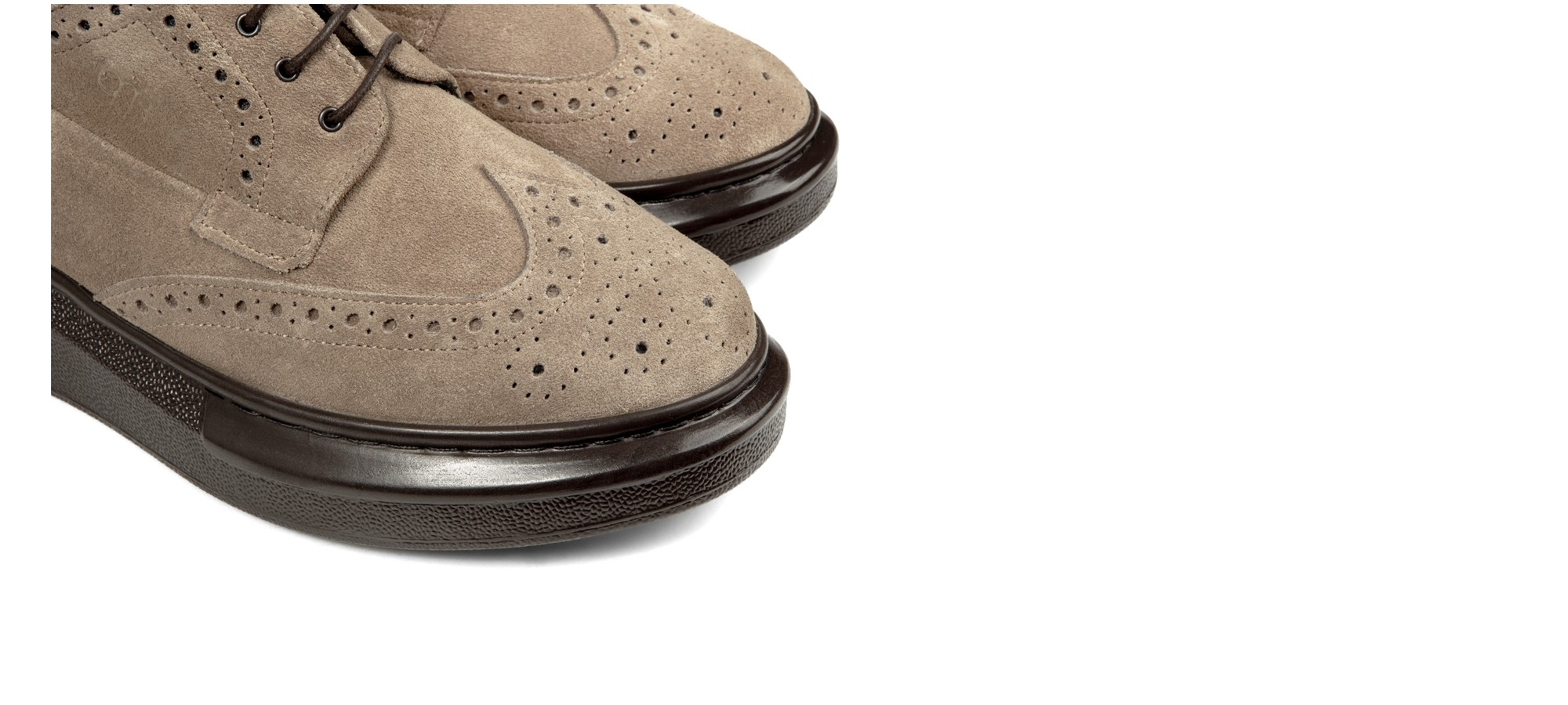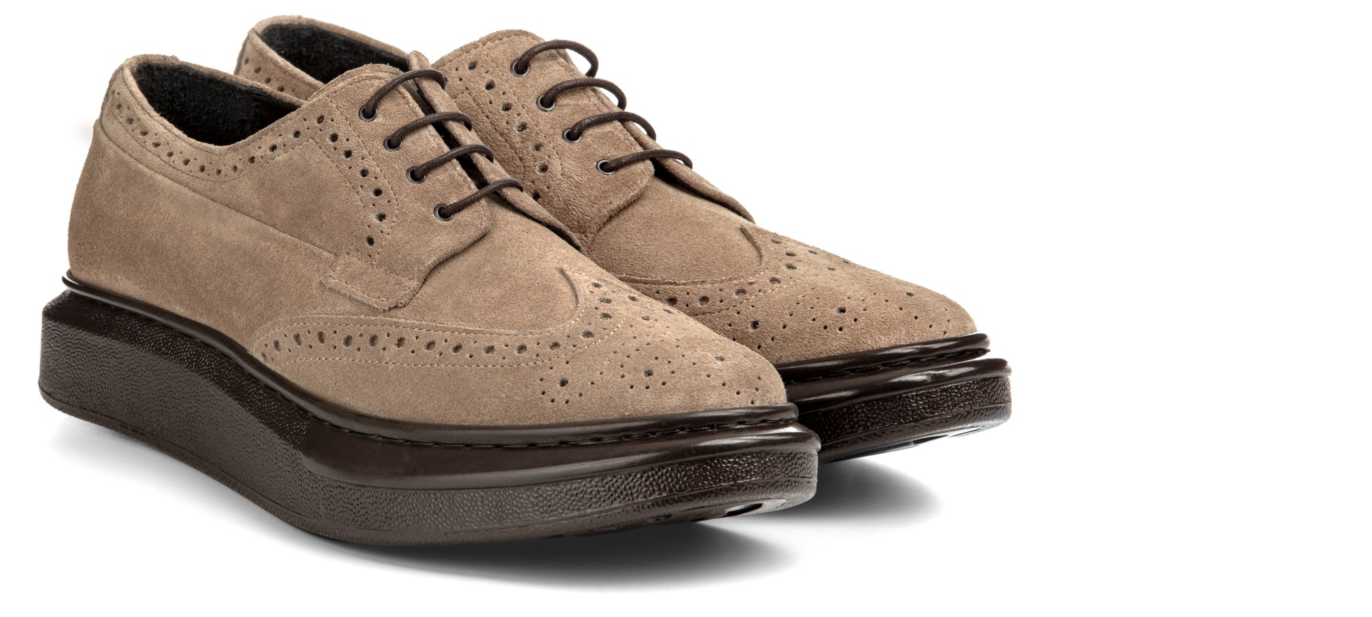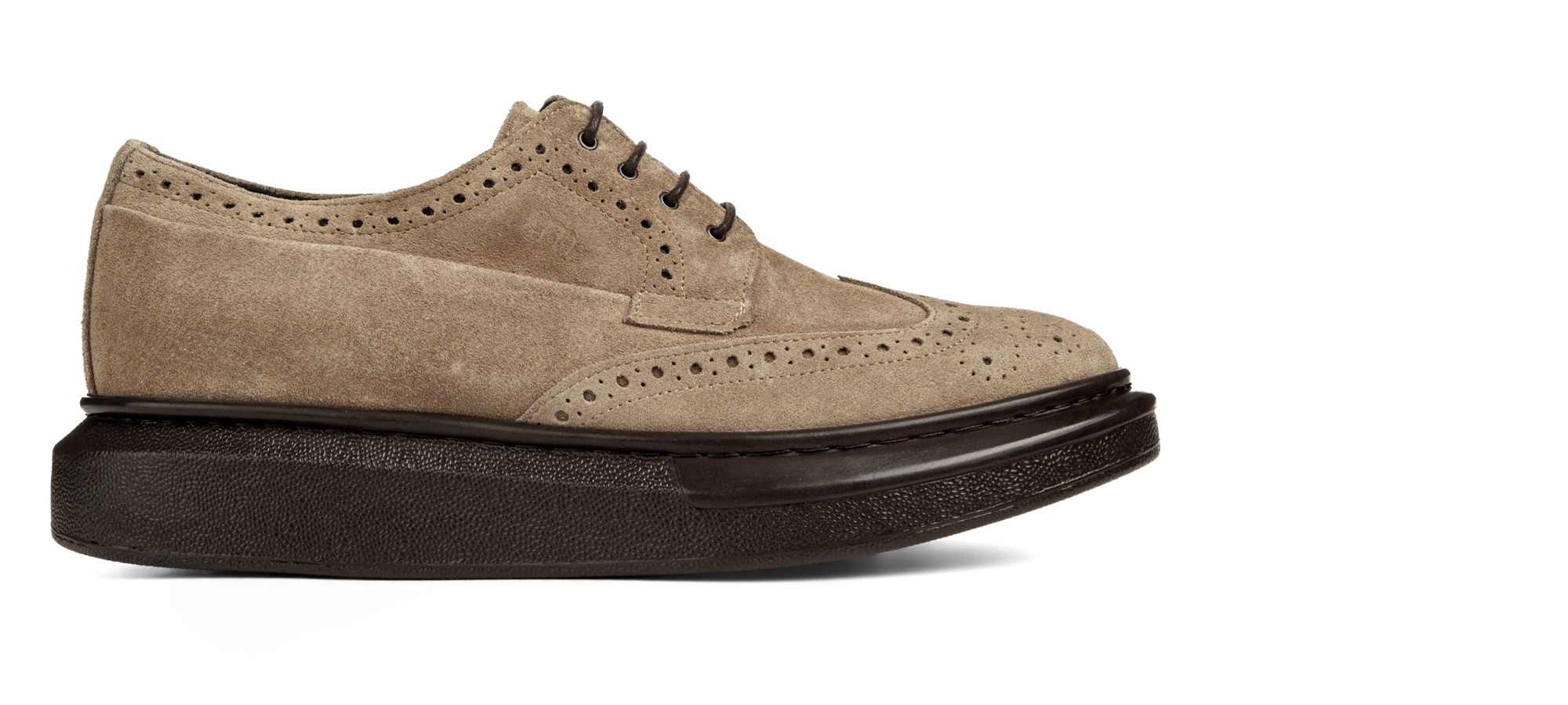 A hybrid, unique and exclusive model that combines the dynamism and comfort of a sneaker sole with the classic elegance of the English brogue. The touch of class is the derby lacing that defines its character and personality. The brown sole is in super-light rubber, the upper in beige suede calfskin with handmade stitching and dovetail decoration. Ideal for any outfit, it gives up to 3.1 inches (8 centimeters) more in height. Handmade in Italy.