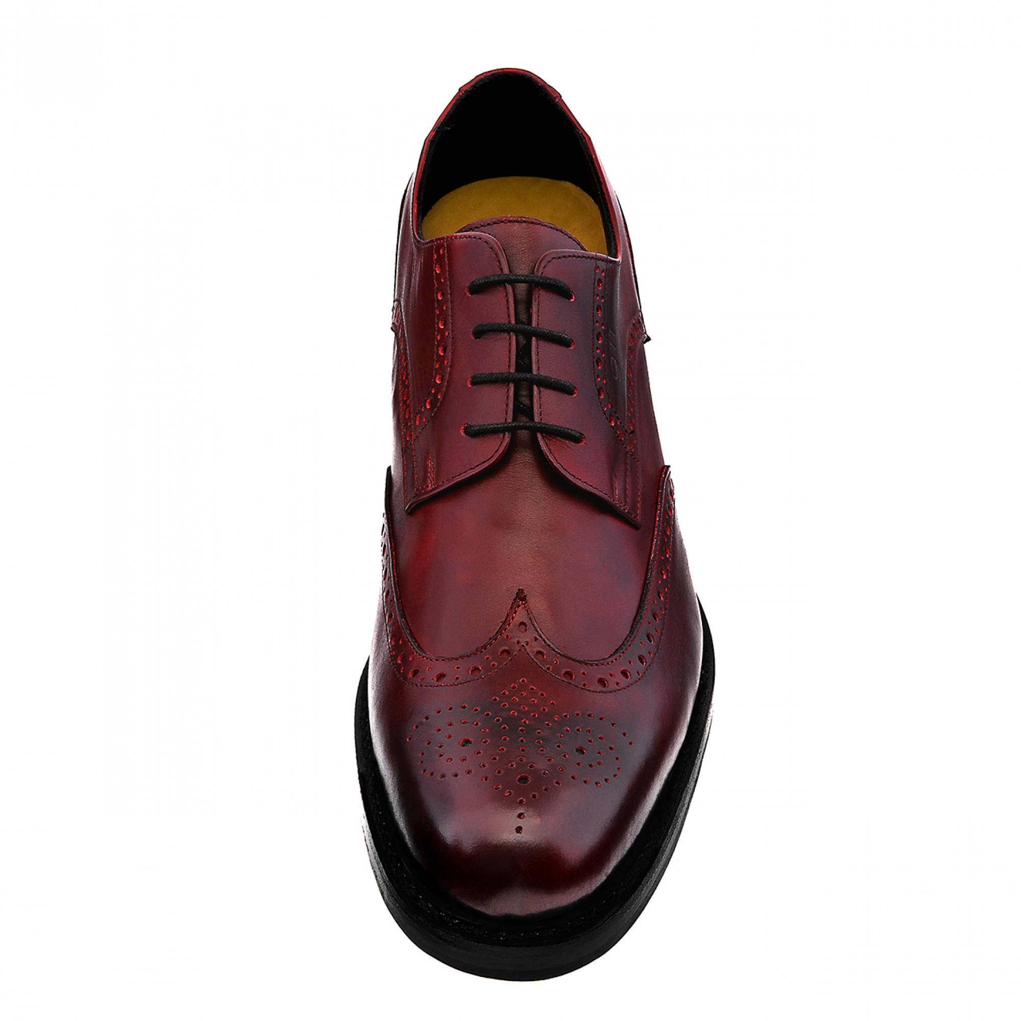 Upper in burnished bordeaux full grain leather. Full soft leather lining. Upper leather, outsole and midsole are sewn at sight. Insole and midsole in genuine leather. Leather heel with special anti-slip rubber. Cotton waxed shoe laces. Handcrafted leather outsole with special anti-slip rubber. Height increase: 2.4 in(6cm) or 2.75in(7cm) or 3.1in(8cm). Hand Made in Italy