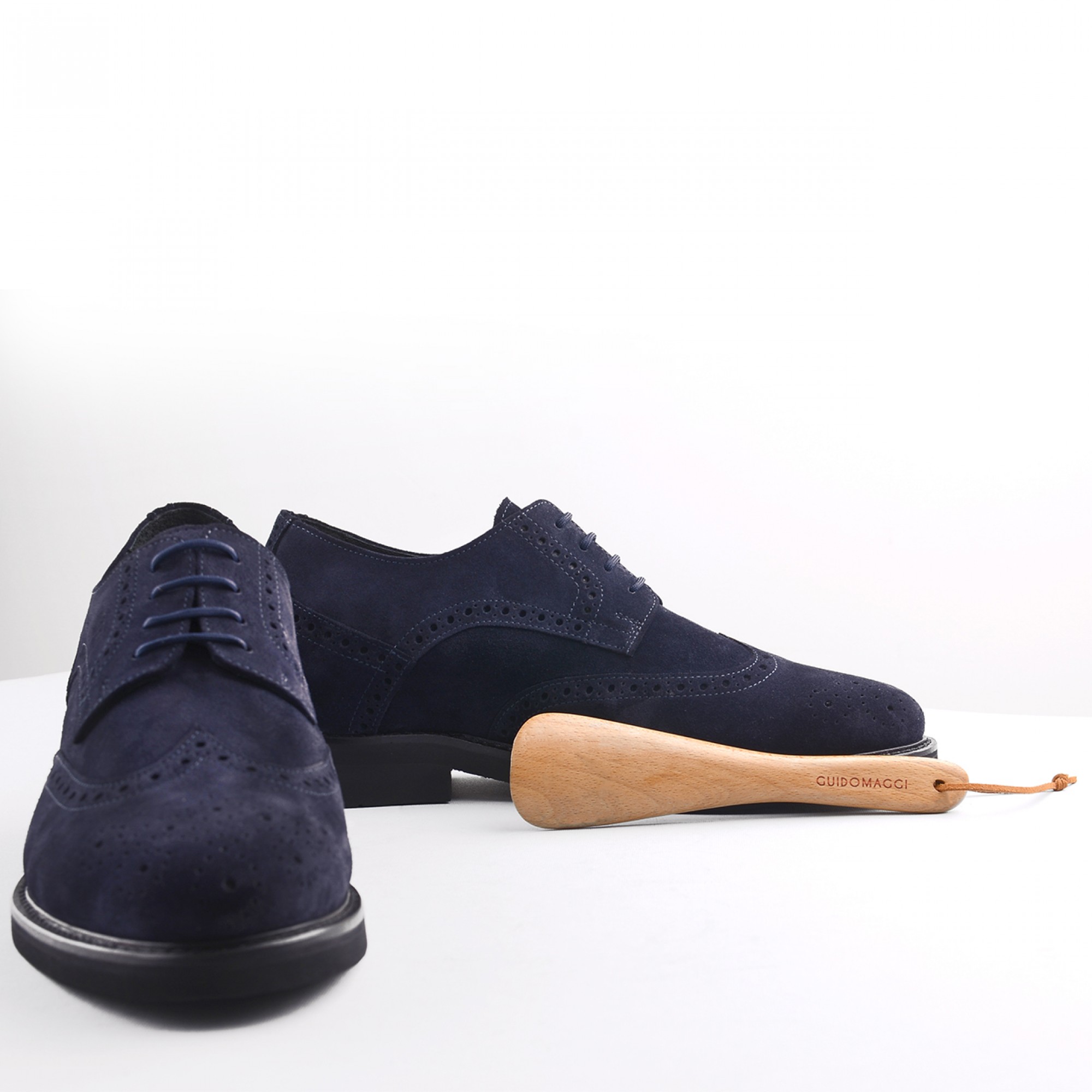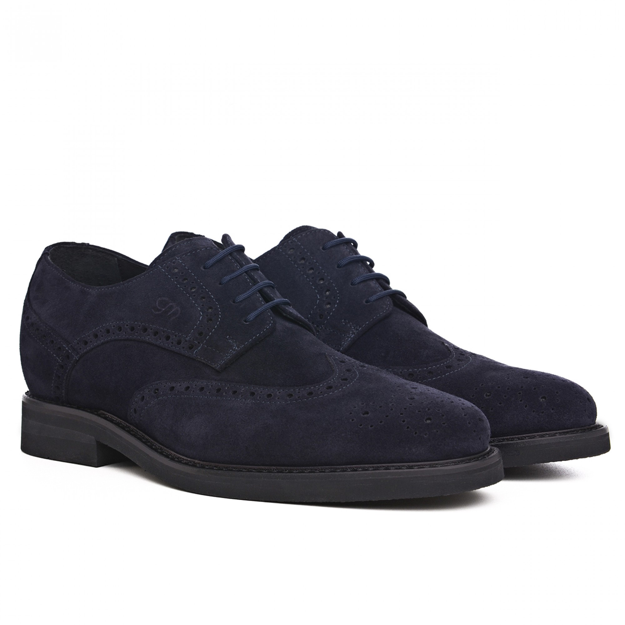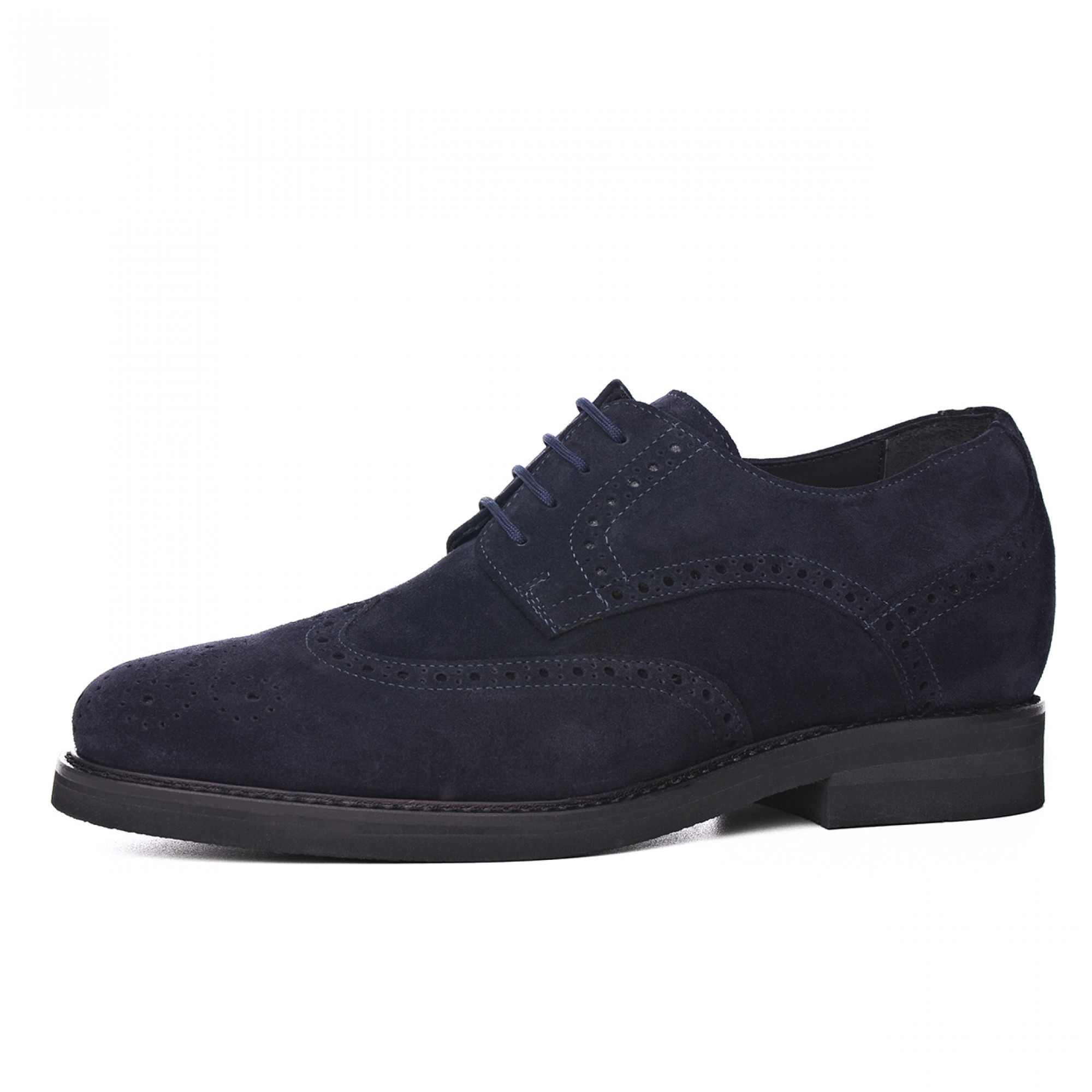 Classic elevator Derby shoe with upper in dark blue suede featuring distinctive hand perforated designs. The Vibram rubber sole ensures maximum comfort.