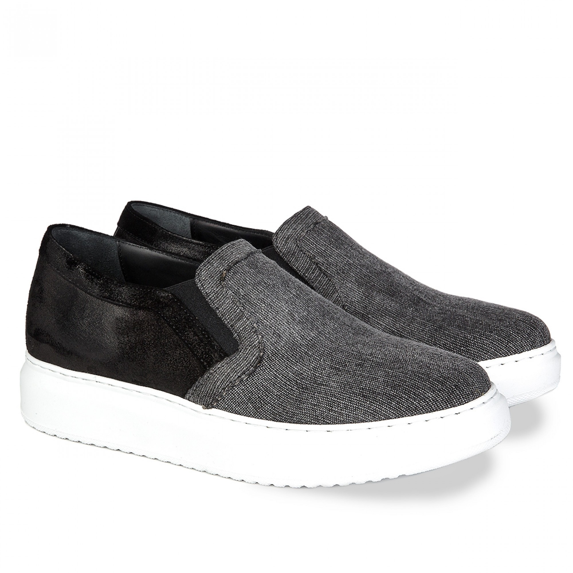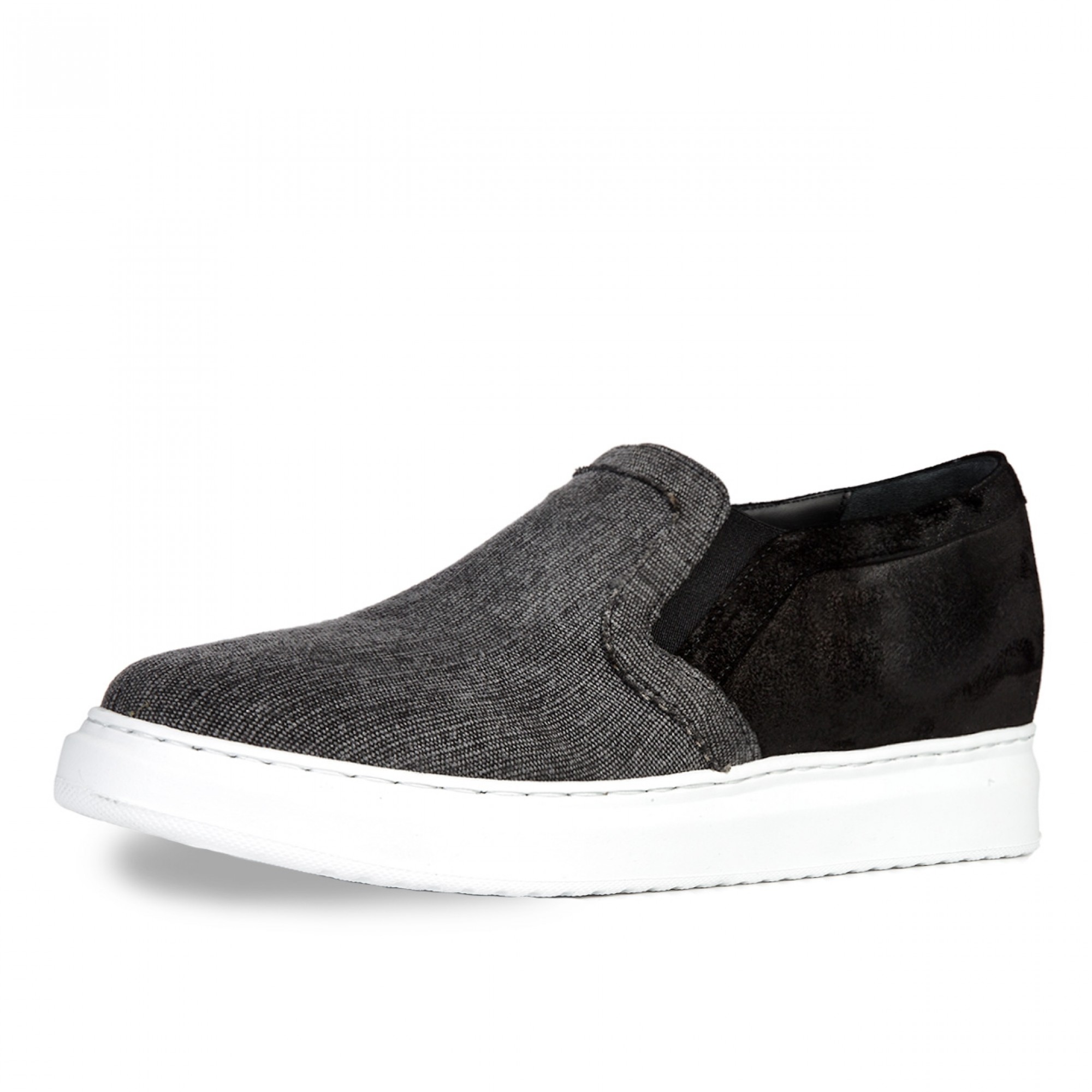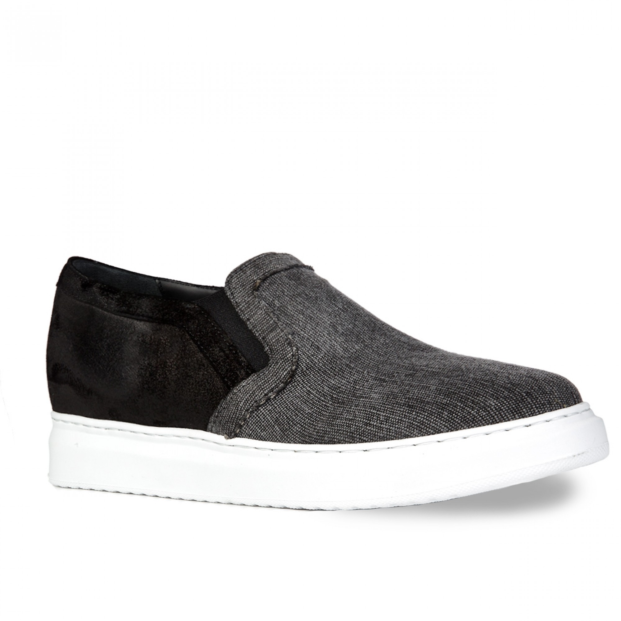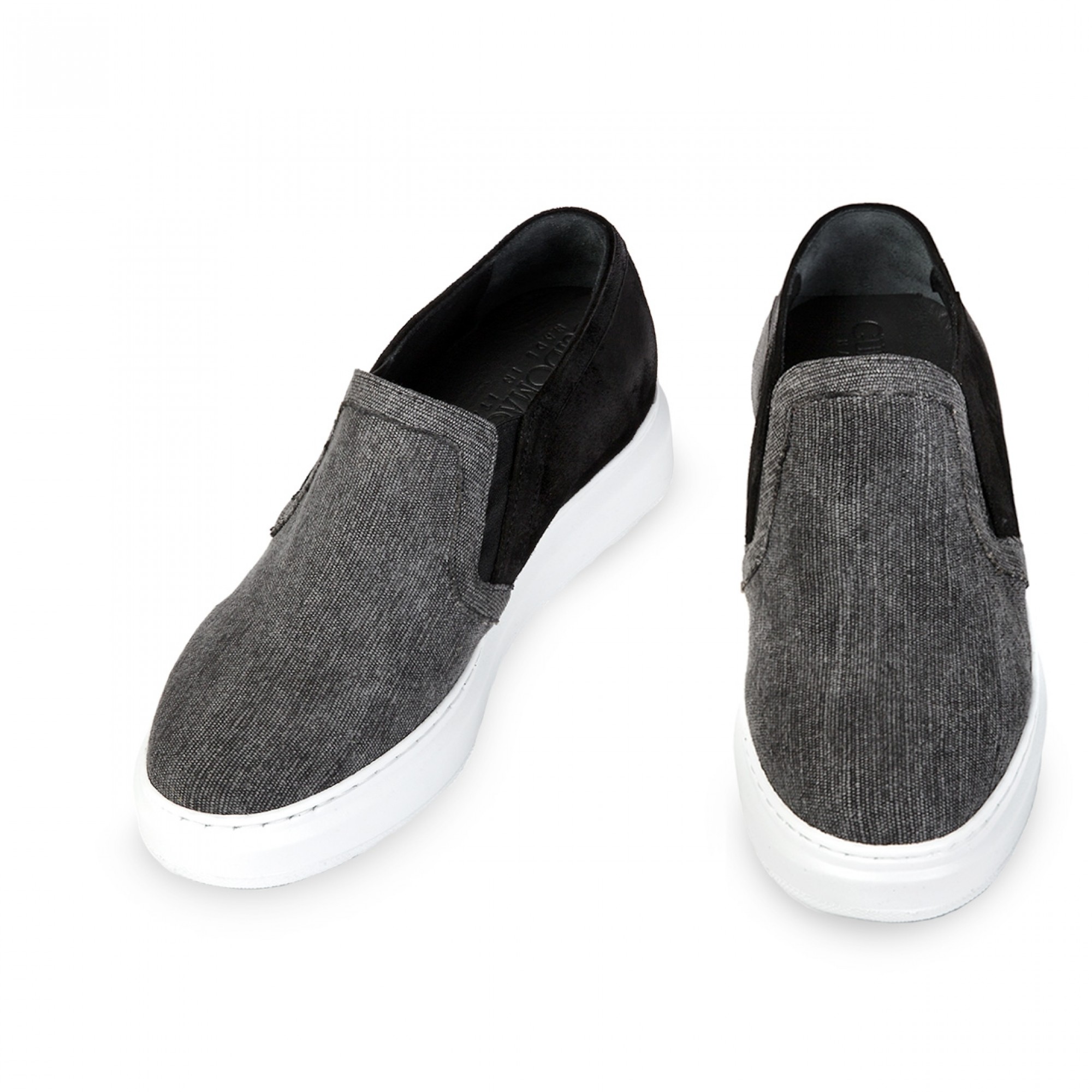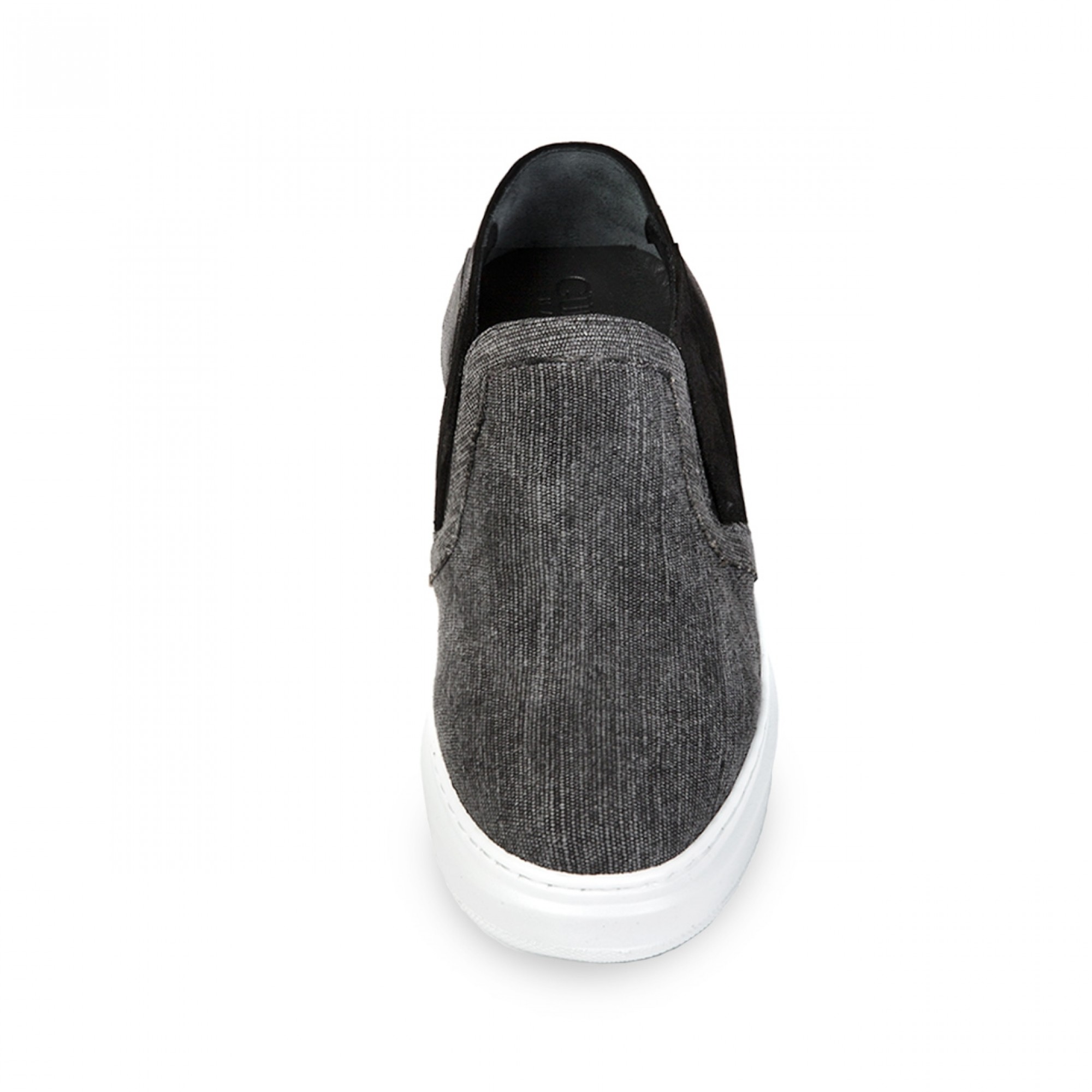 The Black Sea elevated slip-on is made with upper in black greased leather and aged denim effect fabric. The sole is in super light natural rubber.