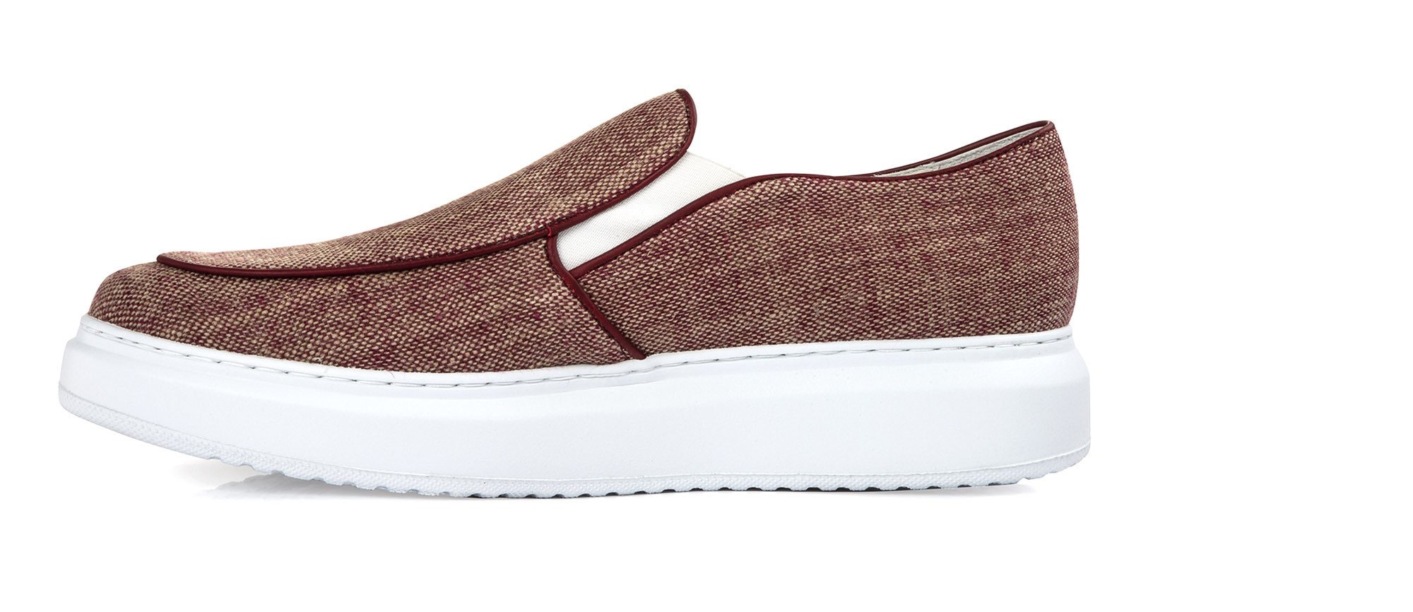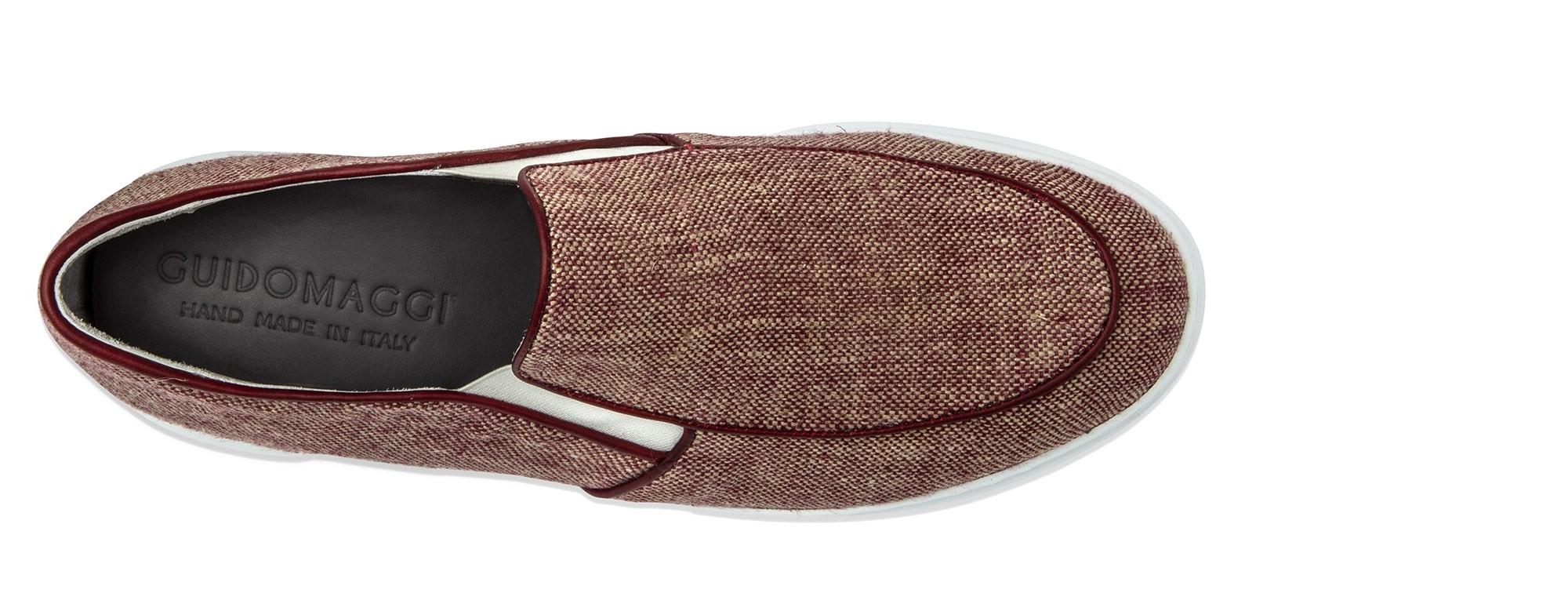 Fire: the symbolic element of passion, comes to life in this elevator slip-on with upper made of fresh cotton fabric with a red/burgundy nuance, finishes and details in tone-on-tone full grain leather. The ultra-light white natural rubber sole makes the walk super comfortable.