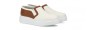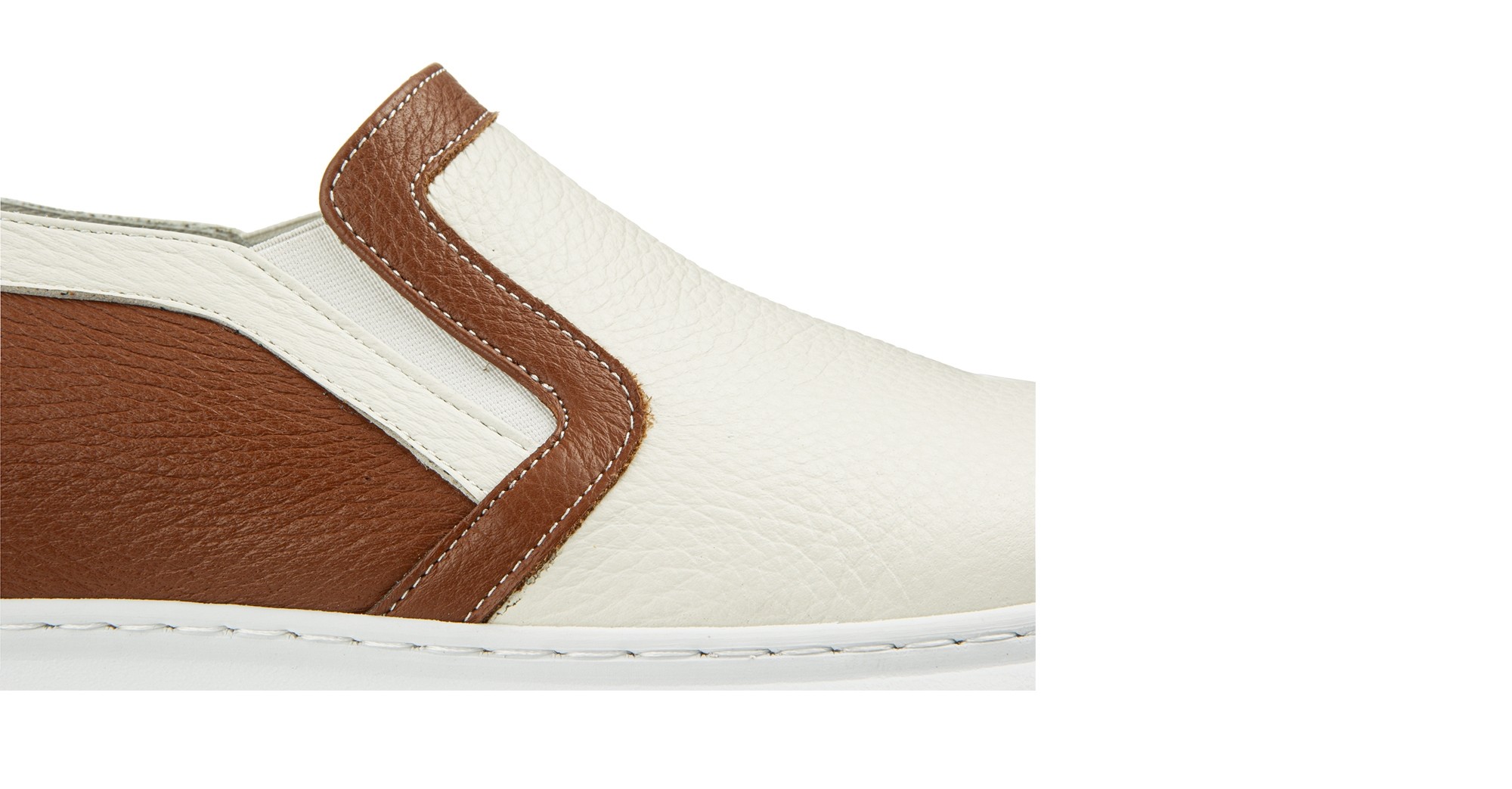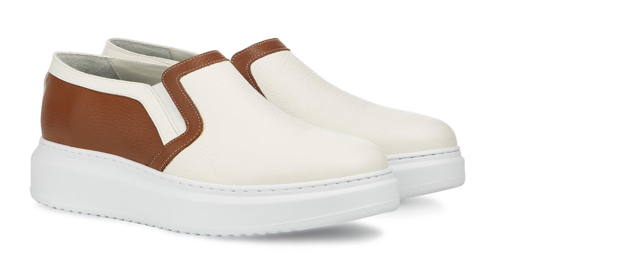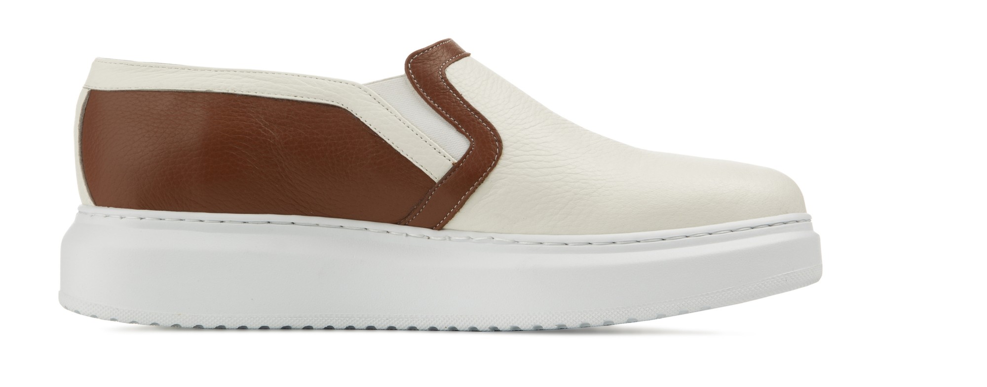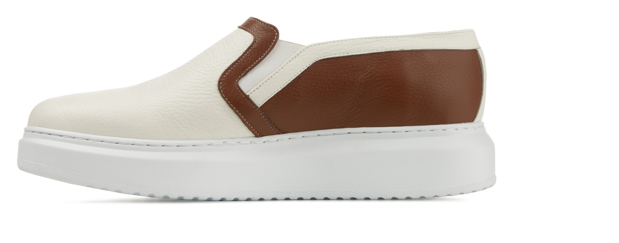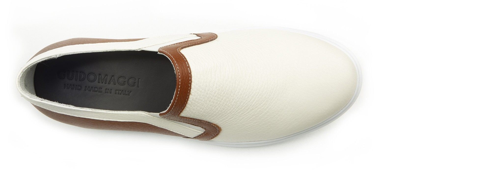 Clean rounded lines for this GuidoMaggi elevator sneaker, an exclusive and top-of-the-line model; the upper is handmade in deer leather, soft and resistant, in shades of brown and white. A comfortable and light shoe, dynamic and cool, that gives up to 2.6" of extra height, thanks to its discreet and comfortable lifting system. The white sole is in super-light natural rubber. 100% made in Italy.