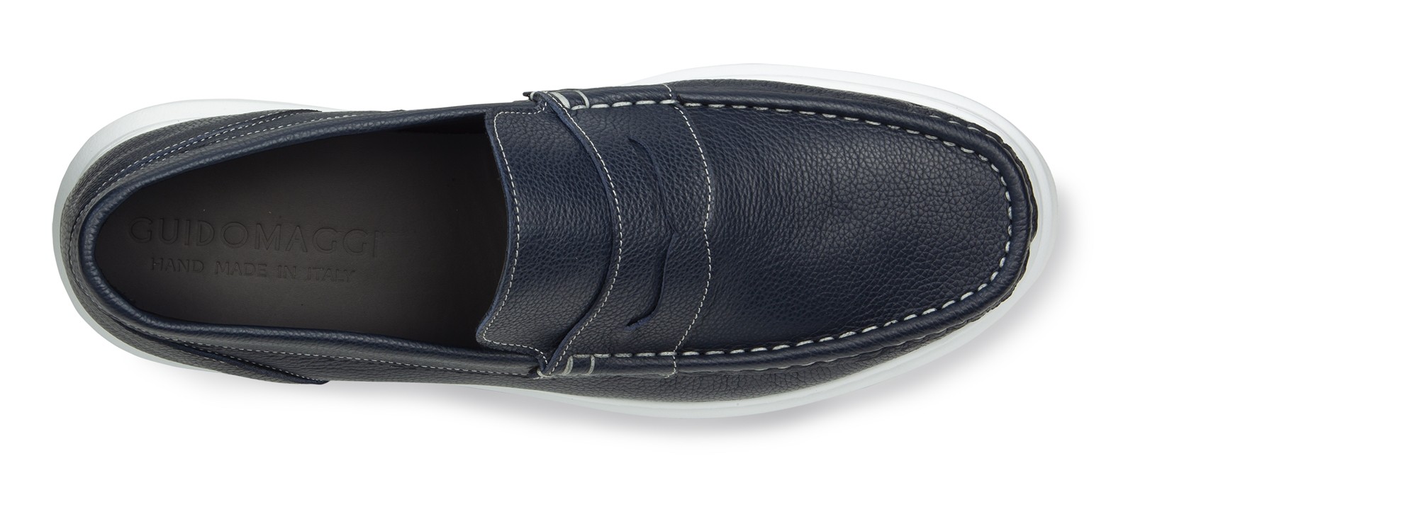 A hybrid elevator model that combines the dynamism of the sports shoe with the refinement of the classic moccasin with a clamp. The upper is handmade by GuidoMaggi master craftsmen in deerskin: super soft, resistant and with a great fit. With white contrast stitching, it's ideal for casual-chic boat looks and adds up to 2.6" (6.5 cm) of extra height. Handmade in Italy.