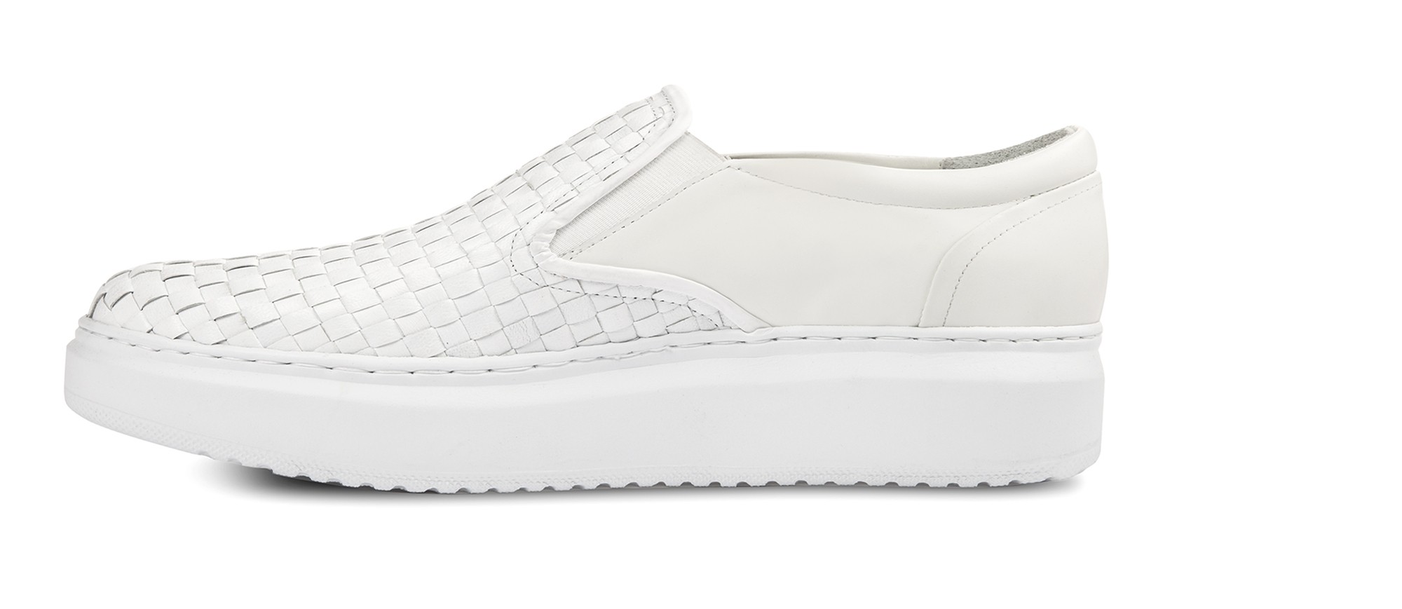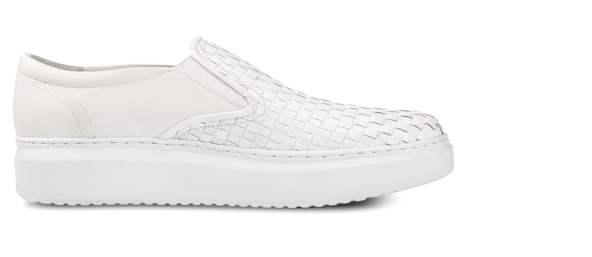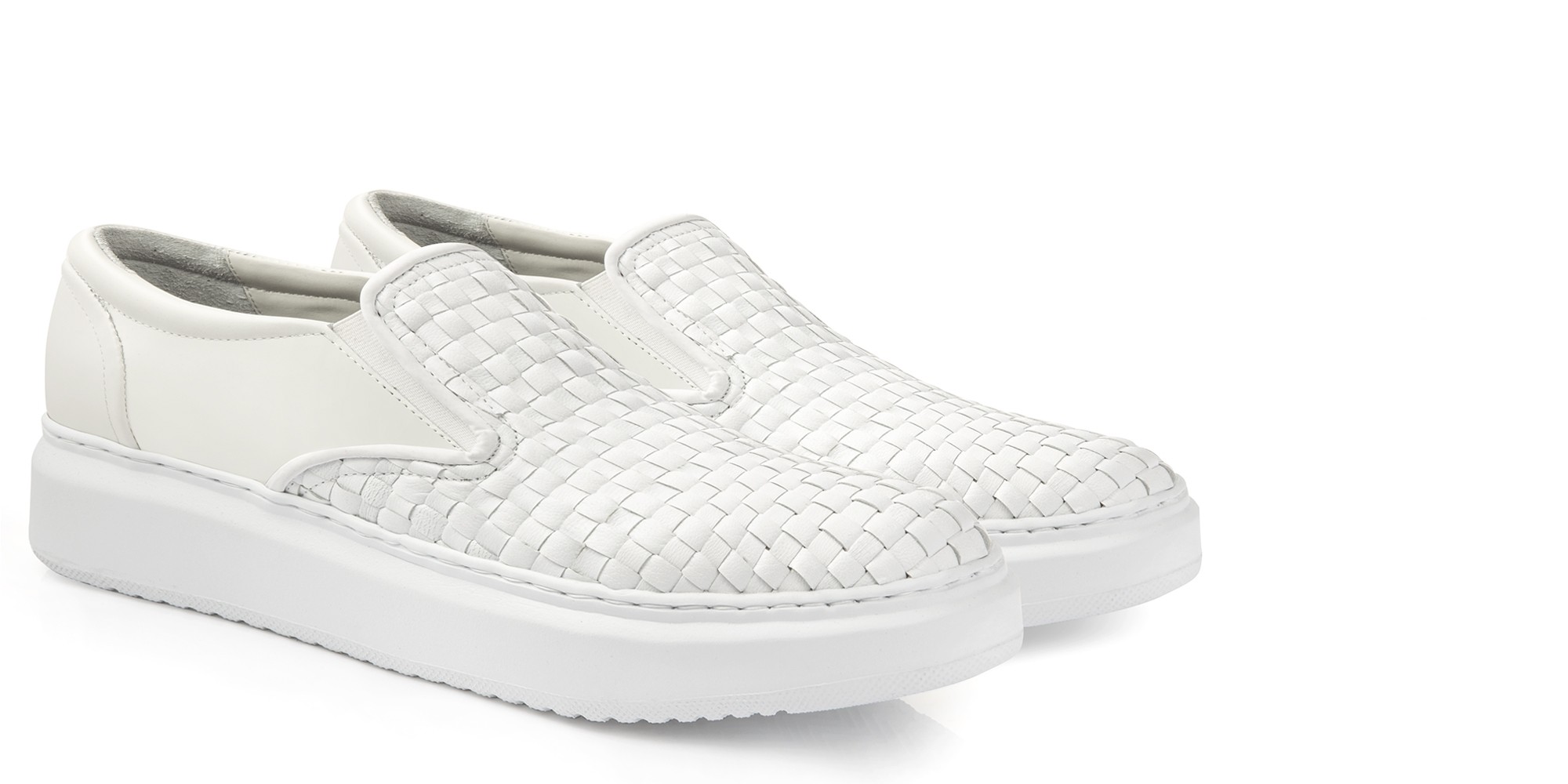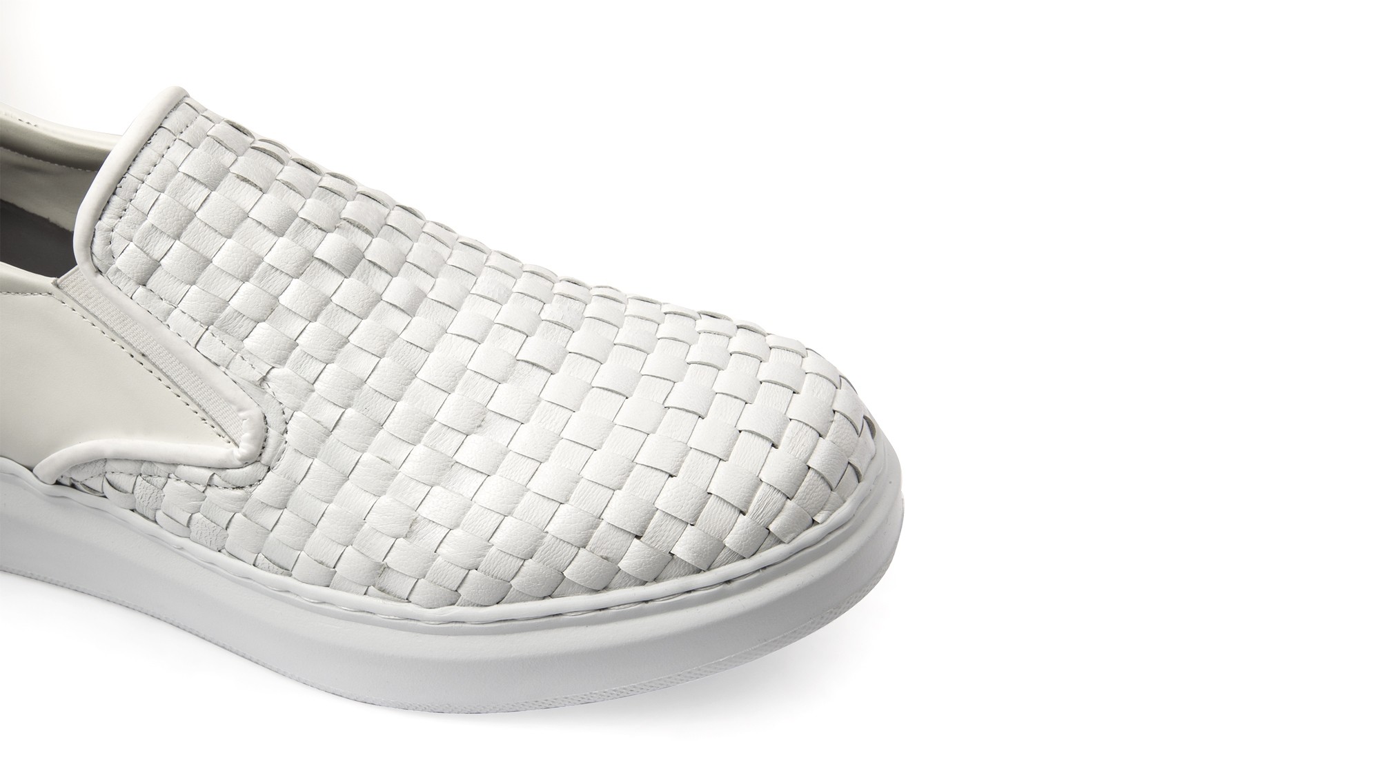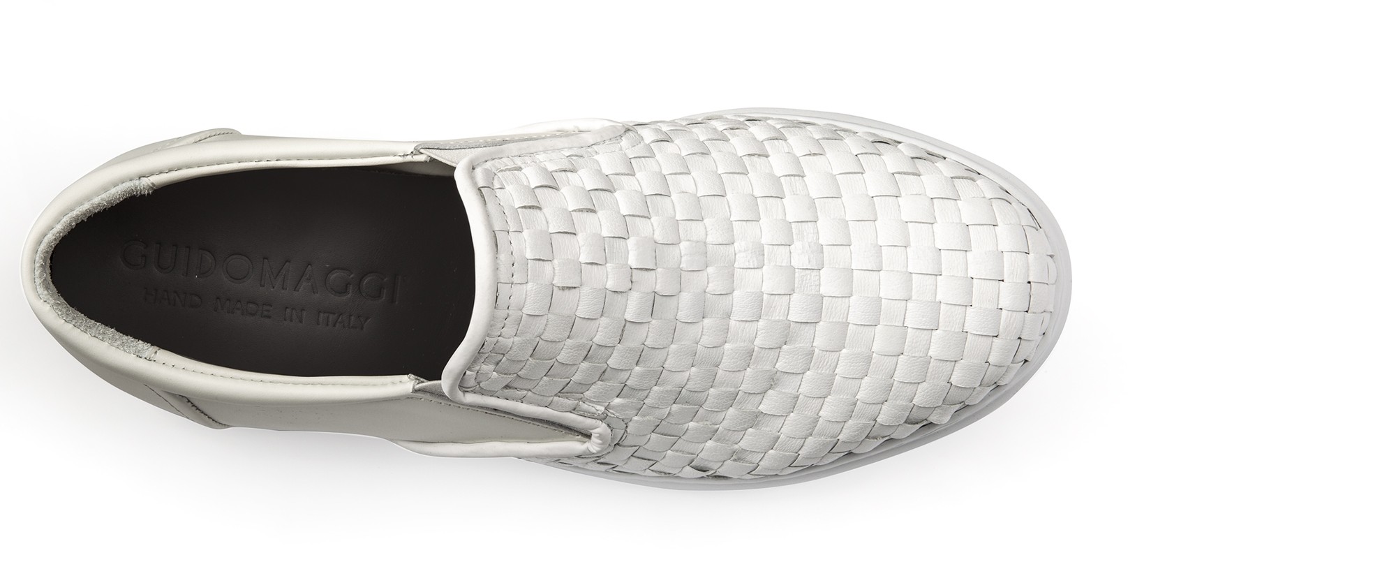 The iconic details and the two types of leather add an extremely refined touch to this versatile slip-on. The upper is made of white hand-woven calf leather on the front and full-grain Tuscan leather on the back. The sole is in ultra lightweight natural rubber.