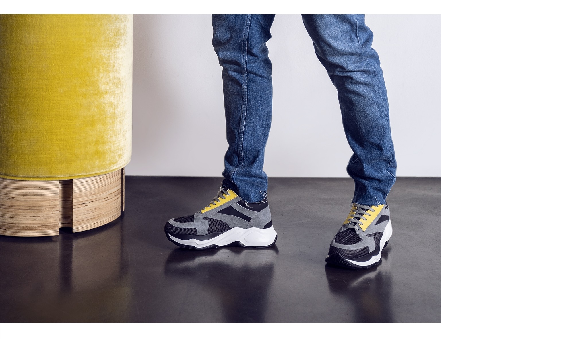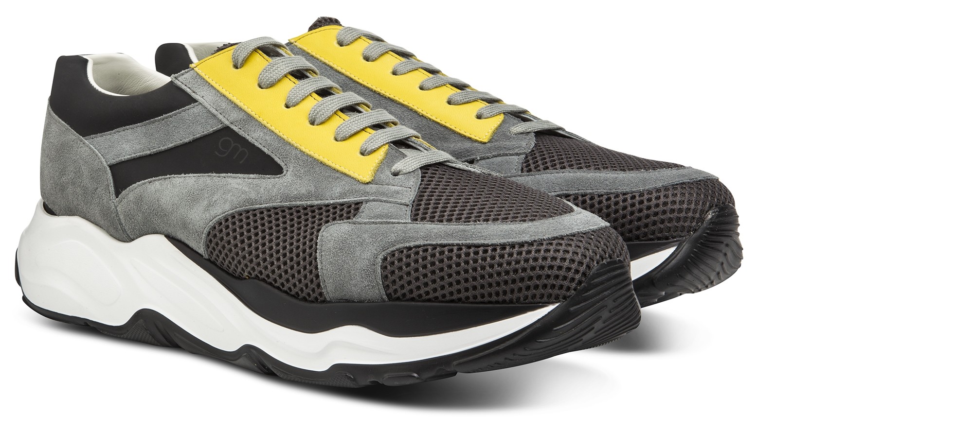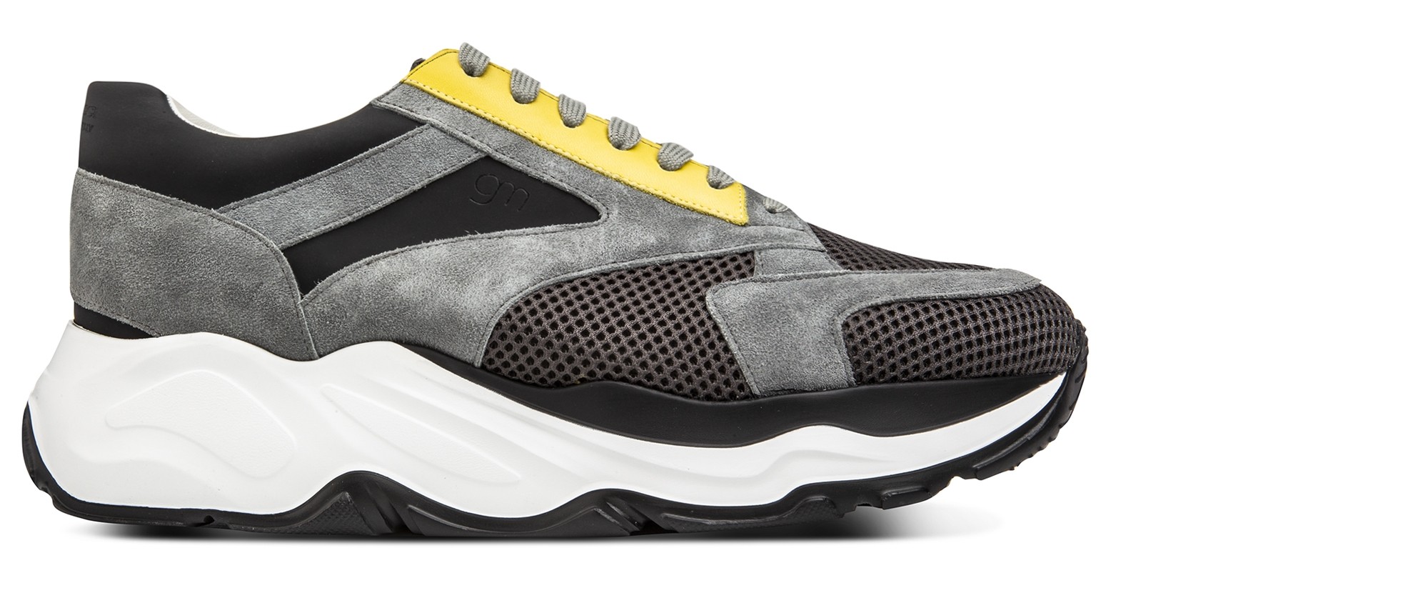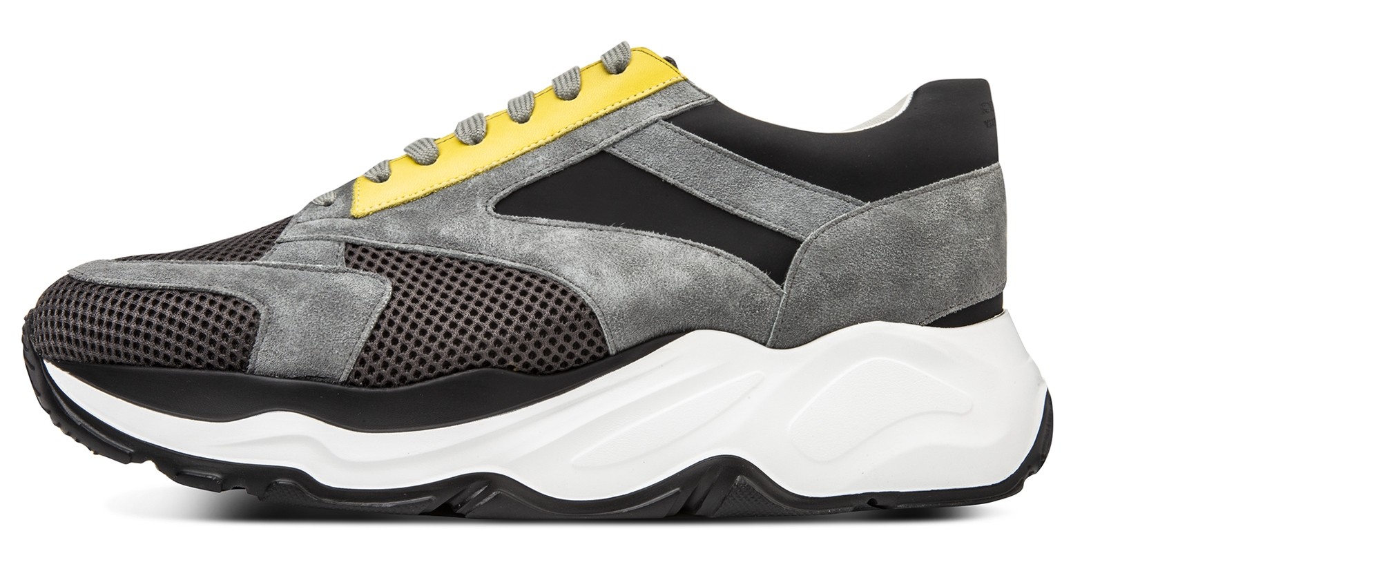 Luxury chunky elevator sneakers with a sophisticated yet casual design made of black rubberized calf leather, yellow calfskin, gray suede and dark gray breathable perforated fabric. The two-tone white/black sole is in extralight rubber.