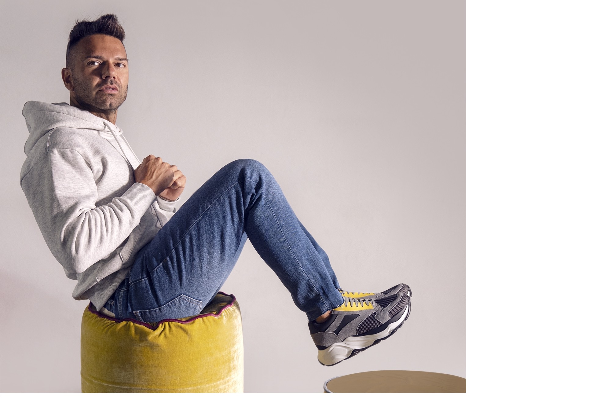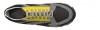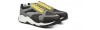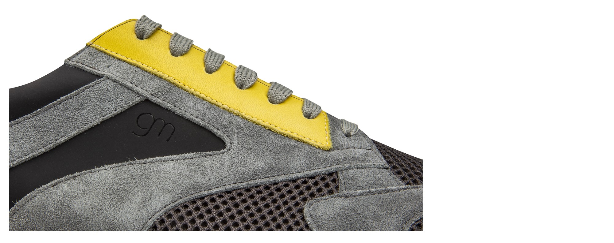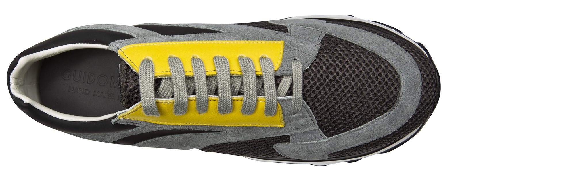 Luxury chunky elevator sneakers with a sophisticated yet casual design made of black rubberized calf leather, yellow calfskin, gray suede and dark gray breathable perforated fabric. The two-tone white/black sole is in extralight rubber.