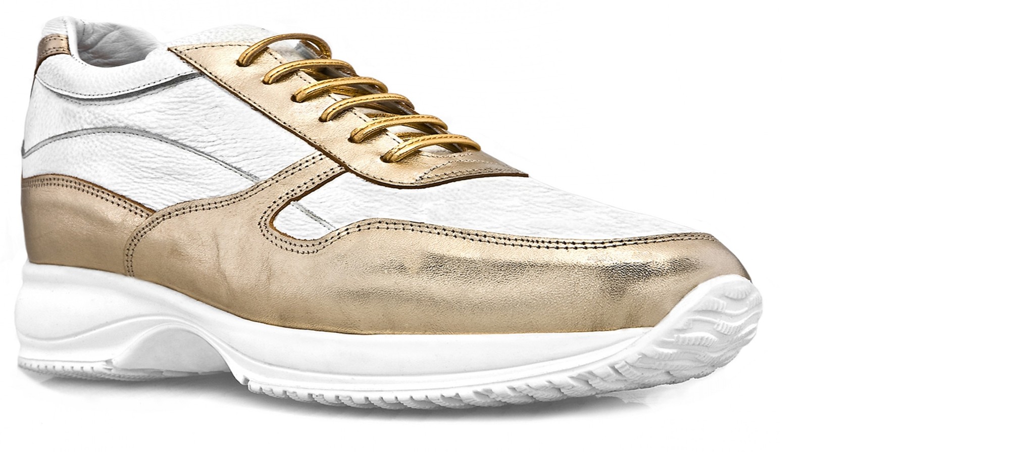 Upper in white full grain leather with details in golden calfskin. Lining in soft goatskin. Insole in genuine leather. Lightweight high quality rubber outsole anti-slip. Height increase: 2.4in(6cm), 2.75in(7cm), 3.1in(8cm) or 4 in(10cm). Hand Made in Italy