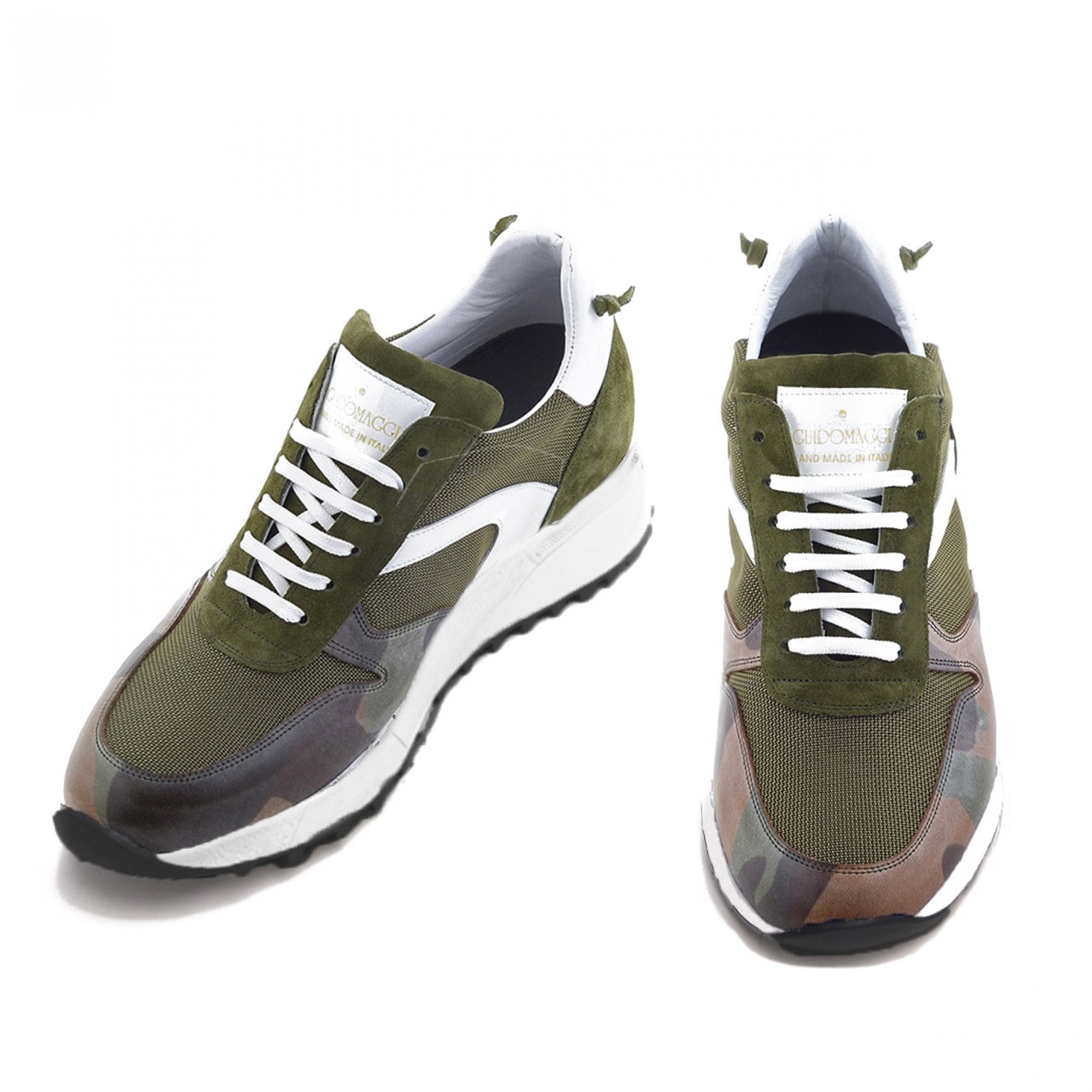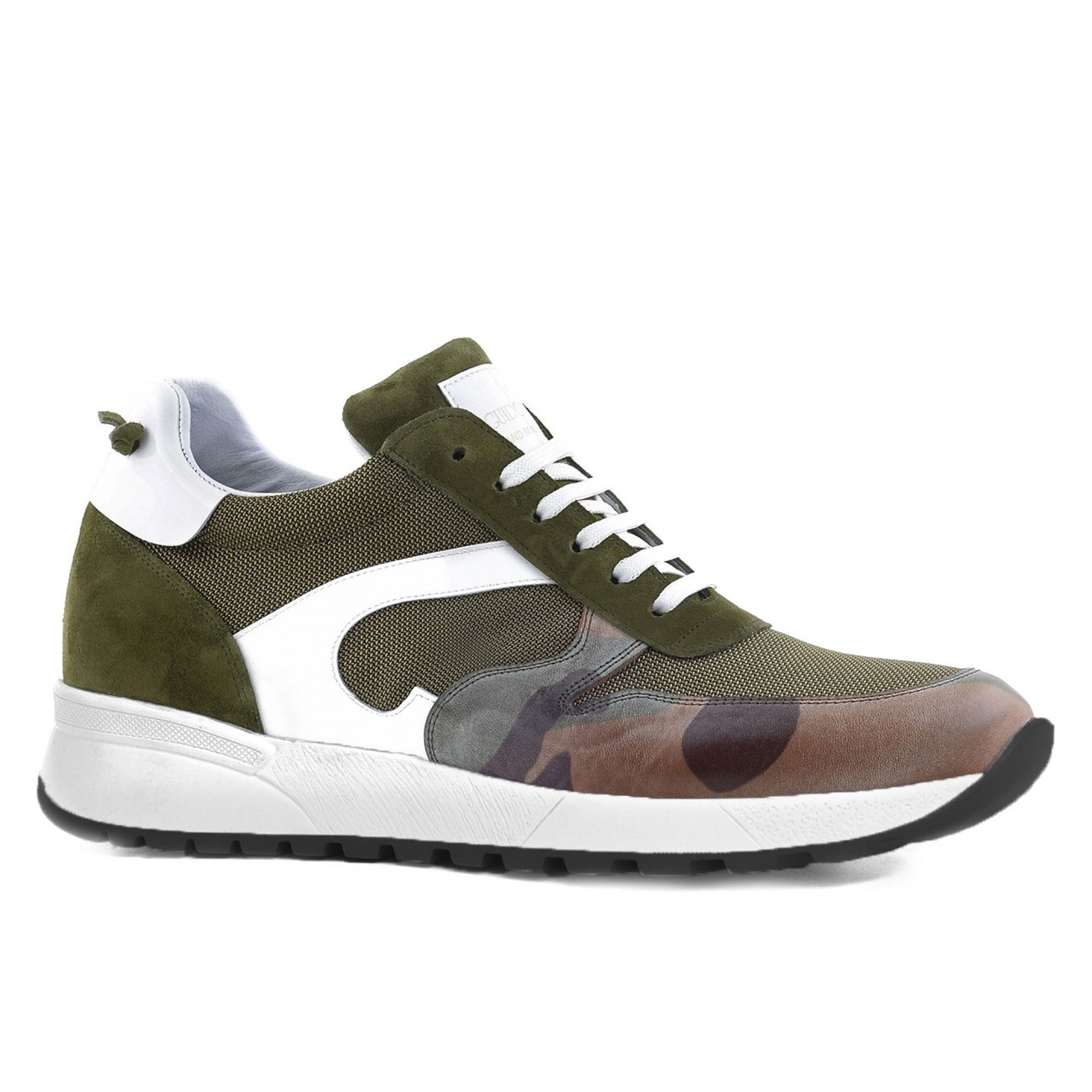 Elevator handcrafted sneakers inspired by the military style made of camouflage calfskin and green suede, military green fabric and patent white details on the sides and heel tab. A ready-to-wear shoe that enhances any outfit, designed for those who want comfort without sacrificing style.