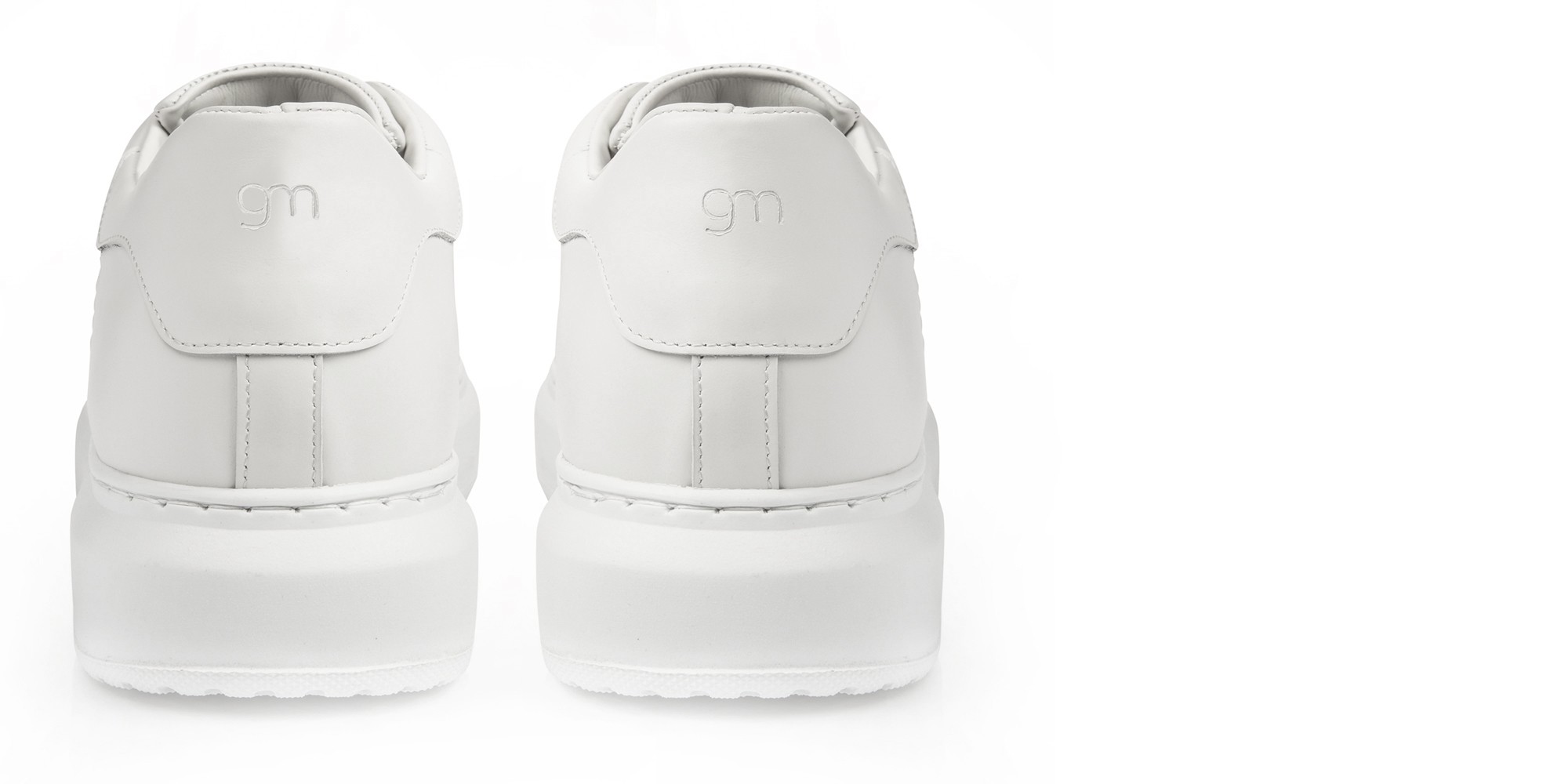 Total white elevator sneakers featuring full-grain leather upper and super-light rubber sole.