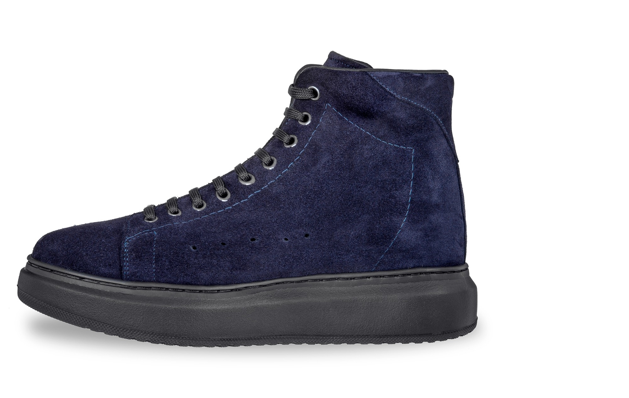 High top sneakers with upper made of blue suede and black sole in super light natural rubber.