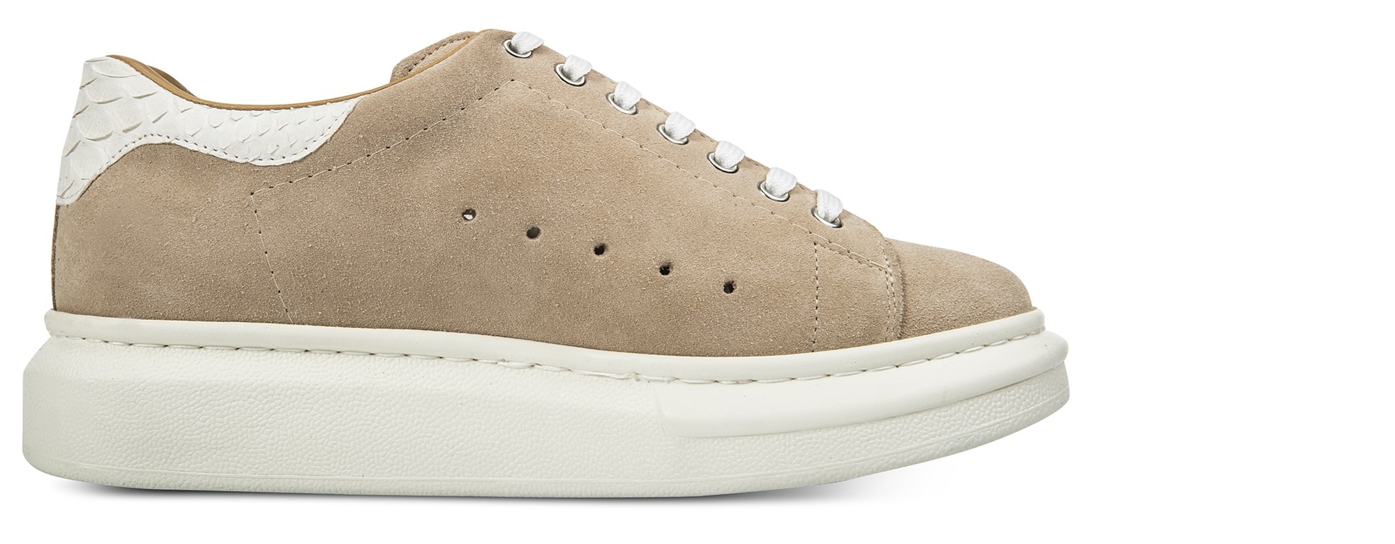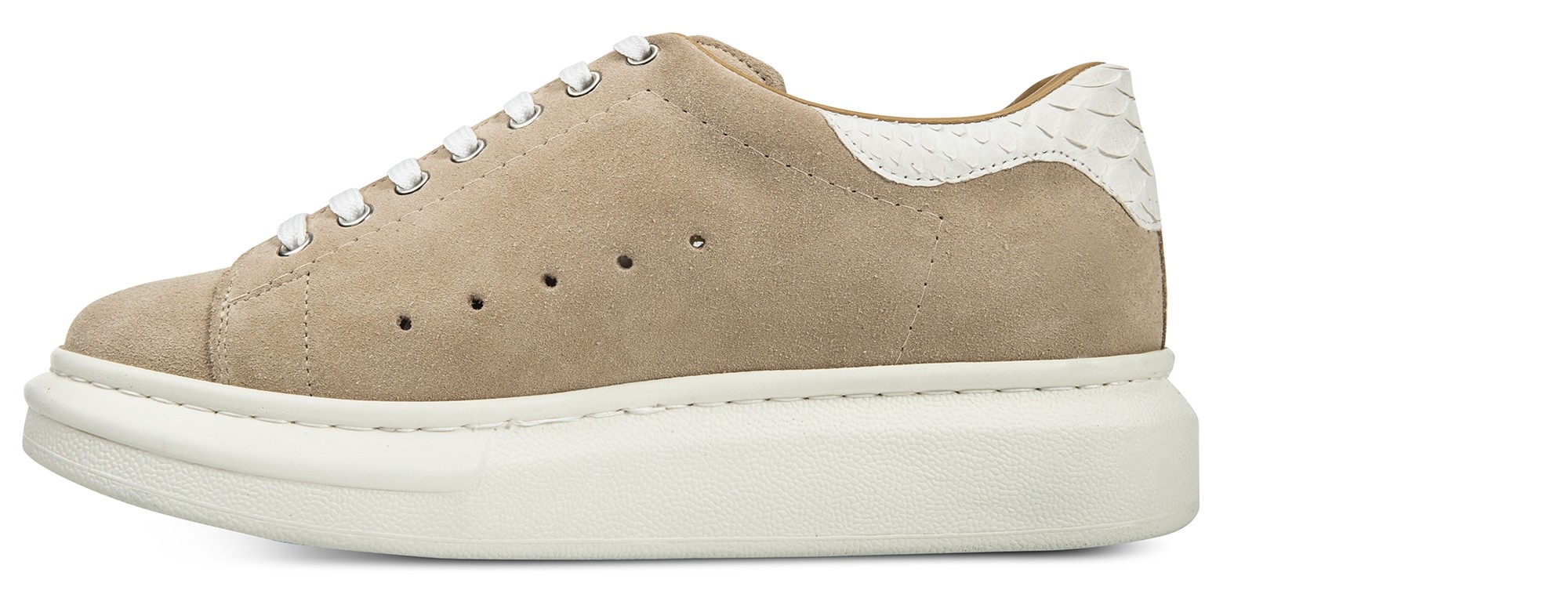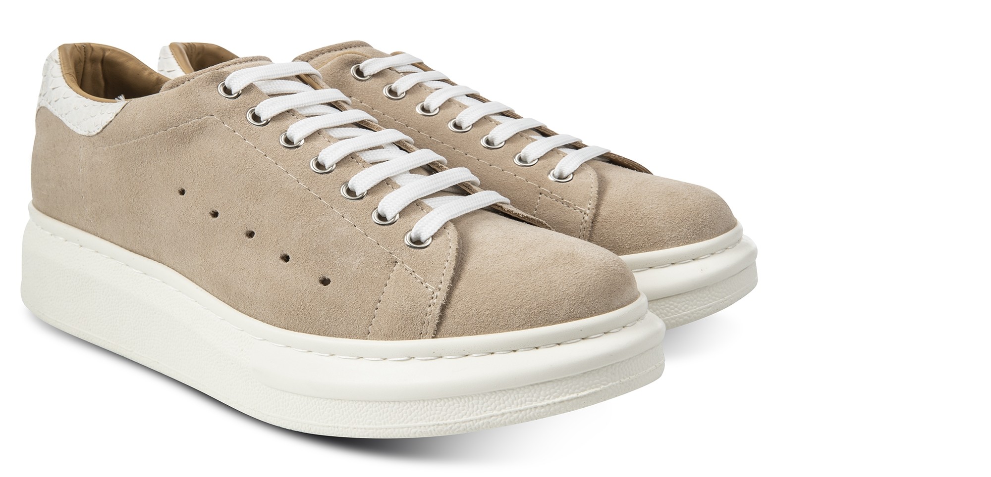 This new elevator sneaker by GuidoMaggi is an elegant reinterpretation of the classic sports shoe. The upper is in soft beige suede, embellished by the heel tab in fine genuine python leather. The sole is cream coloured with matching laces. The model offers up to 3.1" (8 cm) of extra height, thanks to an elevator system that slims the silhouette and supports the feet, ensuring maximum comfort. Sporty chic and incredible versatile, this model is suitable for all seasonal casual looks. Handmade in Italy