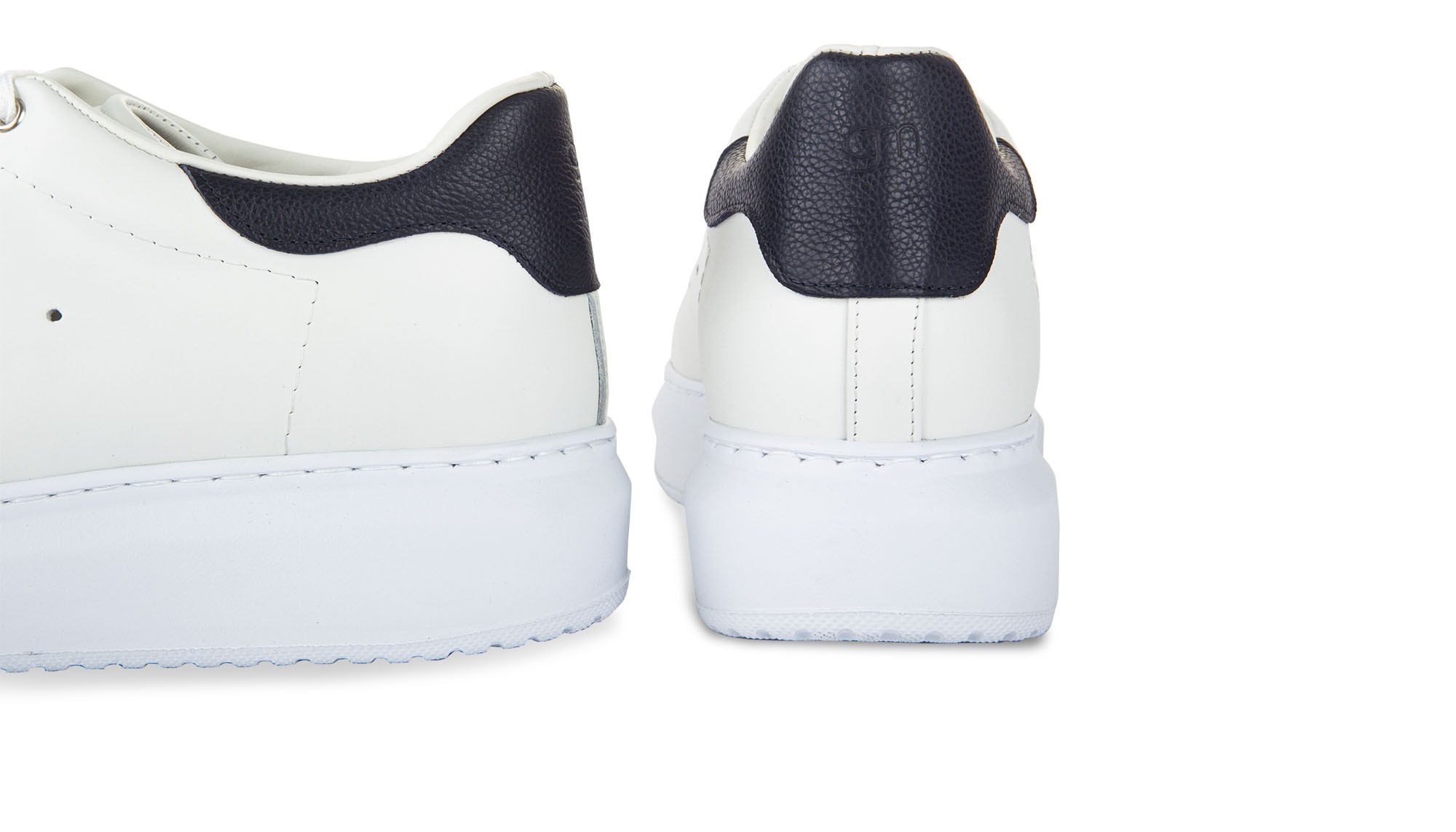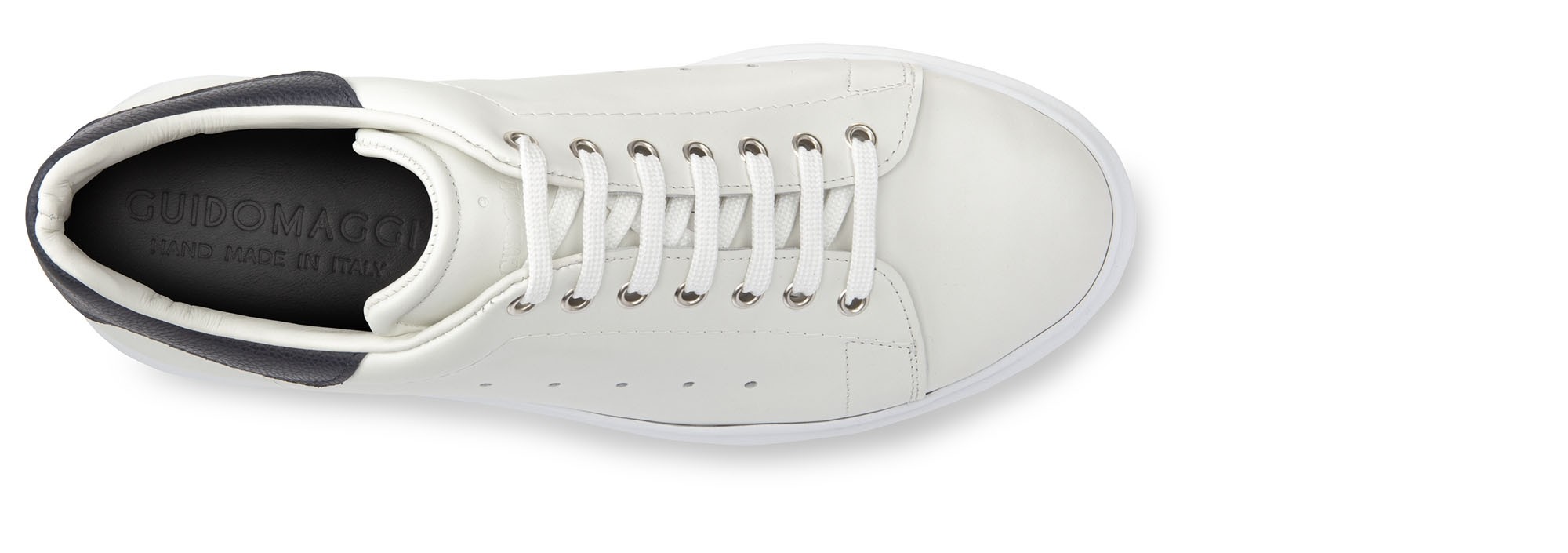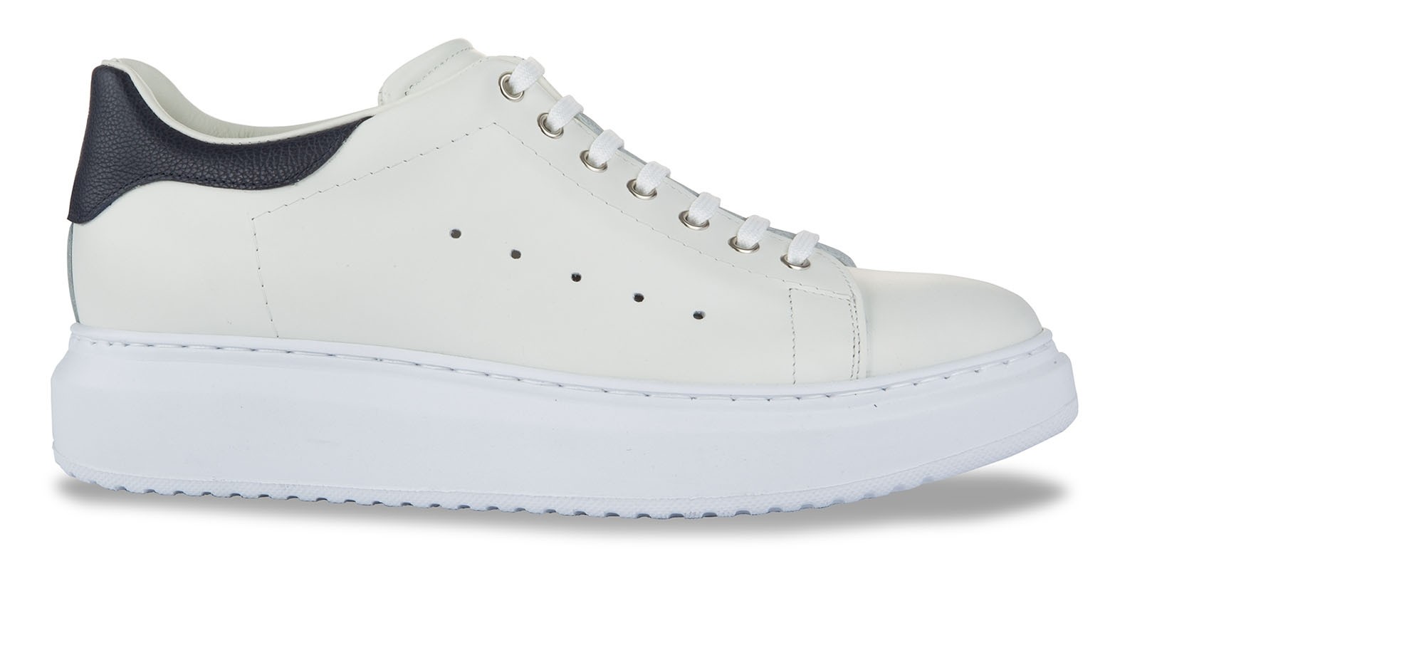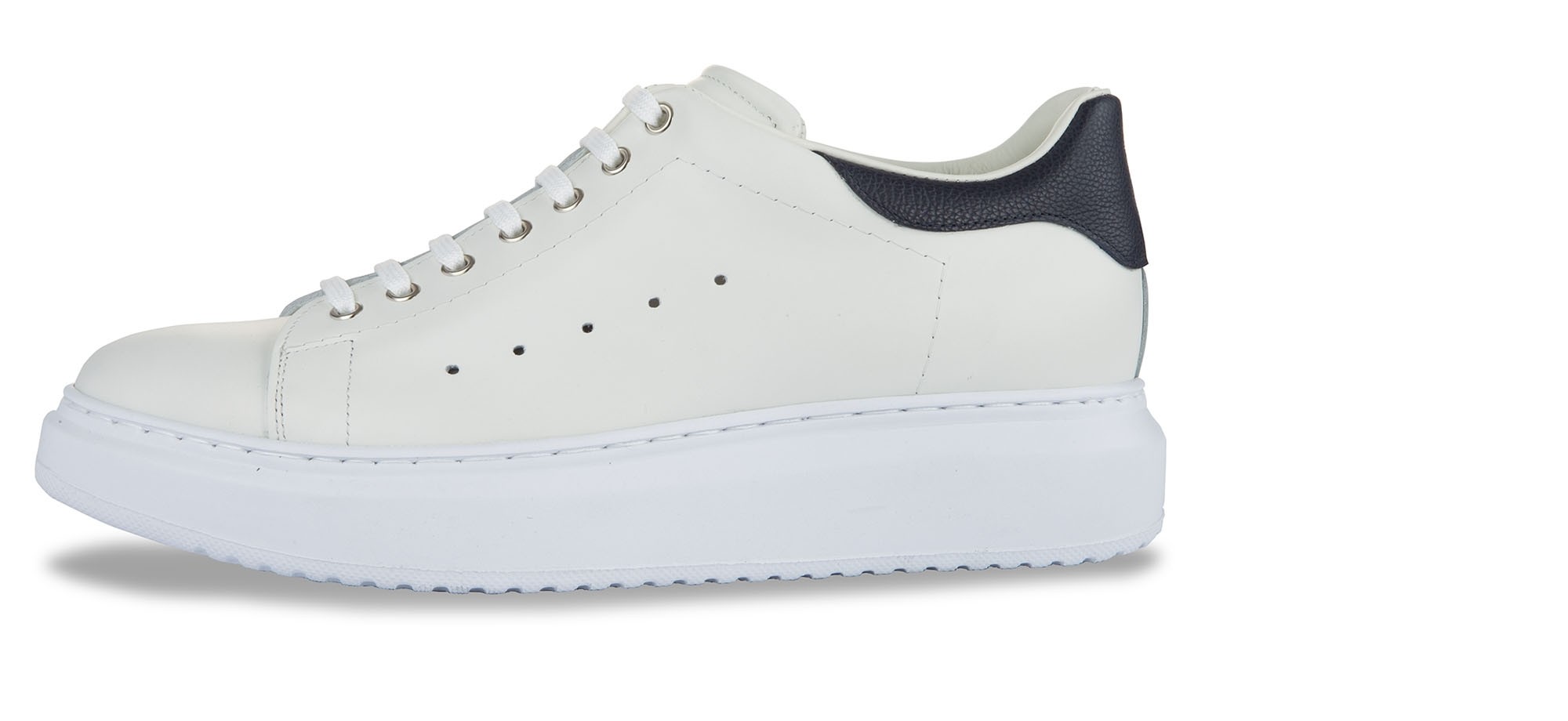 Luxury low-top sneakers able to increase height from 2.4 (6 cm) to 3.1 inches (8 cm). The soft upper is in full grain leather enhanced by the blue calfskin detail on the heel tab. The white sole is made of natural rubber.