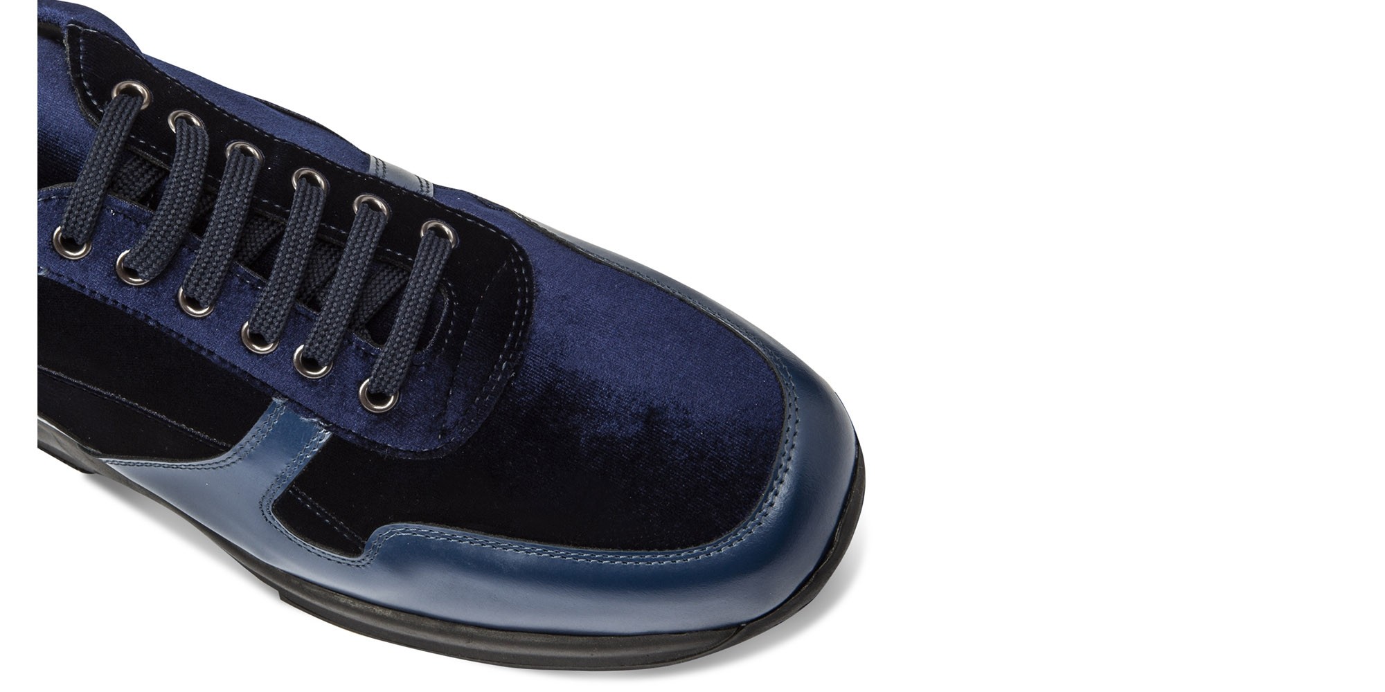 Handcrafted elevator sneakers with upper made of soft dark blue velvet and tone-on-tone shiny calfskin. The black sole is made of super-light natural rubber.