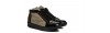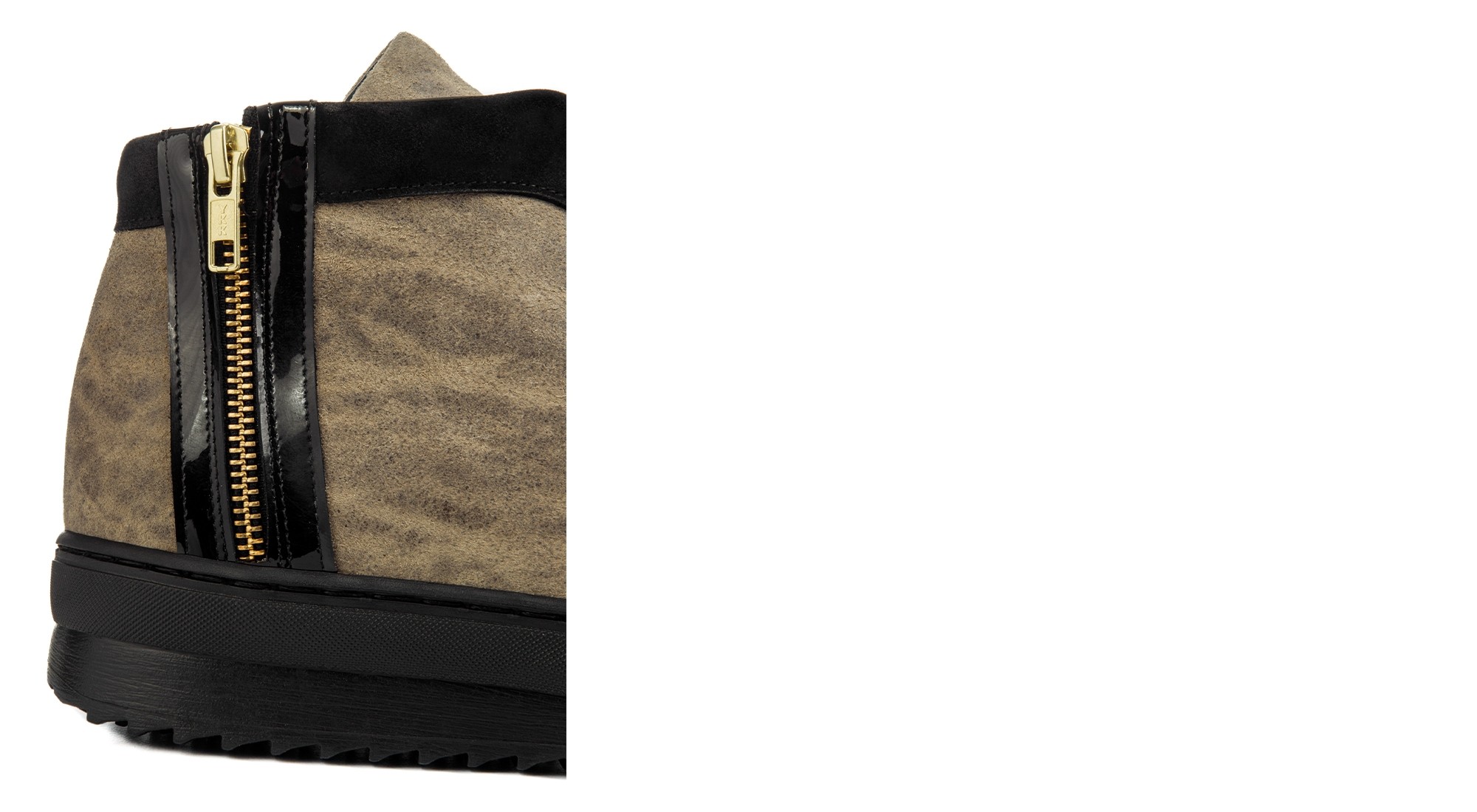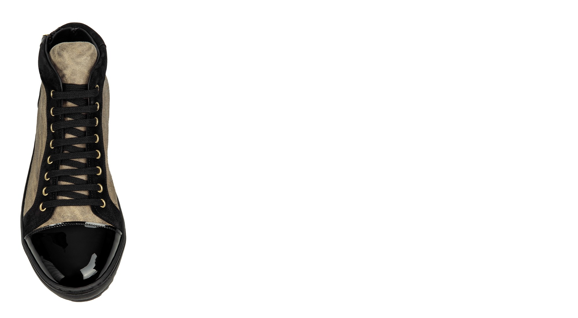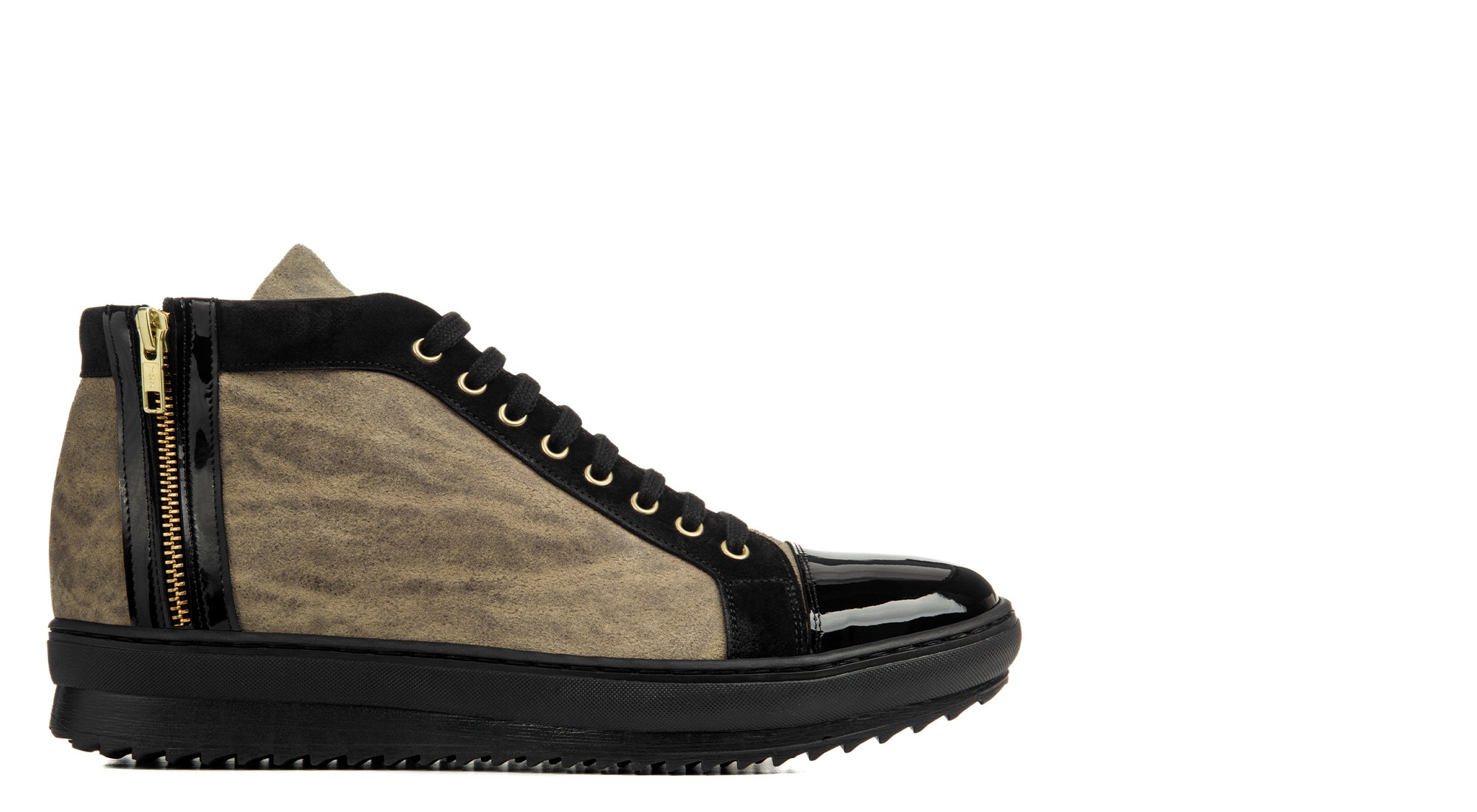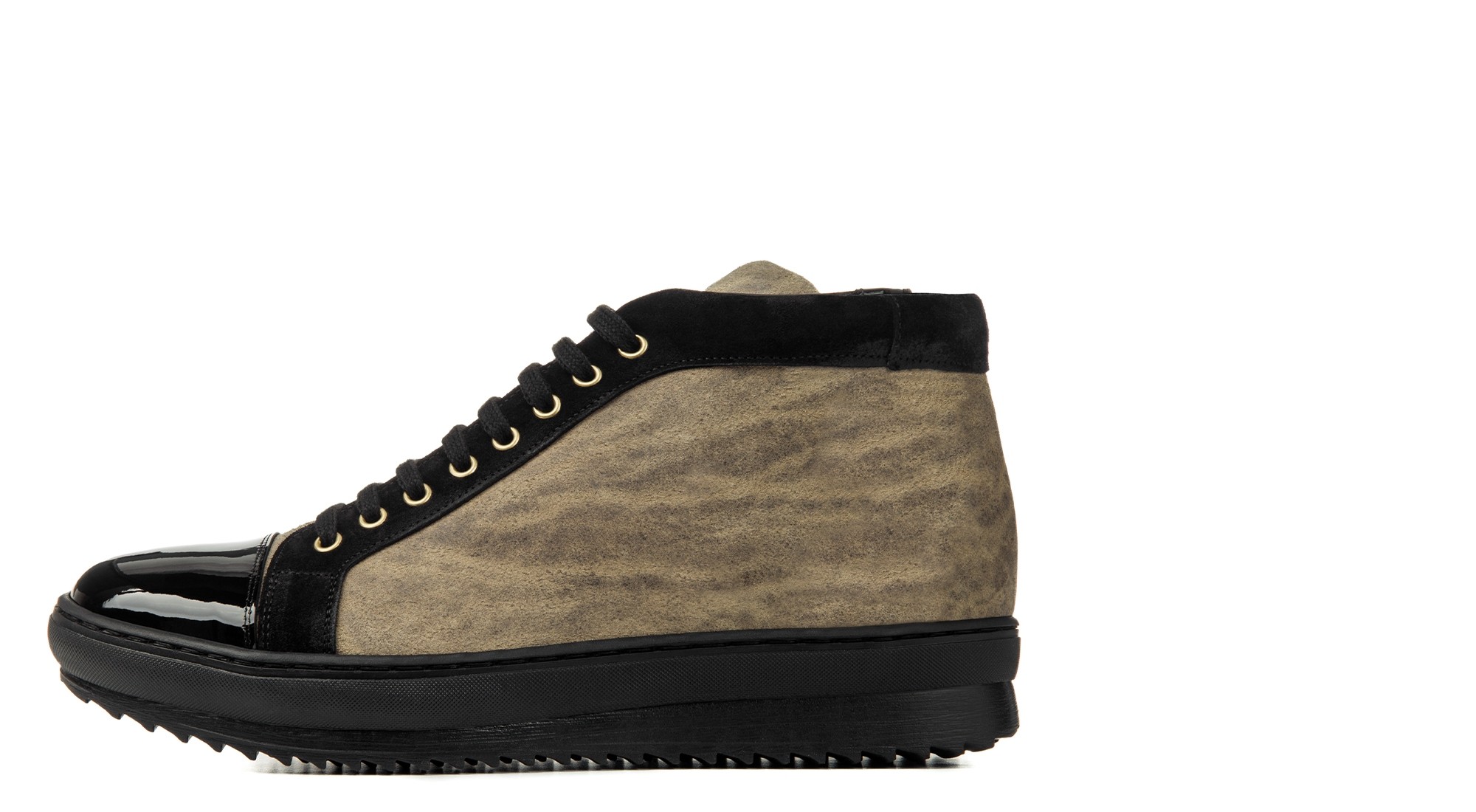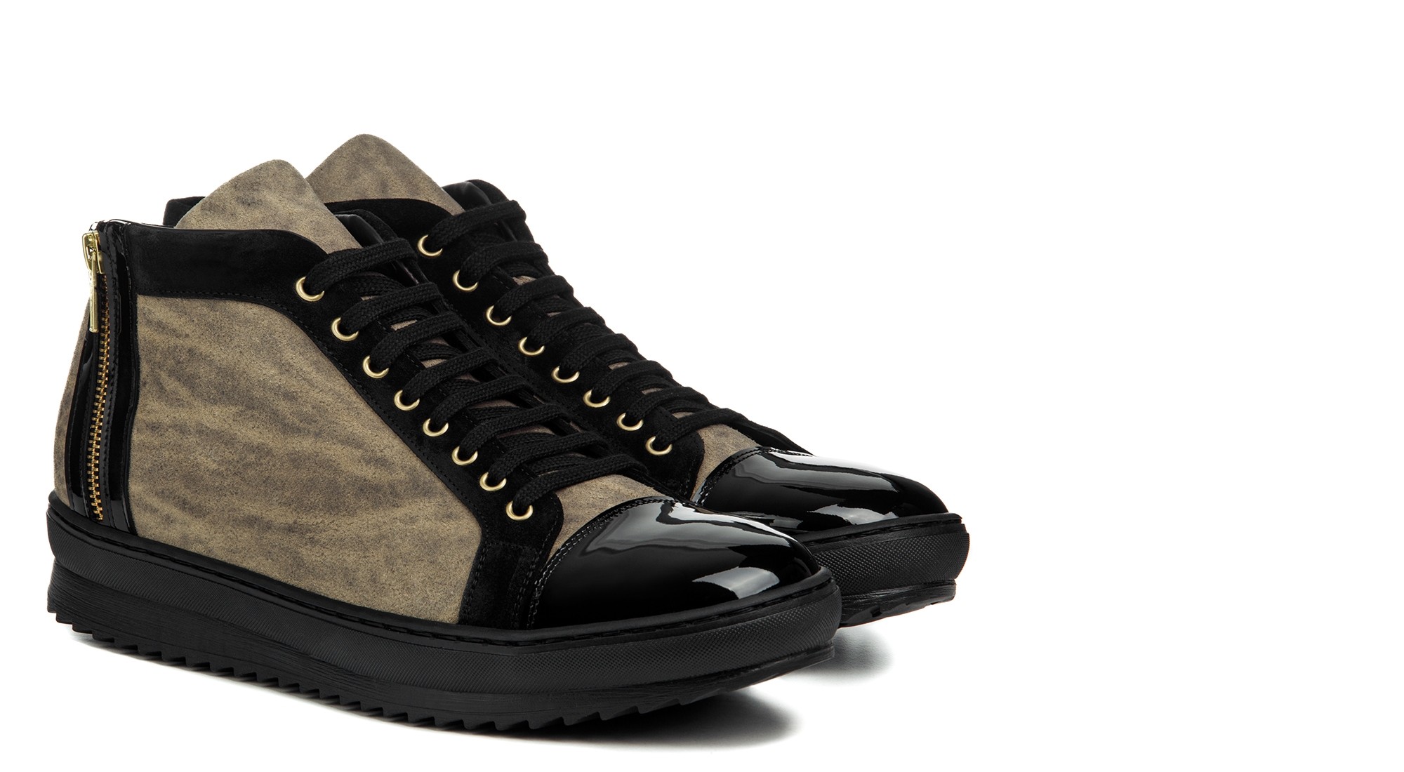 Mid Top sneakers featuring a vintage effect cordovan leather upper with shades of green and grey. Elegant details include a black patent toe cap and lace quarters, with gold zipper and eyelets.