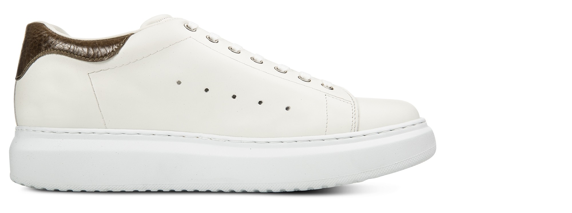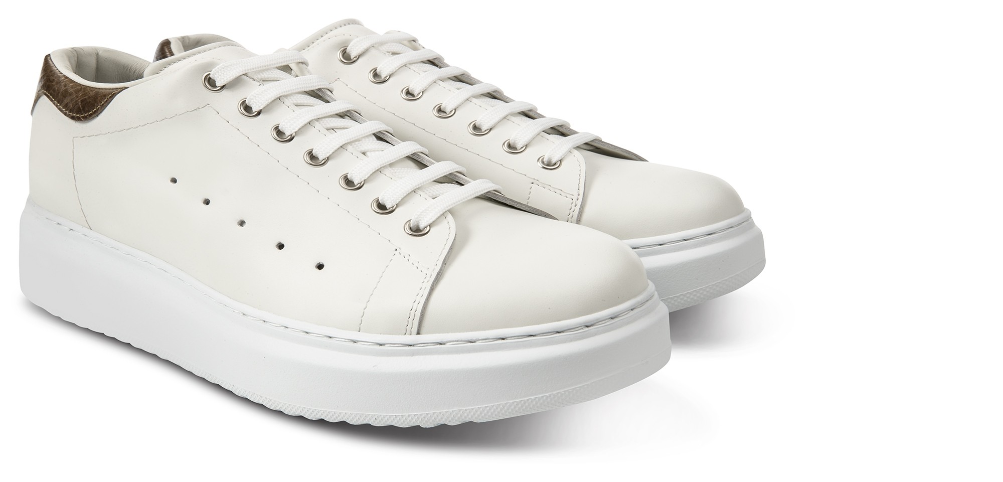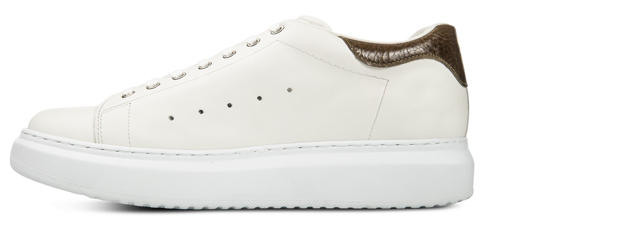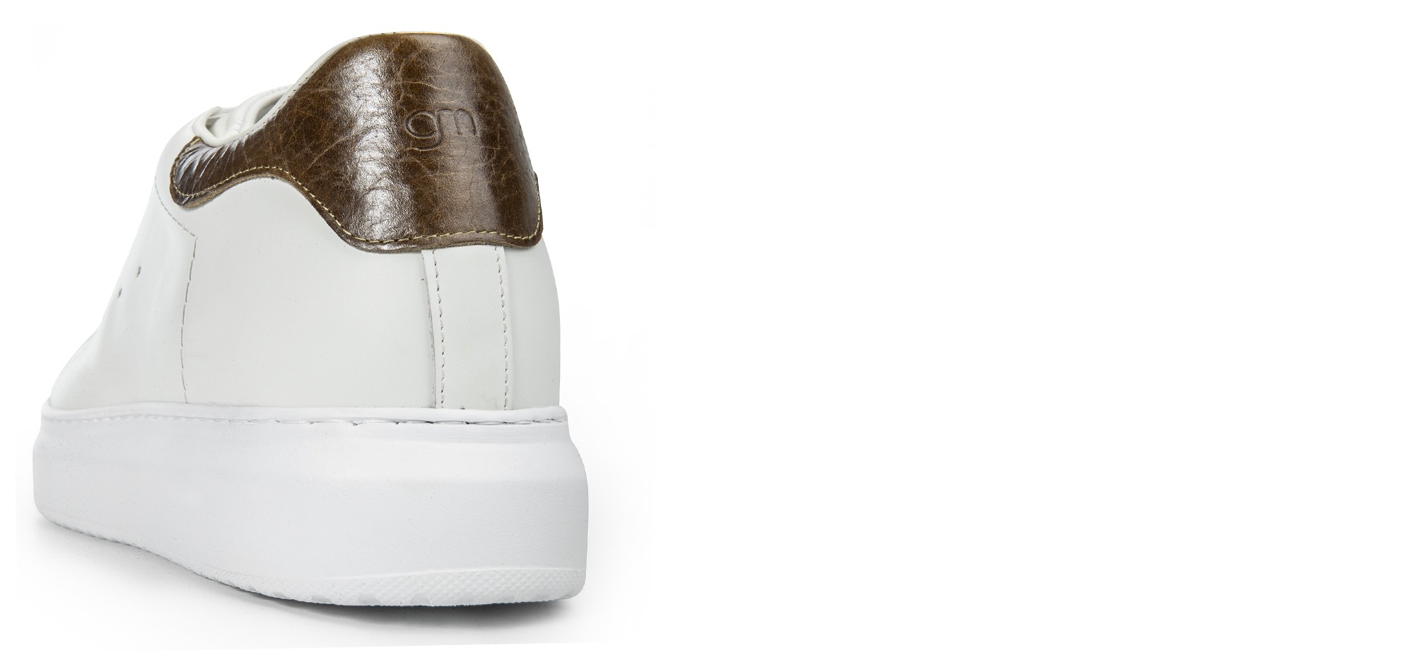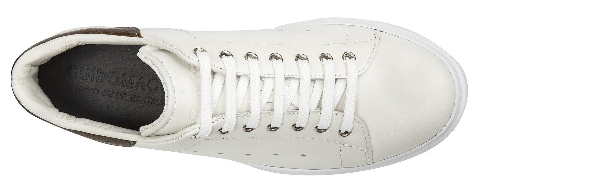 Soft lines and an all-Italian style for the elevator sneakers by GuidoMaggi: a celebration of the most exclusive sporty-chic, this new model features an upper in white full-grain leather and dark green nappa leather heall tab with an exclusive washed effect. The sole is in natural rubber. Trendy and comfortable at the same time, the shoe is perfect on all seasonal casual outfits and adds up to 3.1 inches (8 cm) of extra height. 100% made in Italy.
