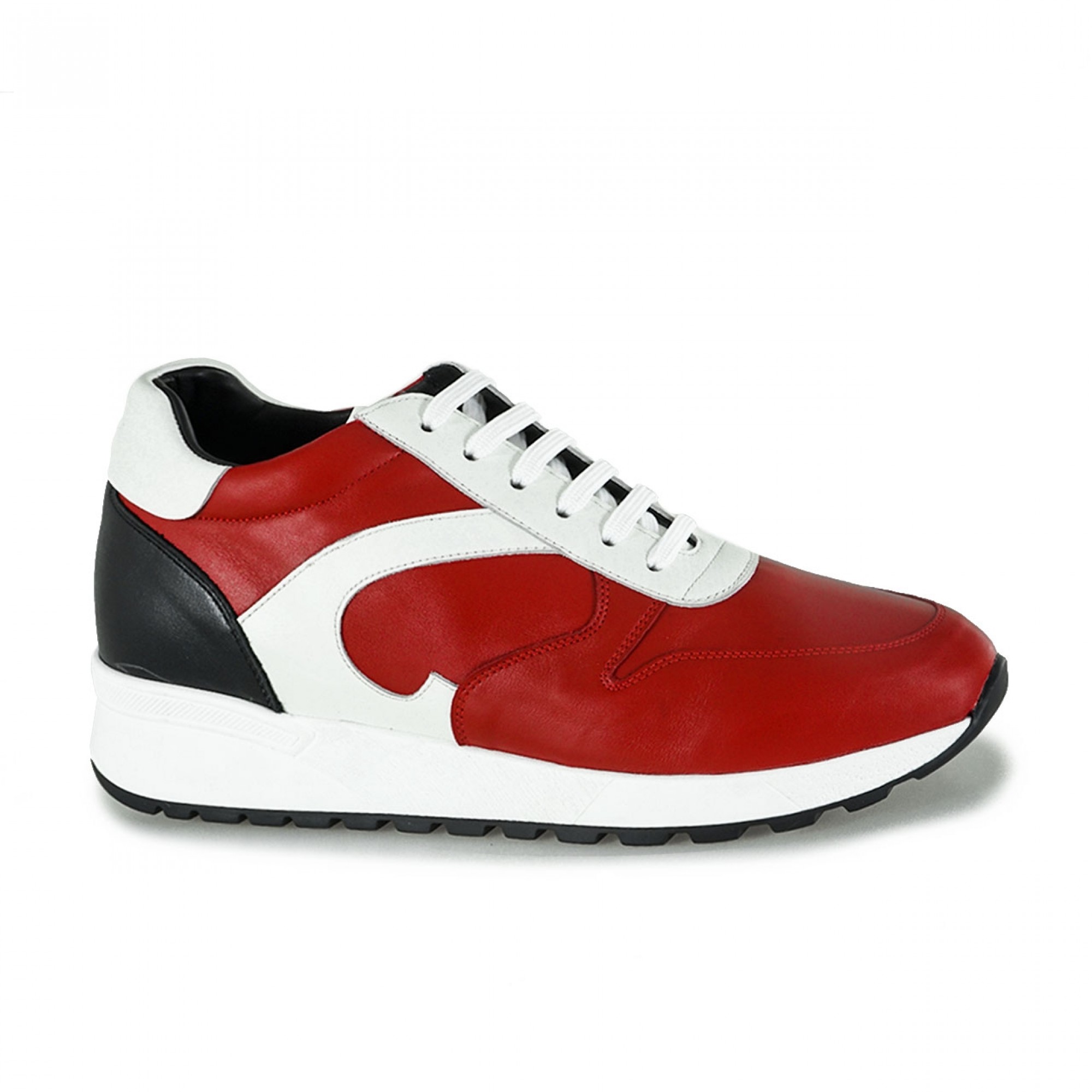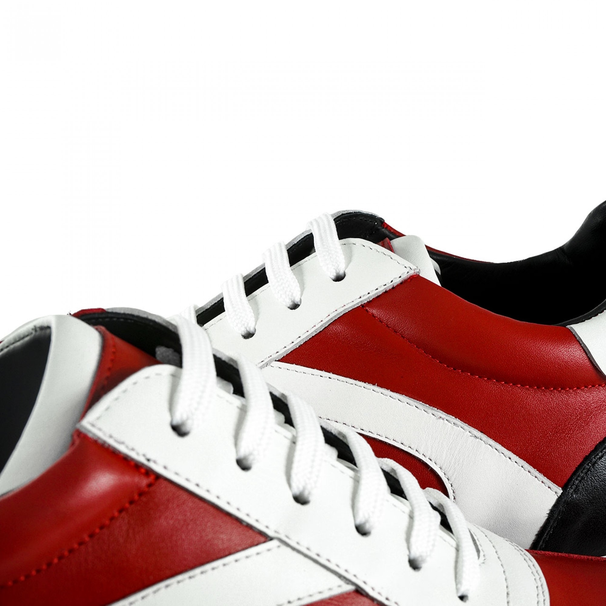 Back to the 90s: elevator sneakers with upper in red, white and black calf leather and ultra-light rubber sole. The design and the colours combination reinterpret the iconic models of the 90s in a modern key.